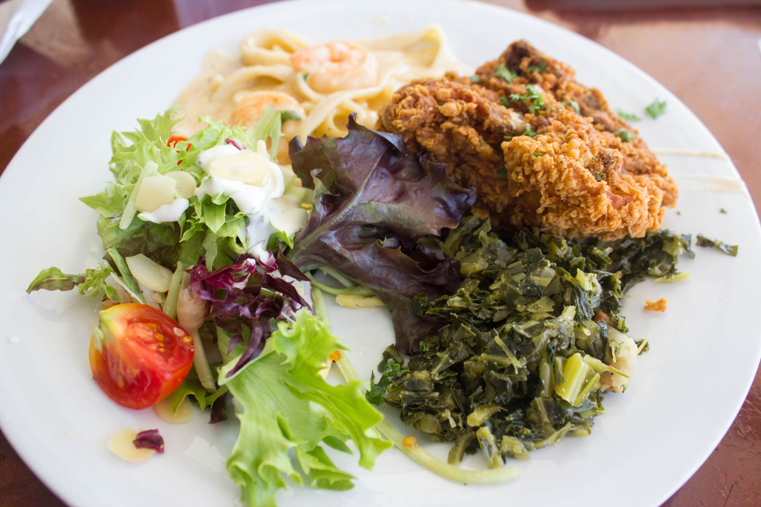 We walked in on a special day, Buffet Day. Once we had placed our drink orders, we were encouraged to help ourselves to an impressive lineup: golden brown fried chicken, shrimp fettuccine, gumbo, soulful collard greens, Asian green salad, and warm peach cobbler.