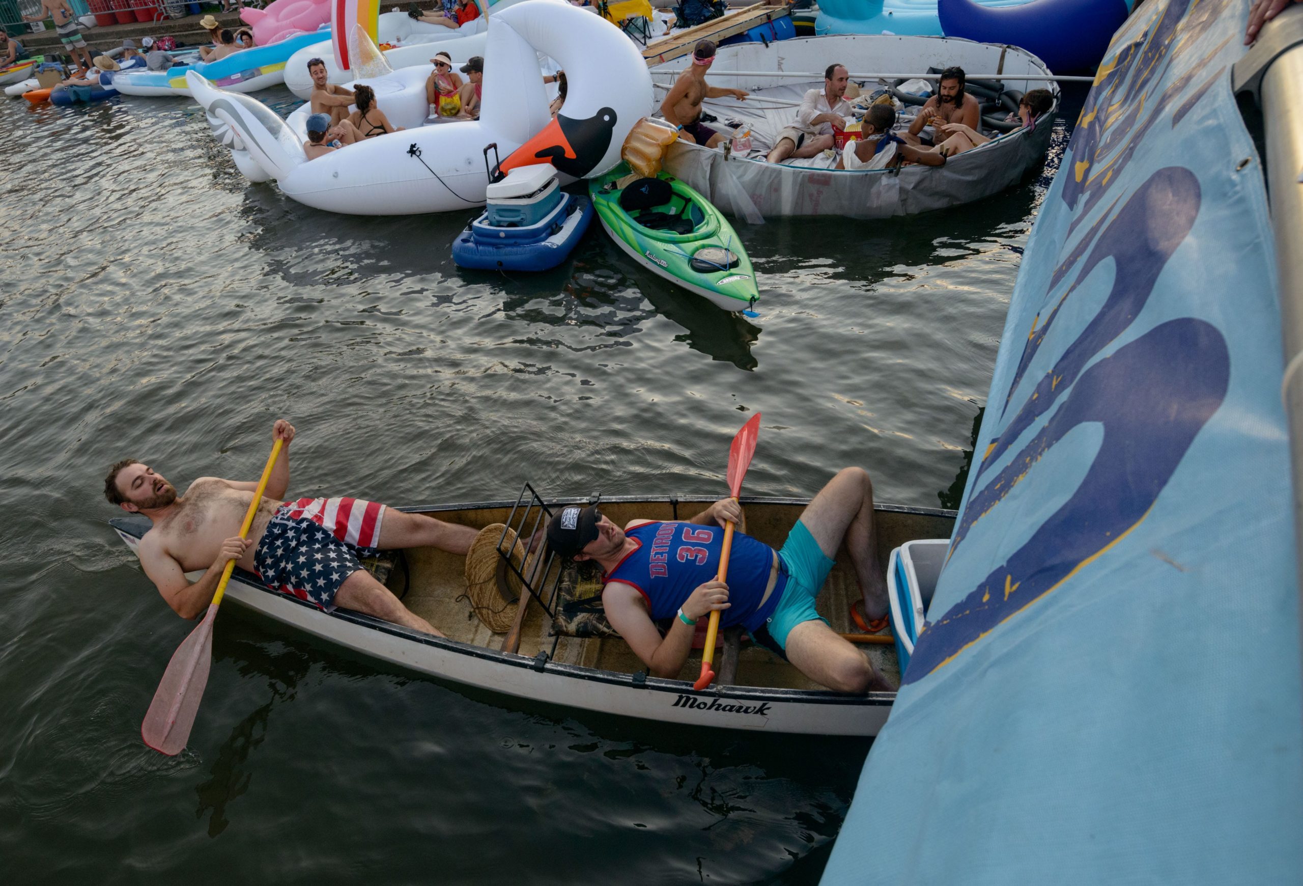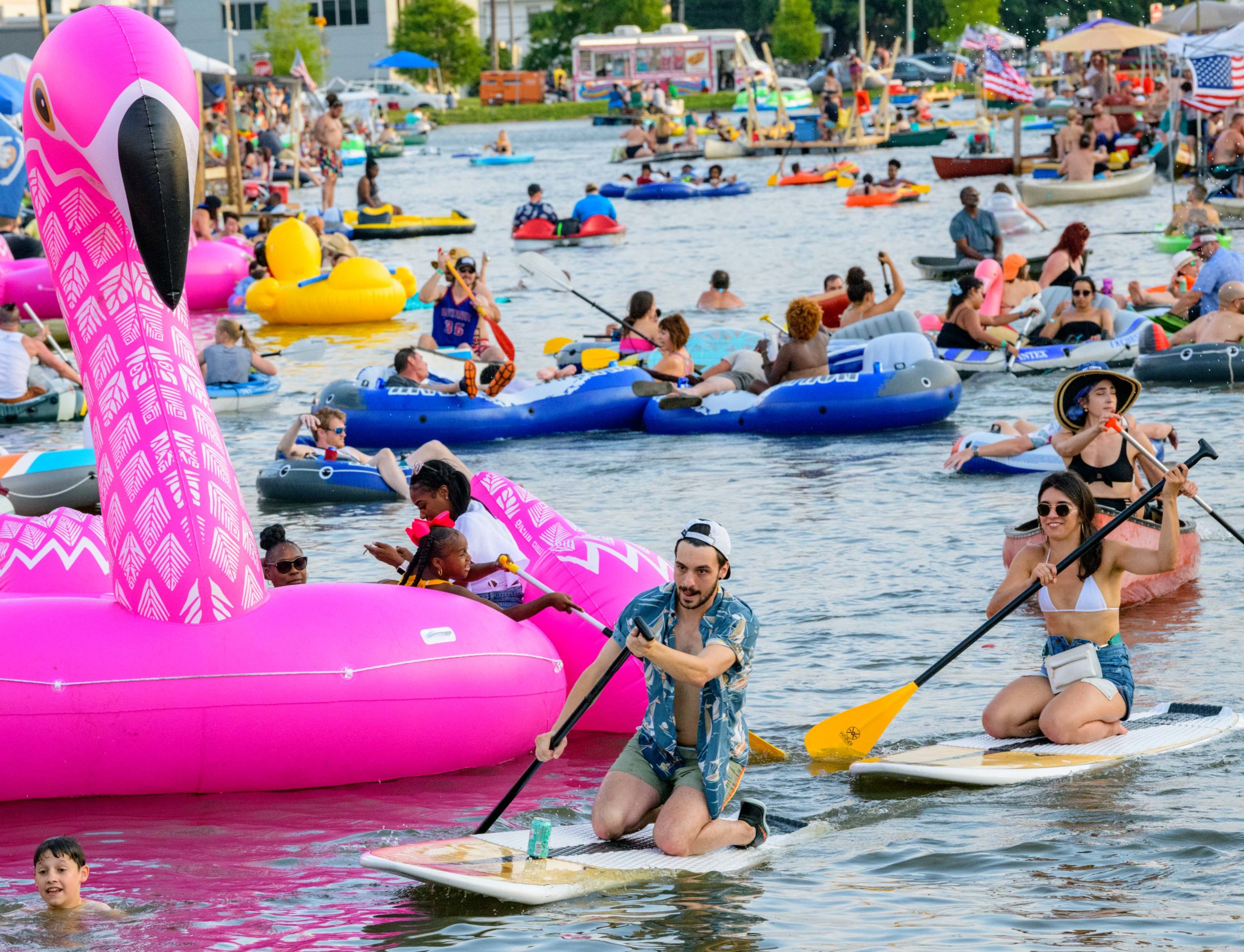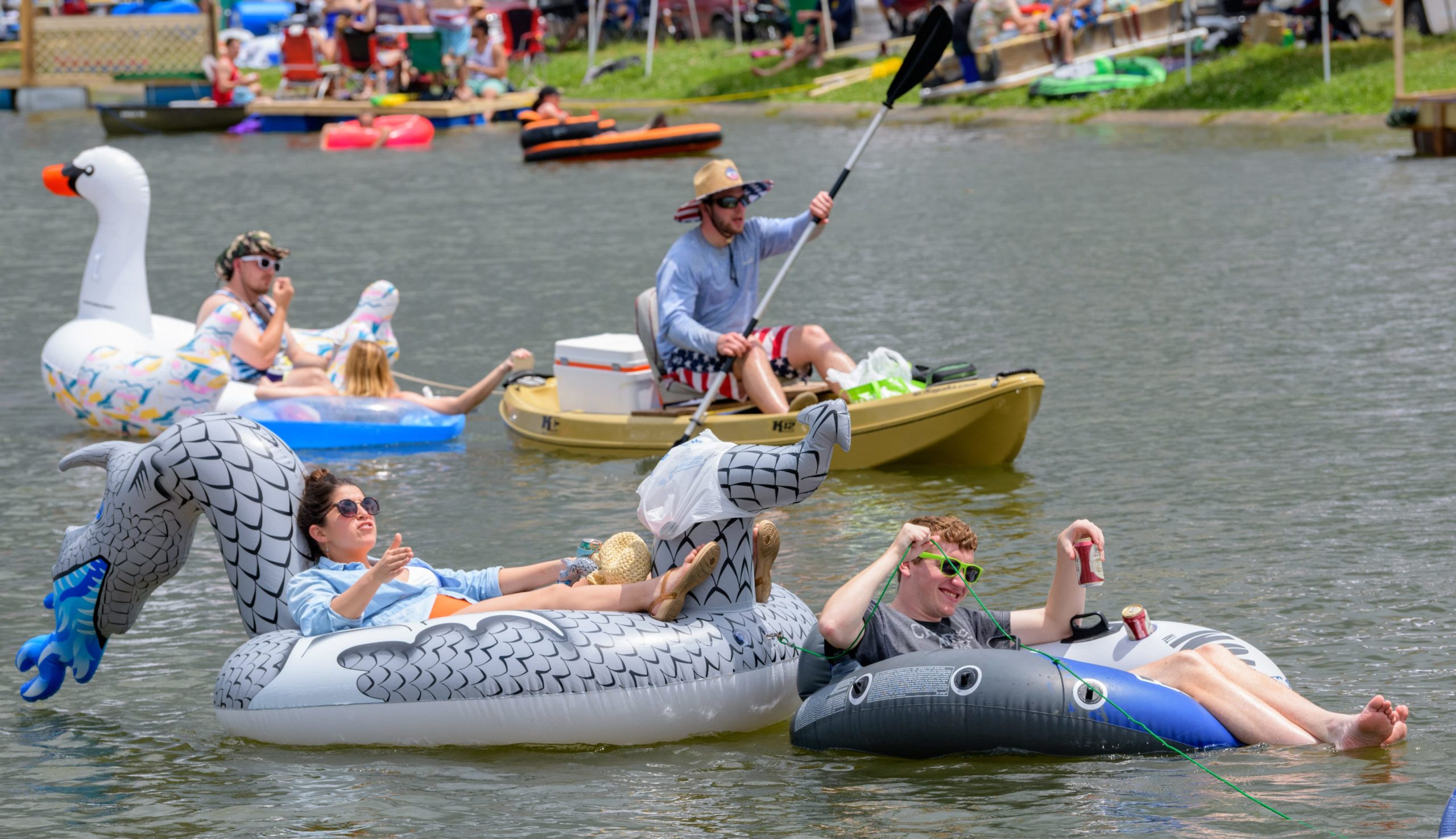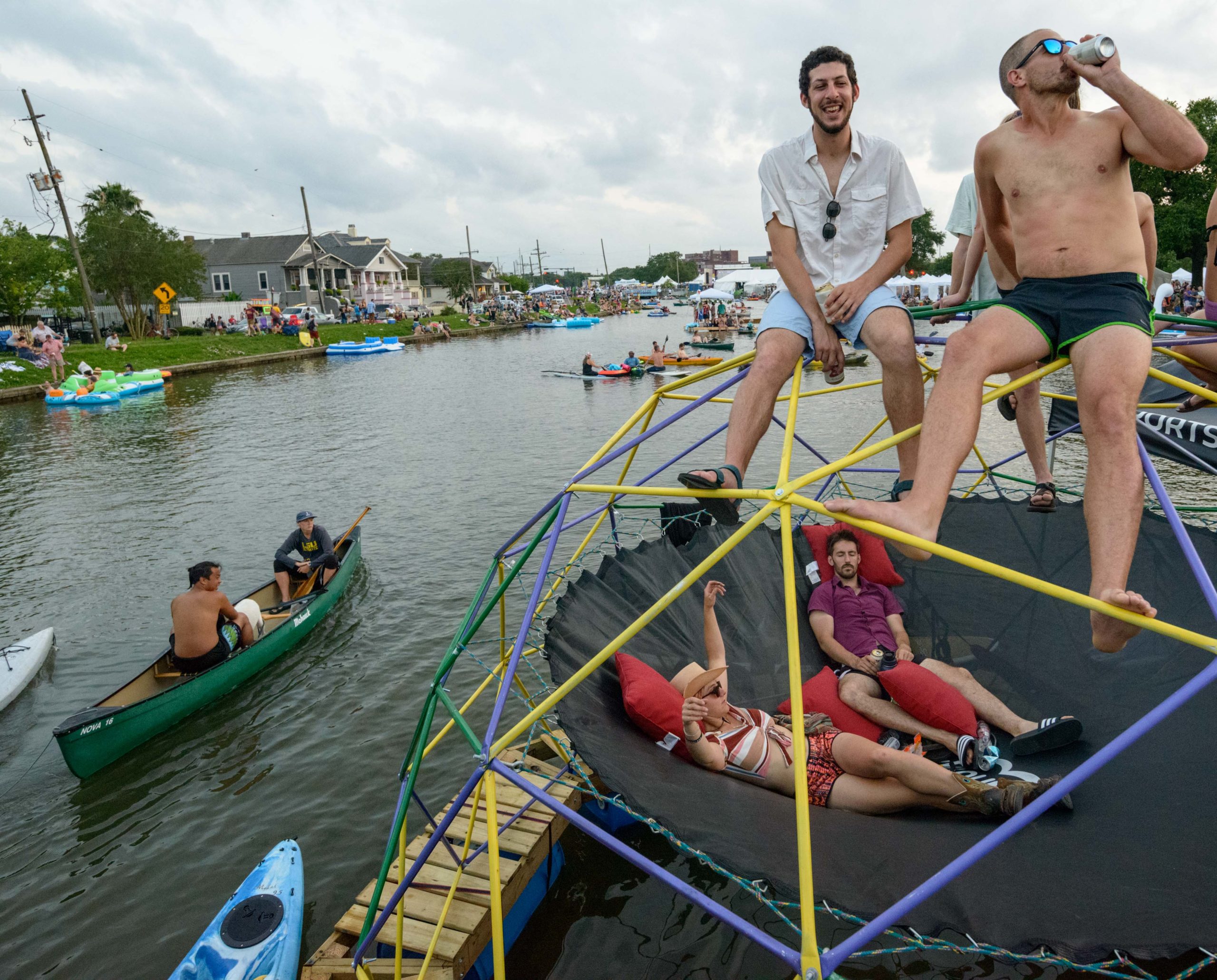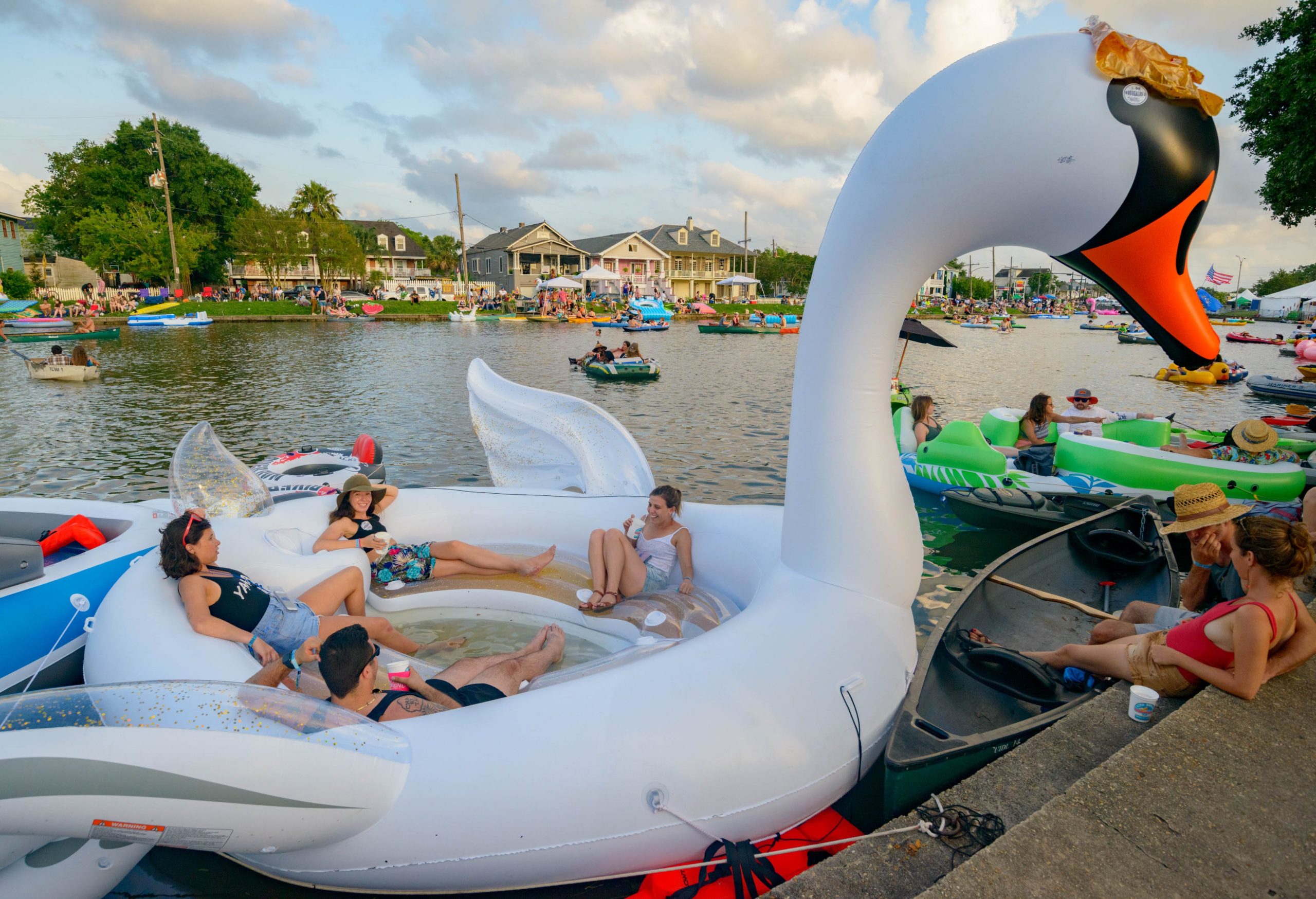 People float on Bayou St. John during the Mid-City Bayou Boogaloo in New Orleans, La. Saturday, May 18, 2019. Described as a mini-Jazz Fest the now three day festival features New Orleans music, art, cuisine and culture. The event was created in 2006 to reinvigorate the Mid City neighborhood after Hurricane Katrina. Photo by Matthew Hinton