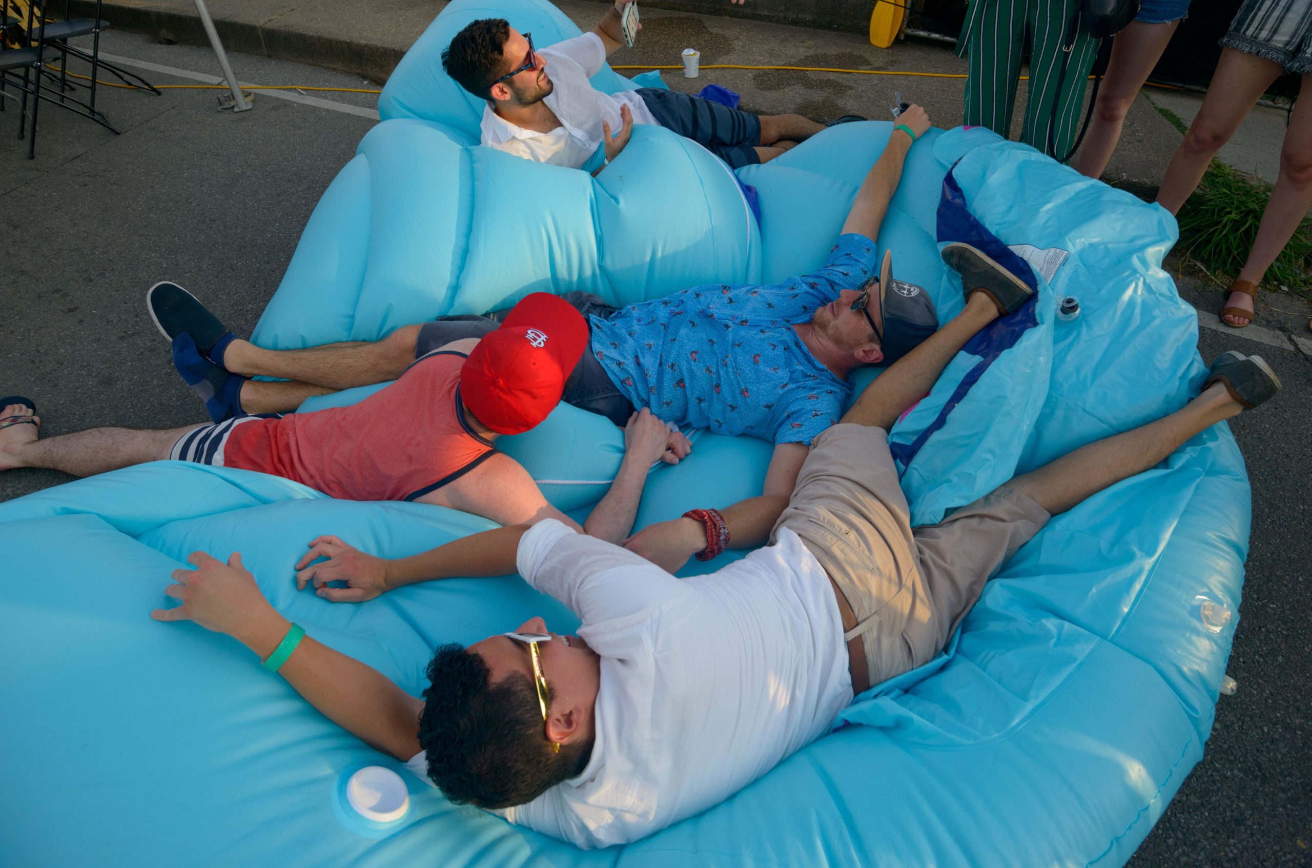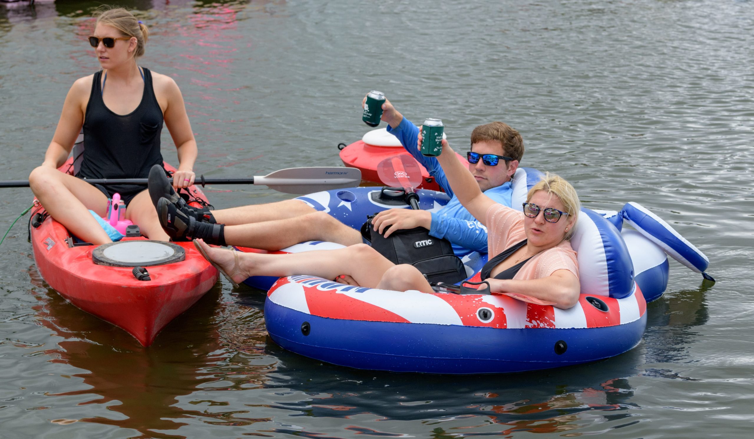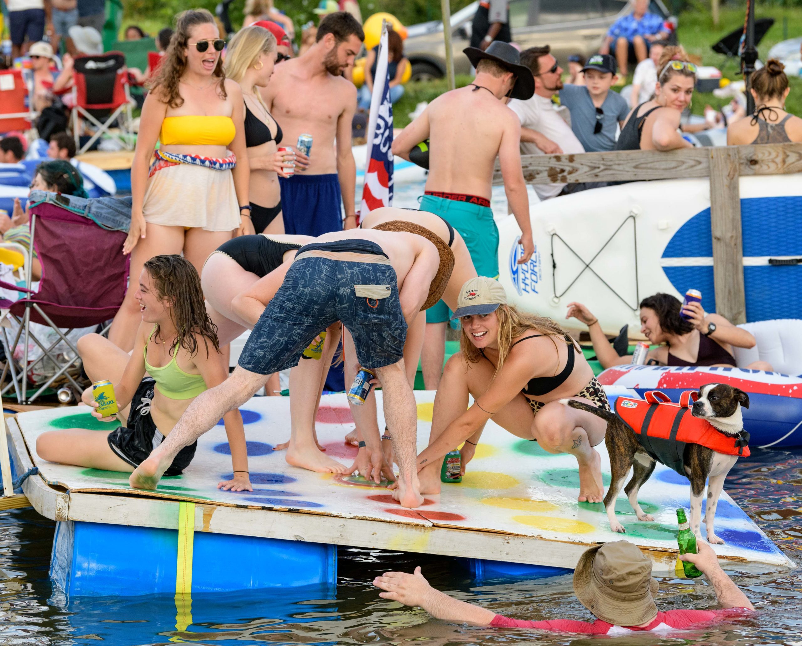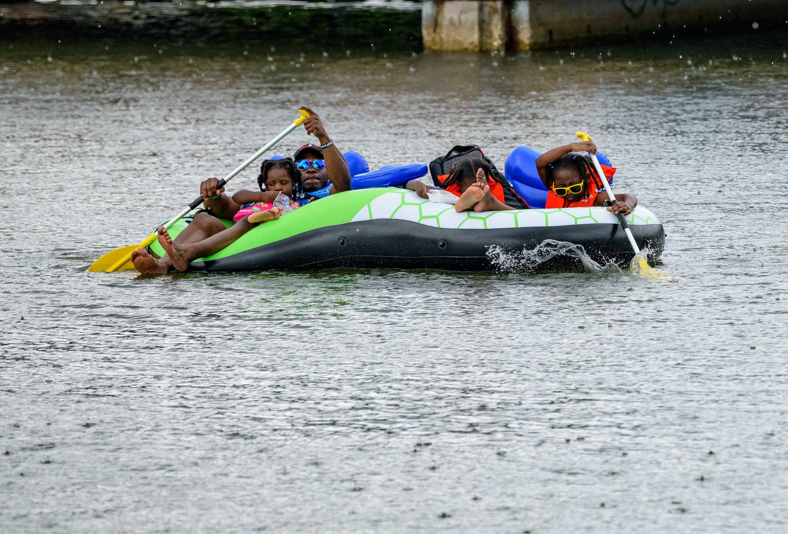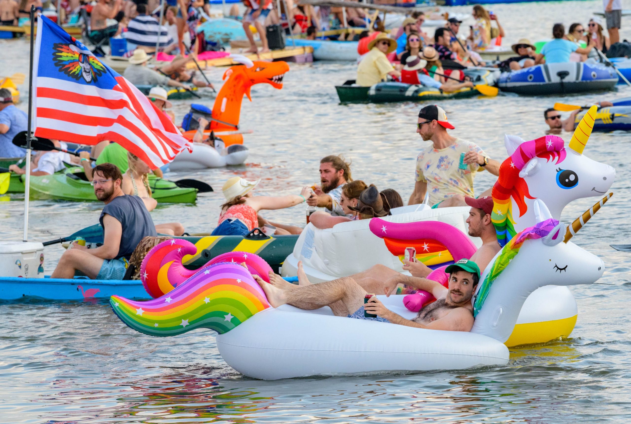 People float on Bayou St. John during the Mid-City Bayou Boogaloo in New Orleans, La. Saturday, May 18, 2019. Described as a mini-Jazz Fest the now three day festival features New Orleans music, art, cuisine and culture. The event was created in 2006 to reinvigorate the Mid City neighborhood after Hurricane Katrina. Photo by Matthew Hinton