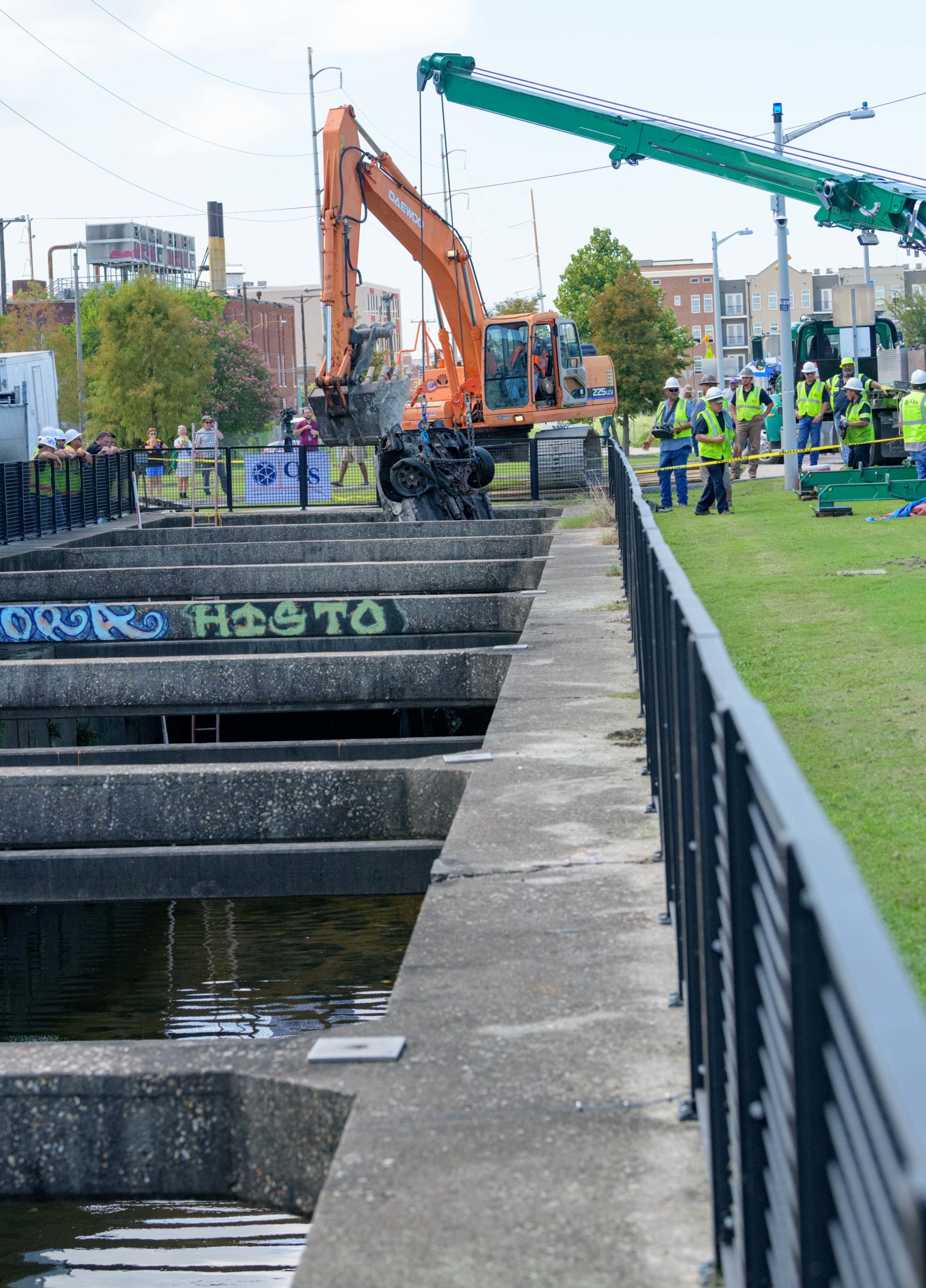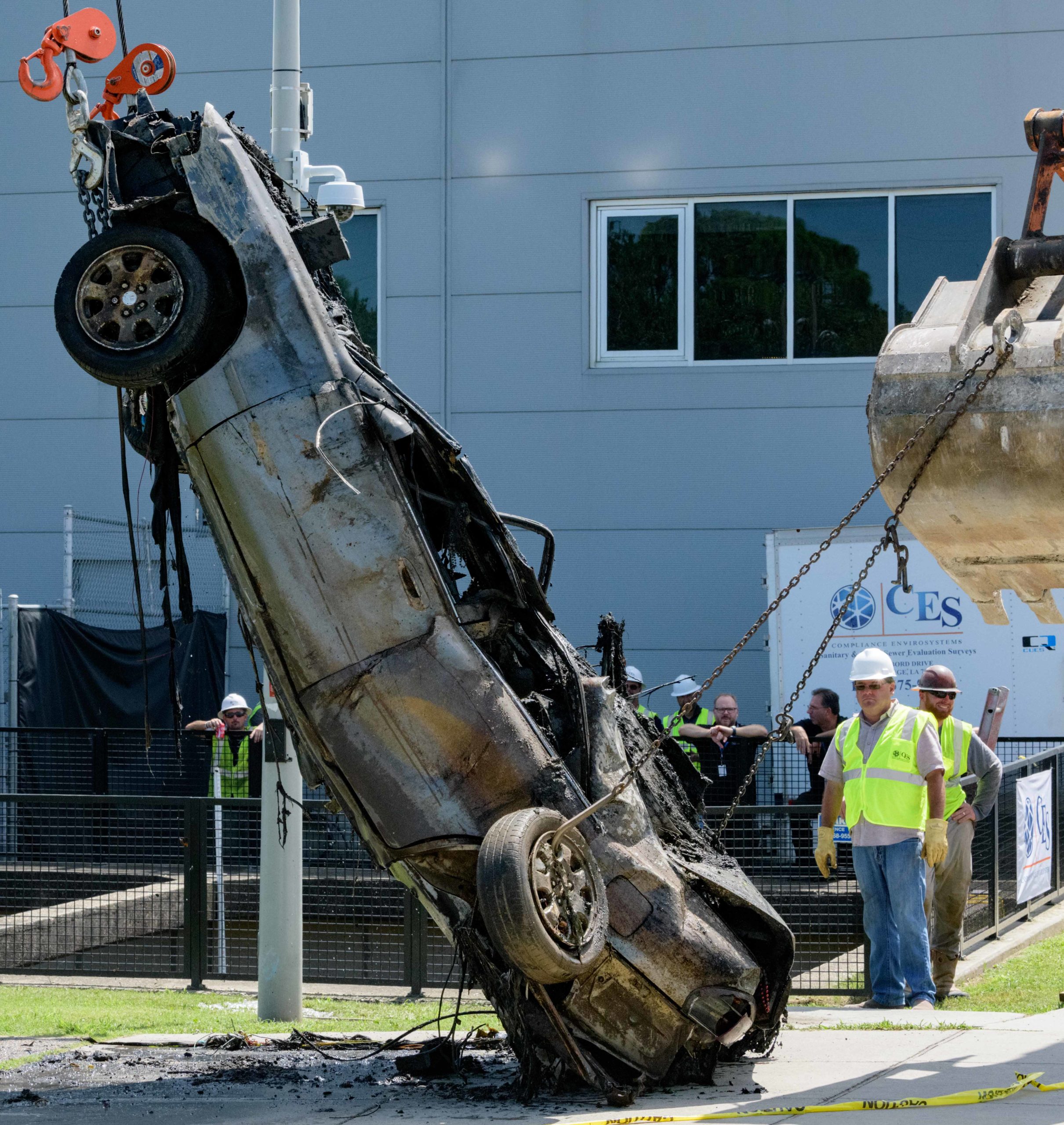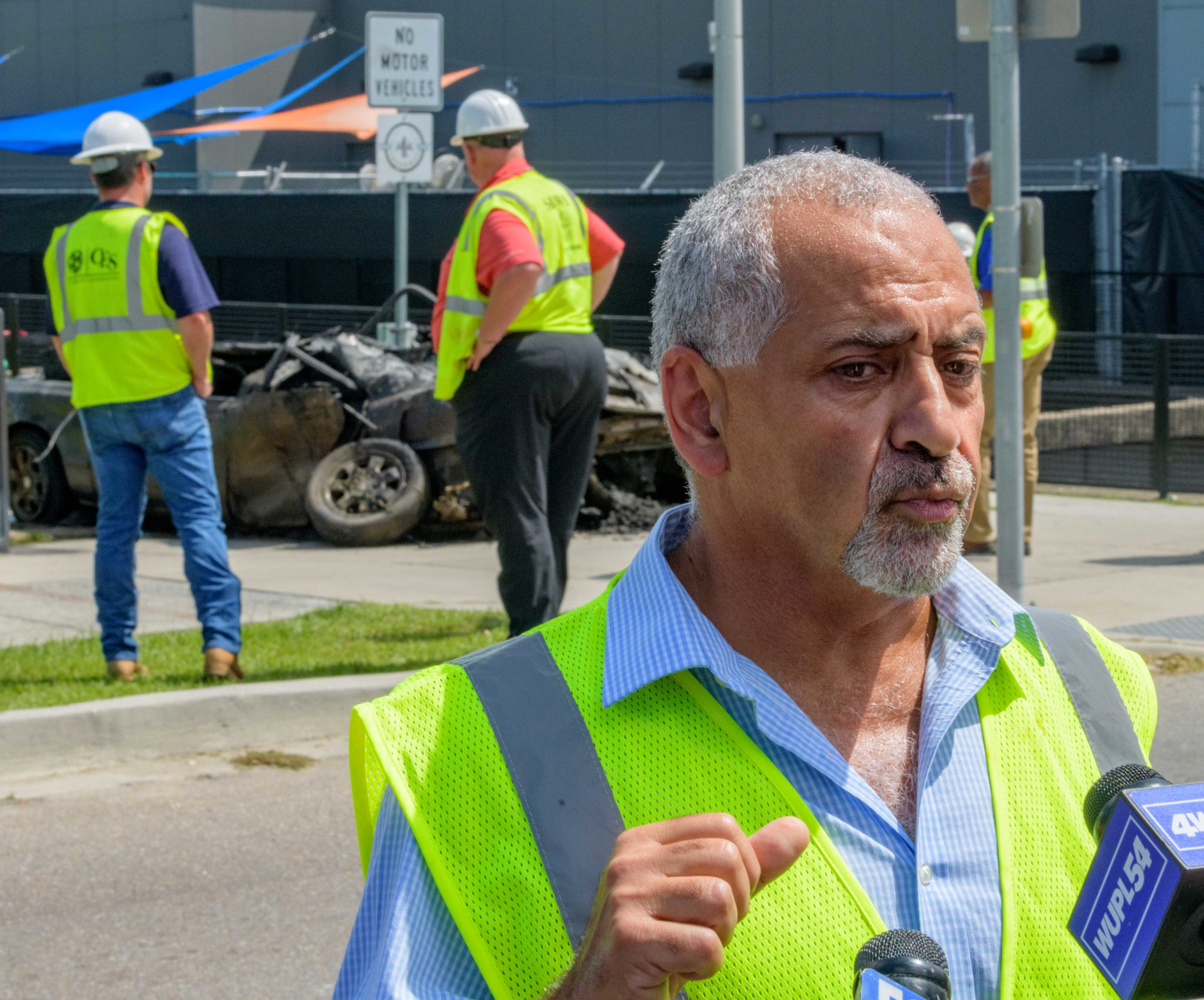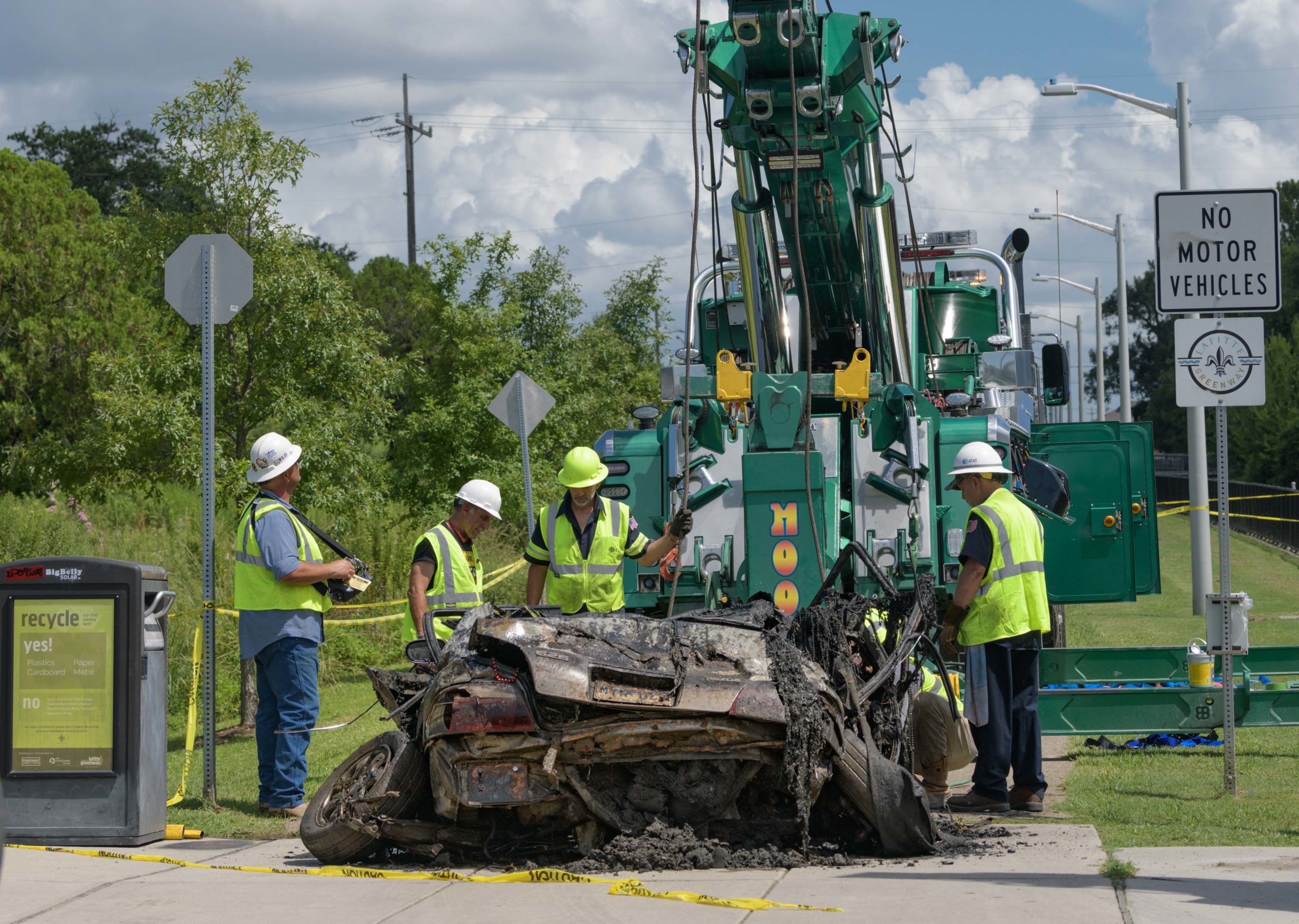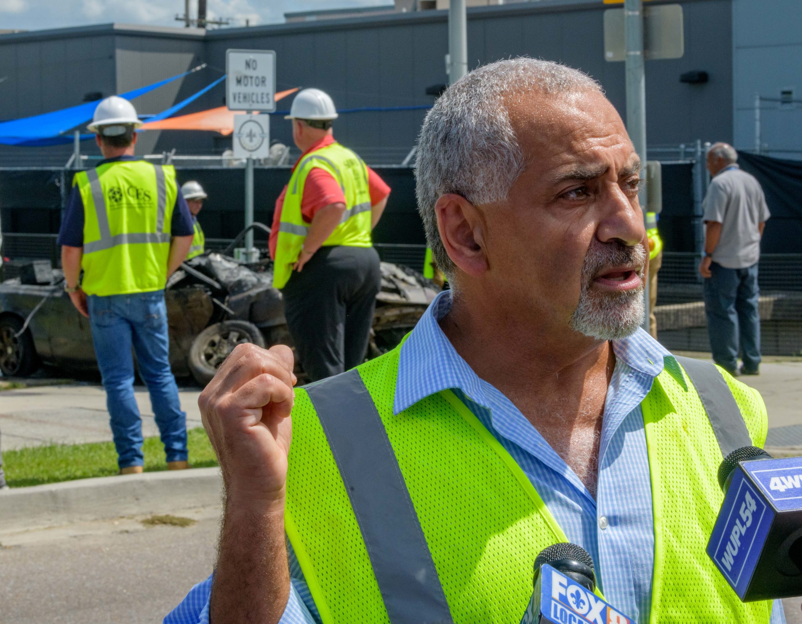 Sewerage and Water Board Executive Director Ghassan Korban talks in front of a Mazada 626 car with a 2007 Louisiana brake tag and Mardi Gras beads coming from the trunk after it is removed from deep inside the Lafitte Canal that drains flood and other water from Mid-City including the Lafitte Greenway in New Orleans, La. Thursday, Aug. 22, 2019. It is among the largest pieces to pulled from a New Orleans drainage canal by the Sewerage and Water Board. The city has suffered a few 100-year flooding events which have been exacerbated by poor drainage in the canals, pumping problems, and clogged catch basins. Photo by Matthew Hinton