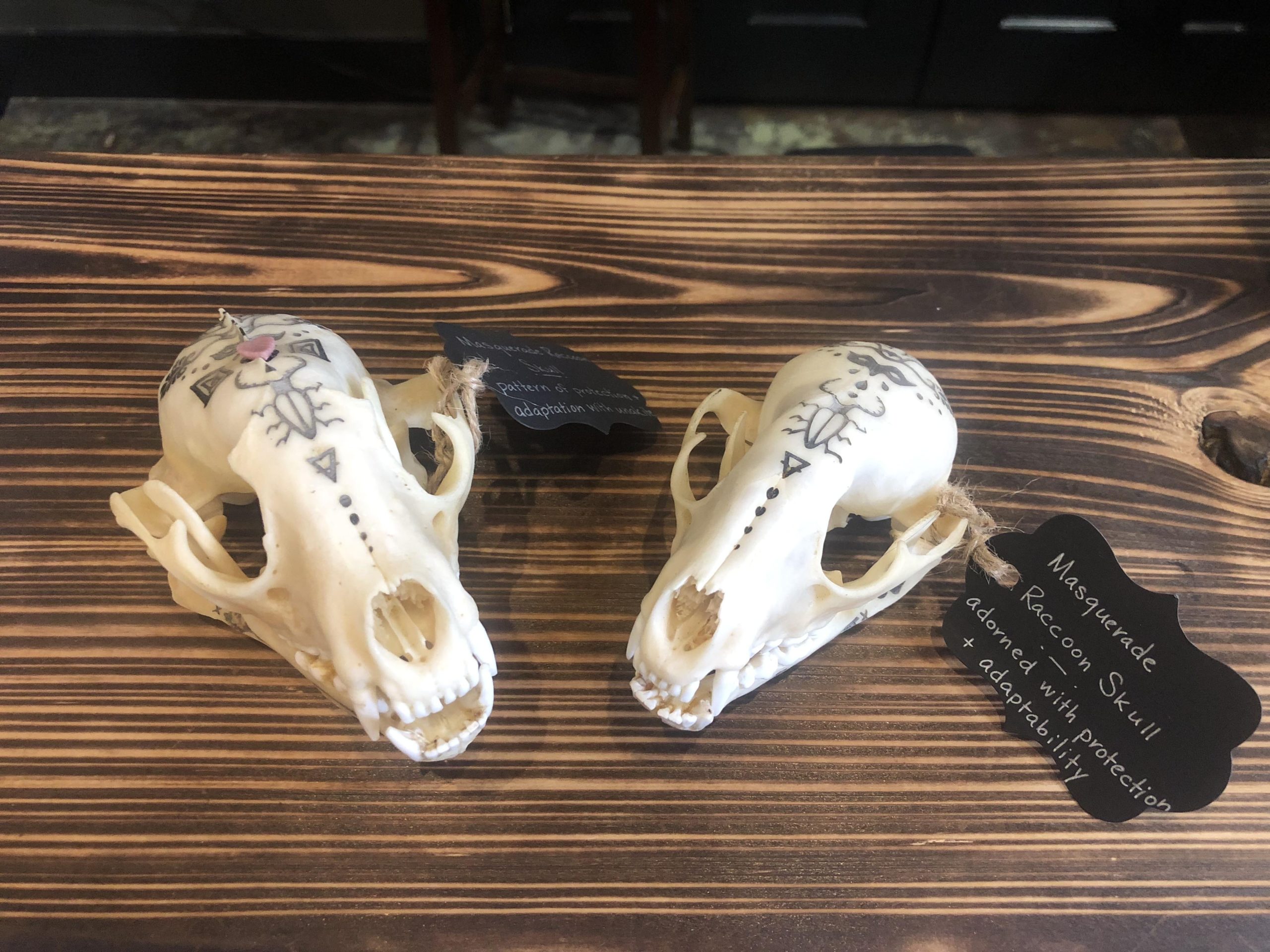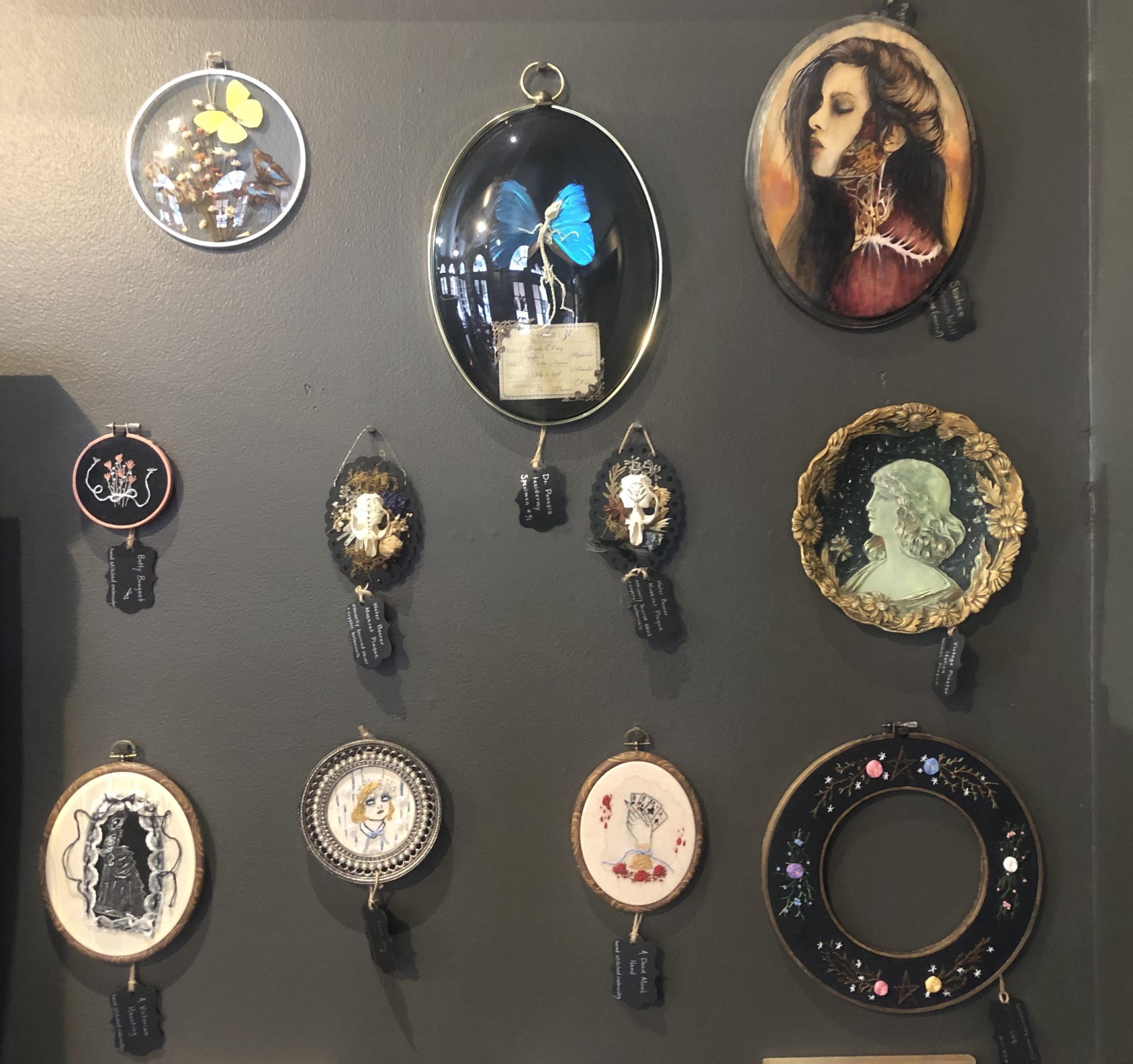 The Sleeping Sirens and Forgotten Boneyard preserve wet specimens and mummify sea creatures, as well as doing osteological processing, The Skeletorium focuses on skeletal articulation, insects and caged skulls, Etched in Embers specializes in pyrography and My My Butterfly and Faerie Things delicately preserve insects.