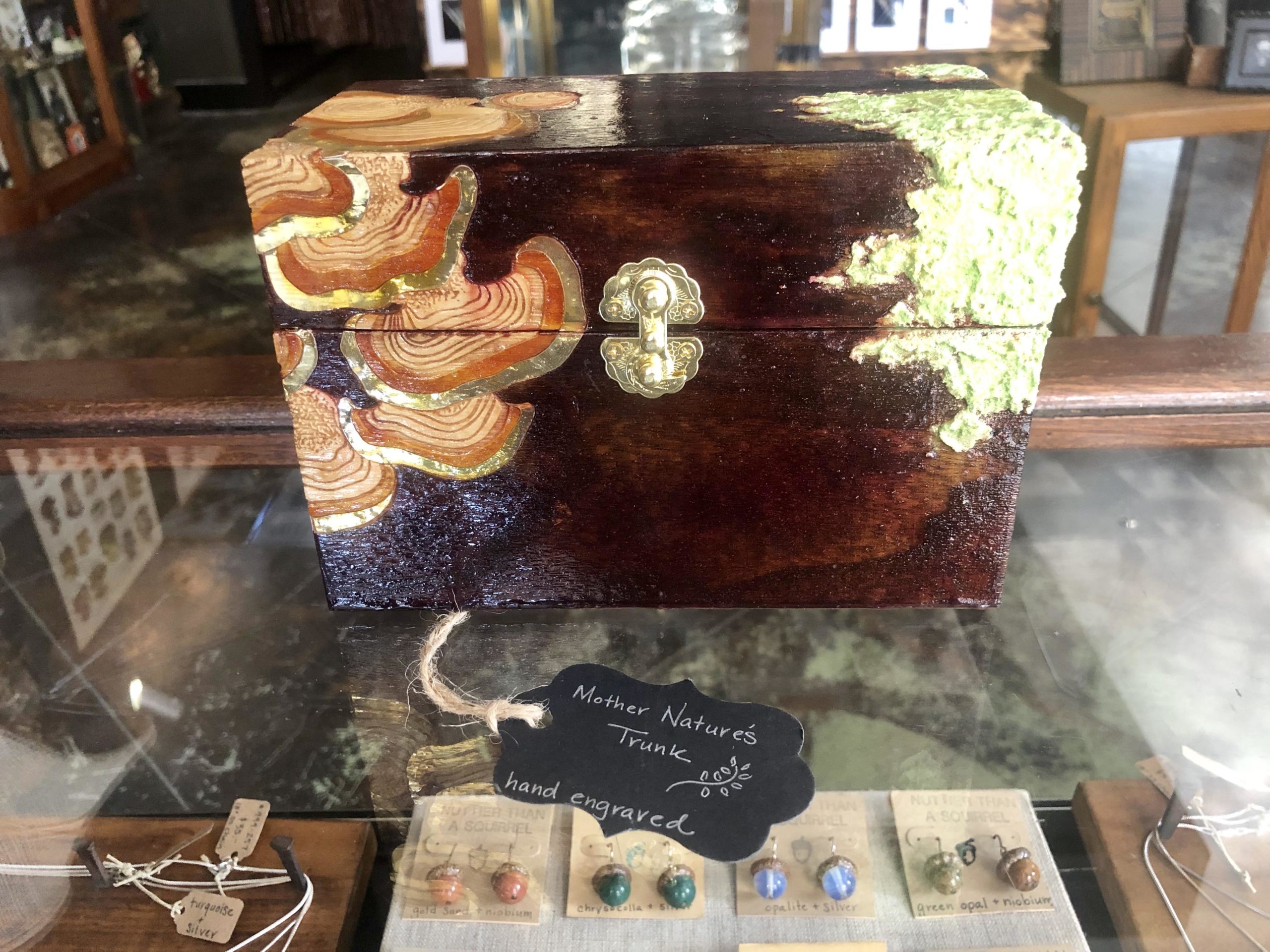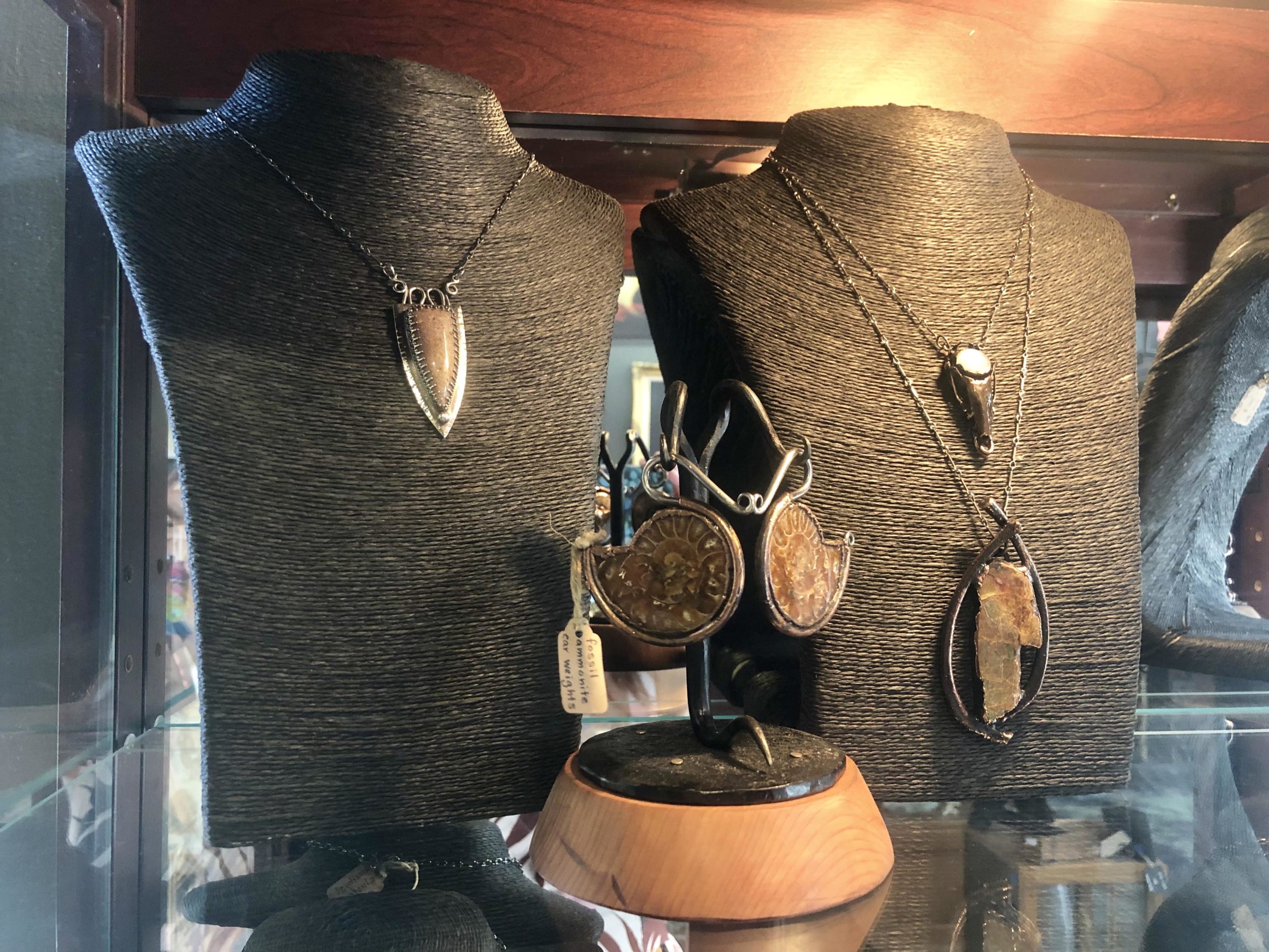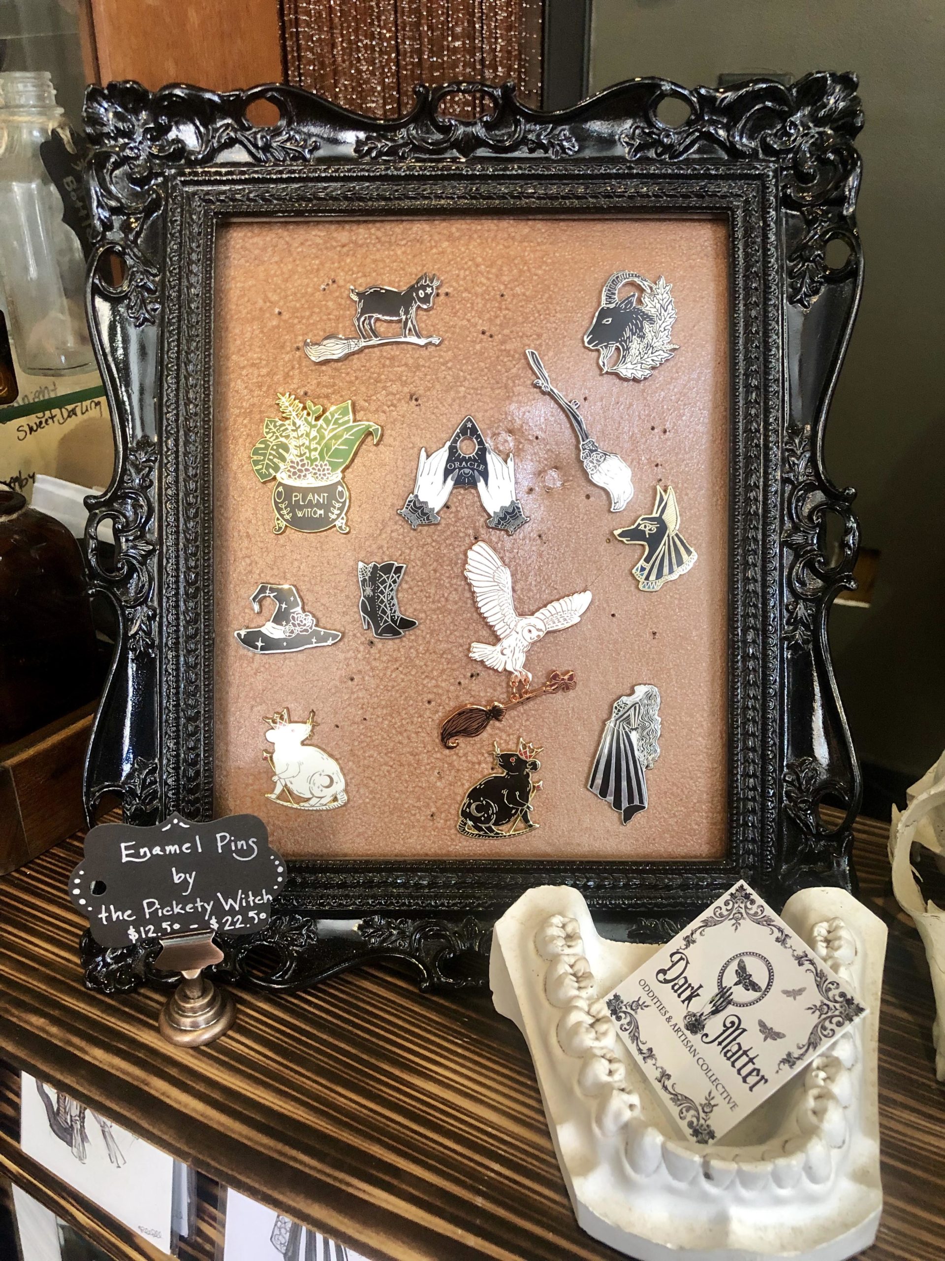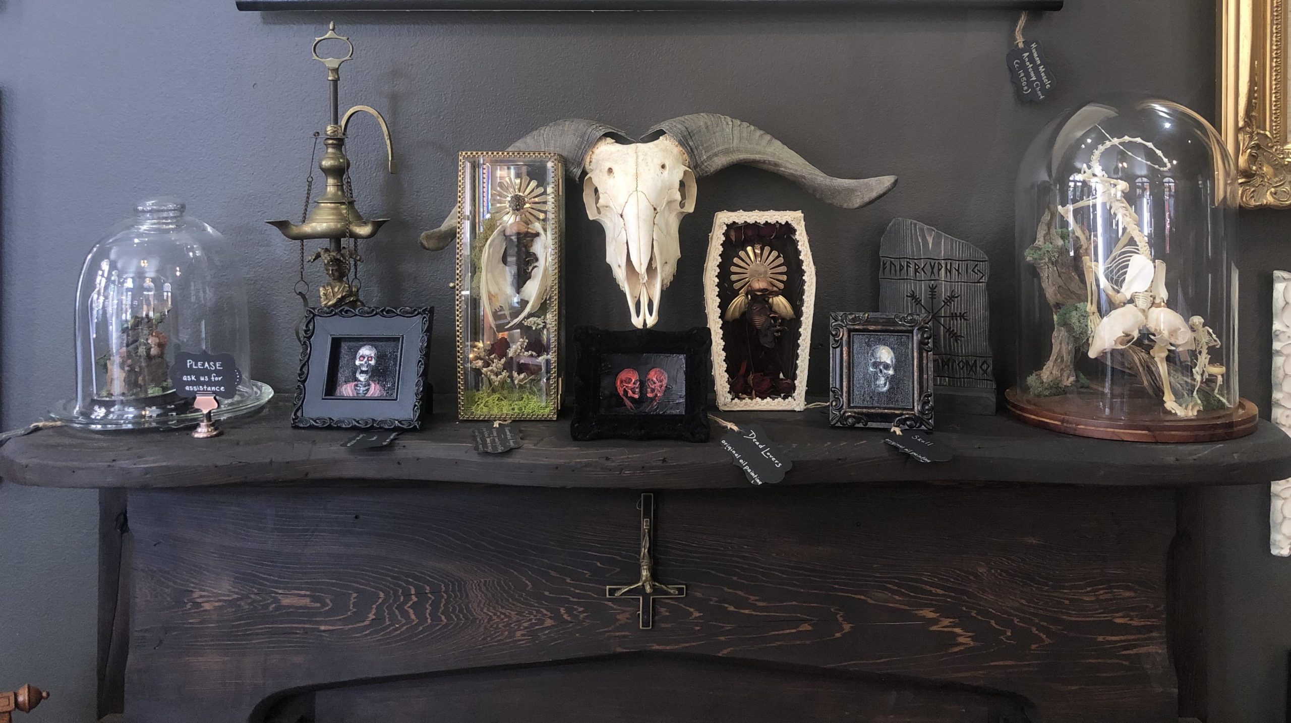 Apologies, as I buried the lead by not mentioning the full-size goats that grace the shop up until this moment. The place is filled with Bovidae, jewels, coffins, carvings, candles, shells, pins, paintings, postcards, creatures of all sorts, though as Chrystal assures us, “It smells really good in here; It does not smell like dead animals.”