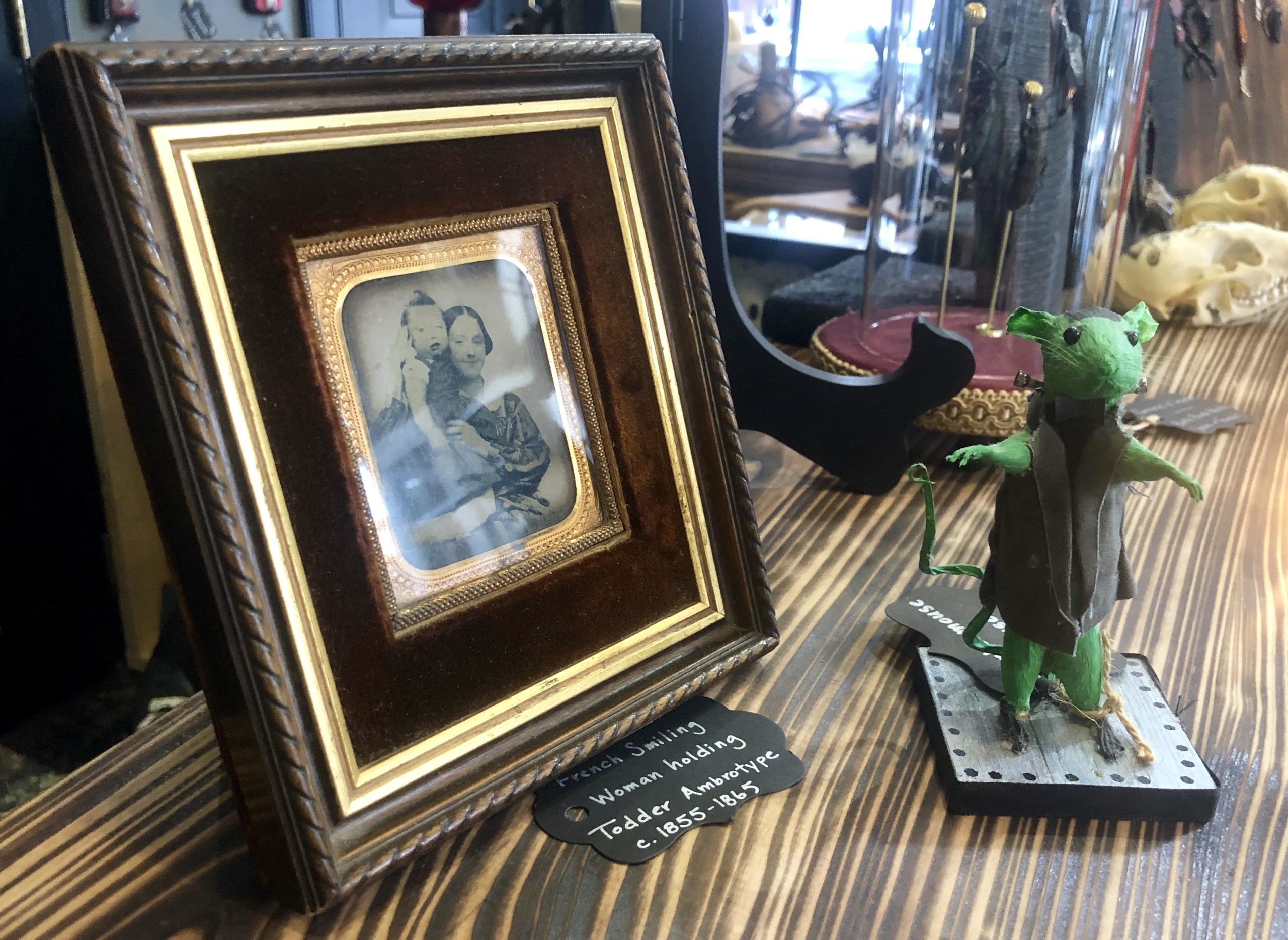 “We met all of our local artists (oil painter Eric Clay Dean, illustrator Trista Musco, stitch witch Curious Adornments, found-object artist Faerie Things and laser engraver Saynomore Studio) at various art markets around New Orleans; our non-local artists were met during traveling exhibitions, particularly the Oddities & Curiosities Expo. Weirdos tend to gravitate to one another.” Chrystal said, giggling behind her Nosferatu Face Mask. “We believe wholeheartedly in [our artists’] work, and in them as individuals. We adore our Merry Band of Misfit Makers! We also only support ethical, sustainable, and conscientious taxidermy work. Most of our taxidermists would fall under the ‘rogue taxidermy’ movement, ‘vulture culture’ (found animal remains), or utilize vintage mounts. We do not condone trophy killing.”