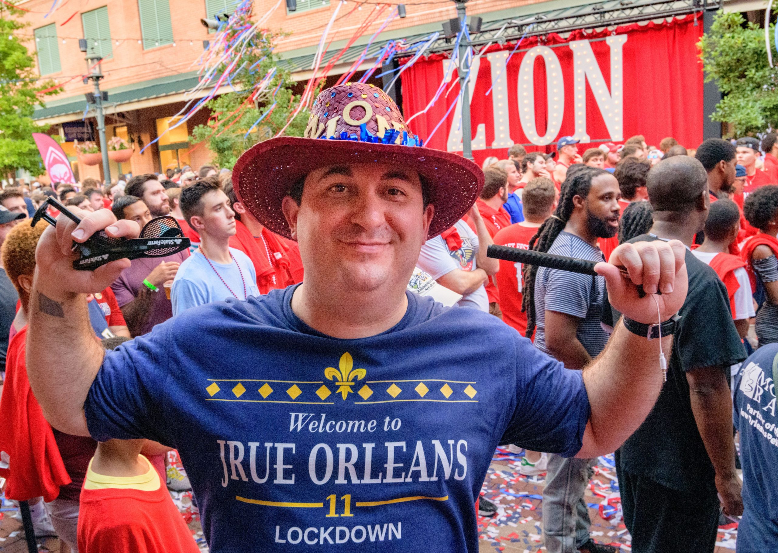 Fans hang out in Fulton Square during the announcement of the New Orleans Pelicans drafting Zion Williamson number one in the NBA draft outside Manning’s Restaurant in Fulton Square in New Orleans, La. Thursday, June 20, 2019. Manning’s is run by Archie Manning, the first round draft pick of the New Orleans Saints in 1971 and the father of two number one NFL draft picks with his sons Eli and Peyton Manning who were both born in New Orleans. Photo by Matthew Hinton