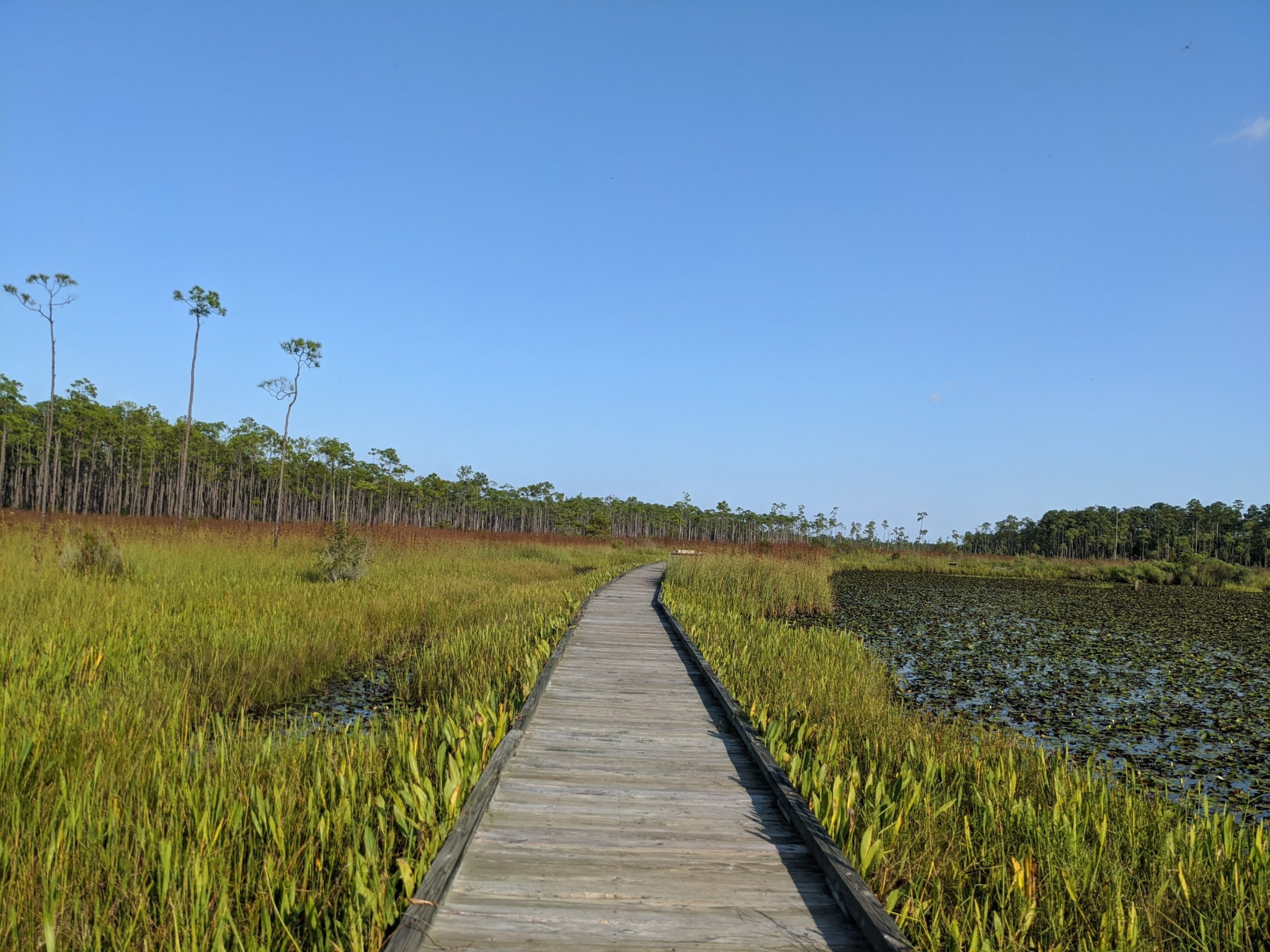 As you look around, you’ll see a pine forest towering above the water, and you can follow a mostly gravel trail through the woods for another two miles down to shimmering Bayou Lacombe (yes, it really shimmers), amazed that the car dealerships and big-box stores in Slidell are only a few miles away. Stop at the lookout platform and benches about halfway to enjoy a view of waving marsh grass or cool off in the shade of the woods.
