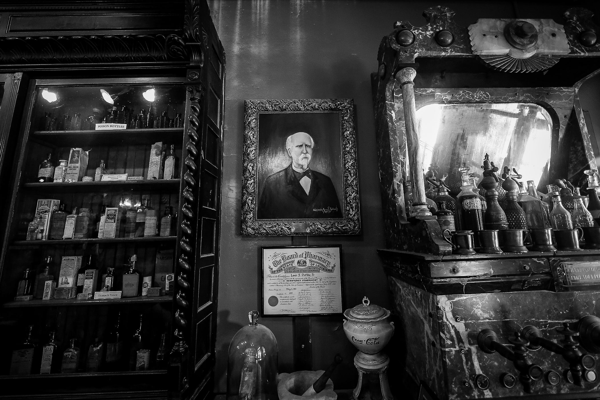 Today, the New Orleans Pharmacy Museum occupies the Chartres Street building which has been restored into a splendid recreation of Dr. Dufhilo’s shop, with glass and mahogany cabinets displaying original mortar and pestles, glass medicine bottles, and all manner of instruments and implements of 19th century pharmacology and medicine, including a jar marked “leeches.”