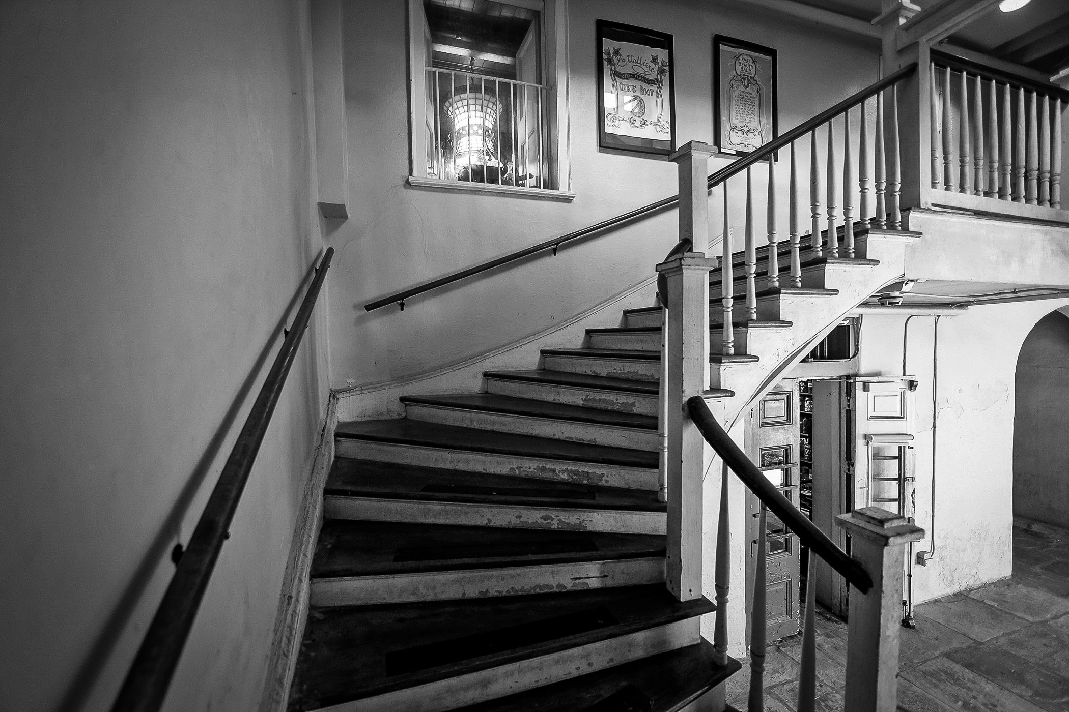 But there is also an unwelcome fixture, that of a stocky, short, mustachioed ghost of late middle-age man wearing a brown suit under a white lab coat who roams his former pharmacy, opening cabinets, throwing books, looking into bottles, rearranging locked displays and frequently setting off the burglar alarm. He has frequently been seen on the curving stairway that connects the back of the shop to the second floor. People have reported feeling a ghostly shove from behind as they walk the creaking, wooden stairs.