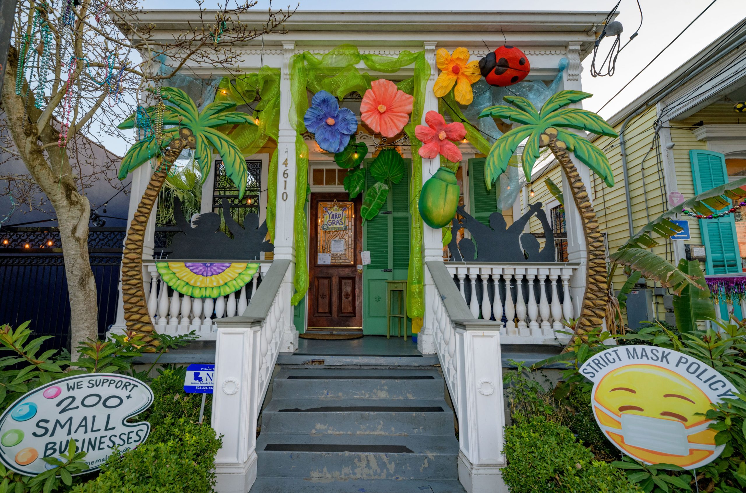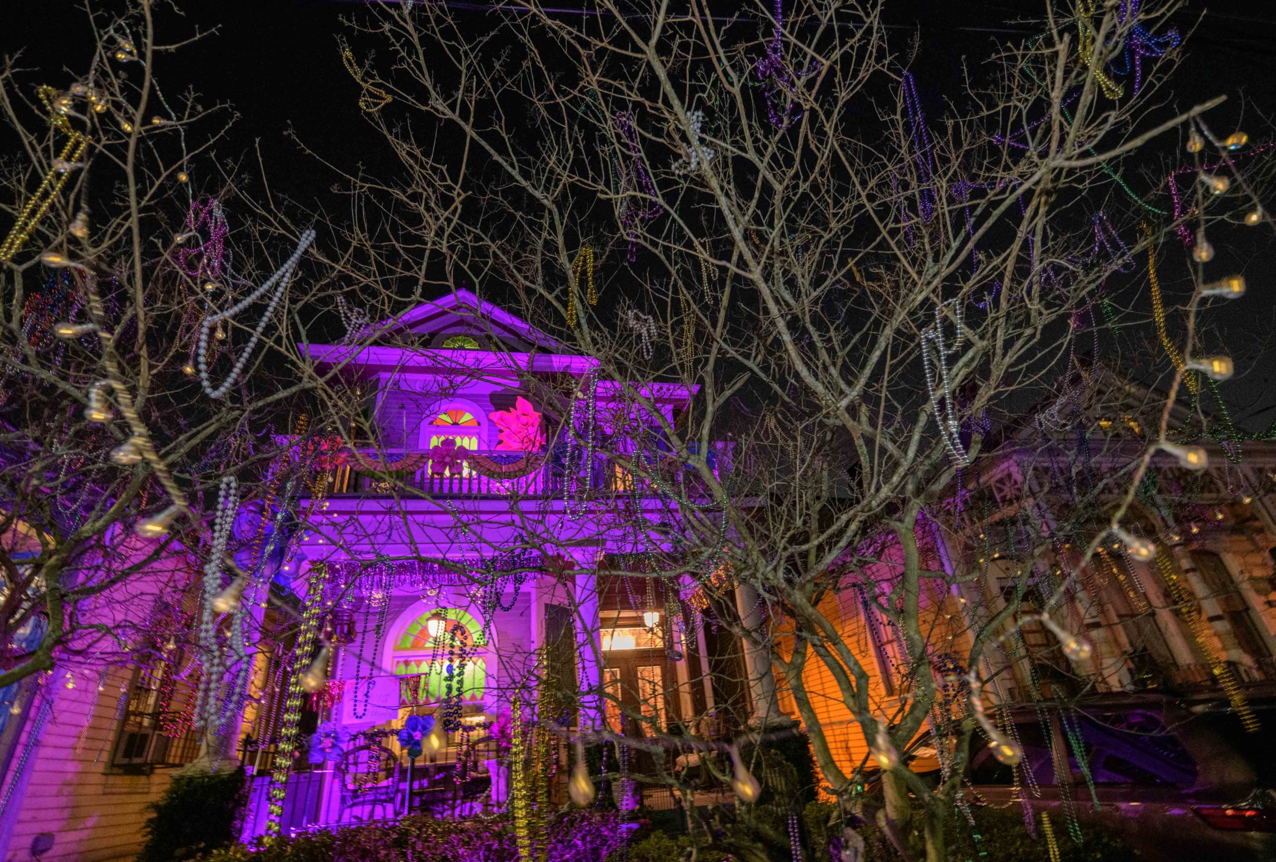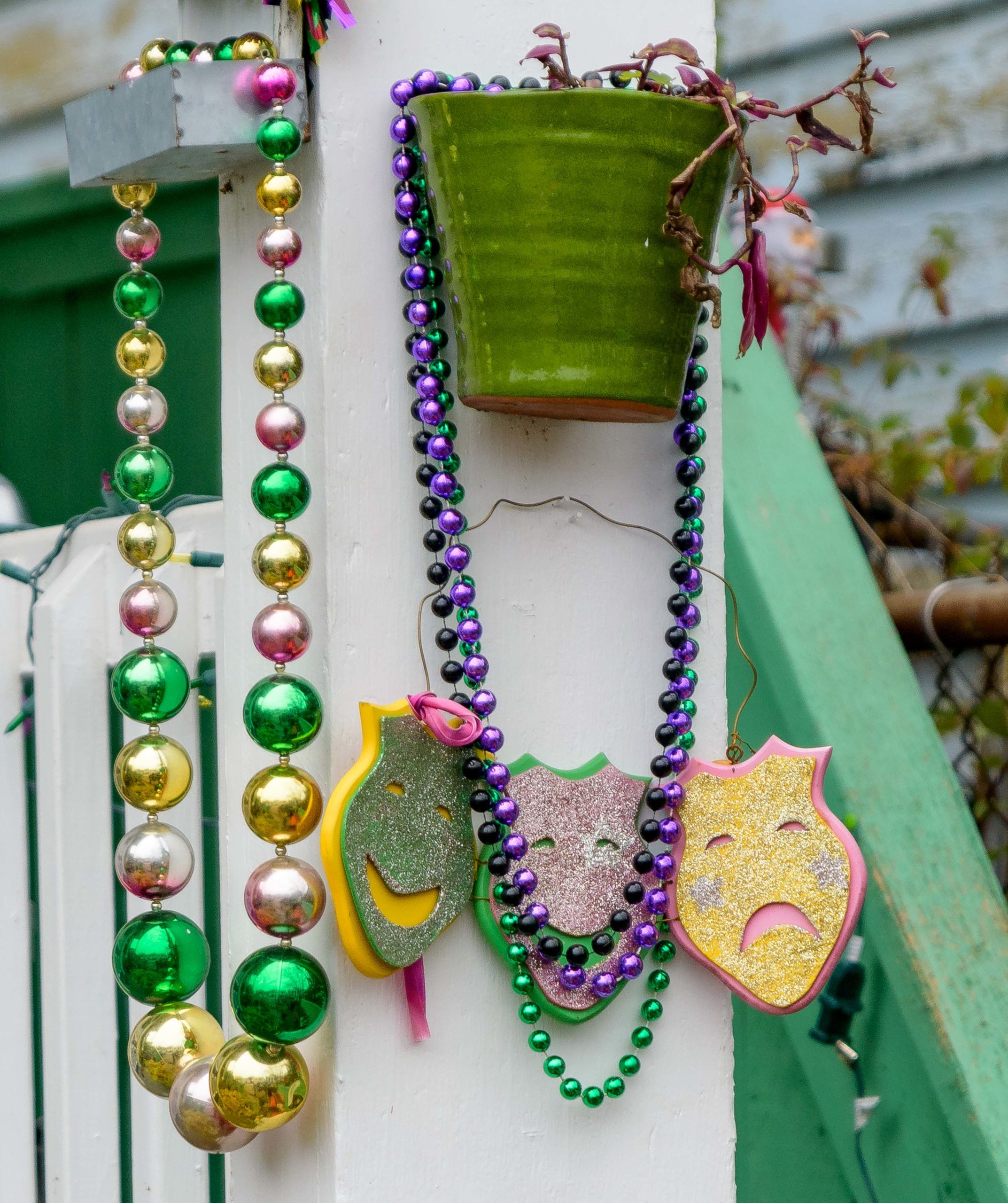 A home on Laurel Street in the Irish Channel, though some may hear it as Yanny Street, is seen with large Venetian-inspired Mardi Gras masks and giant beads strewn across. Photo by Matthew Hinton