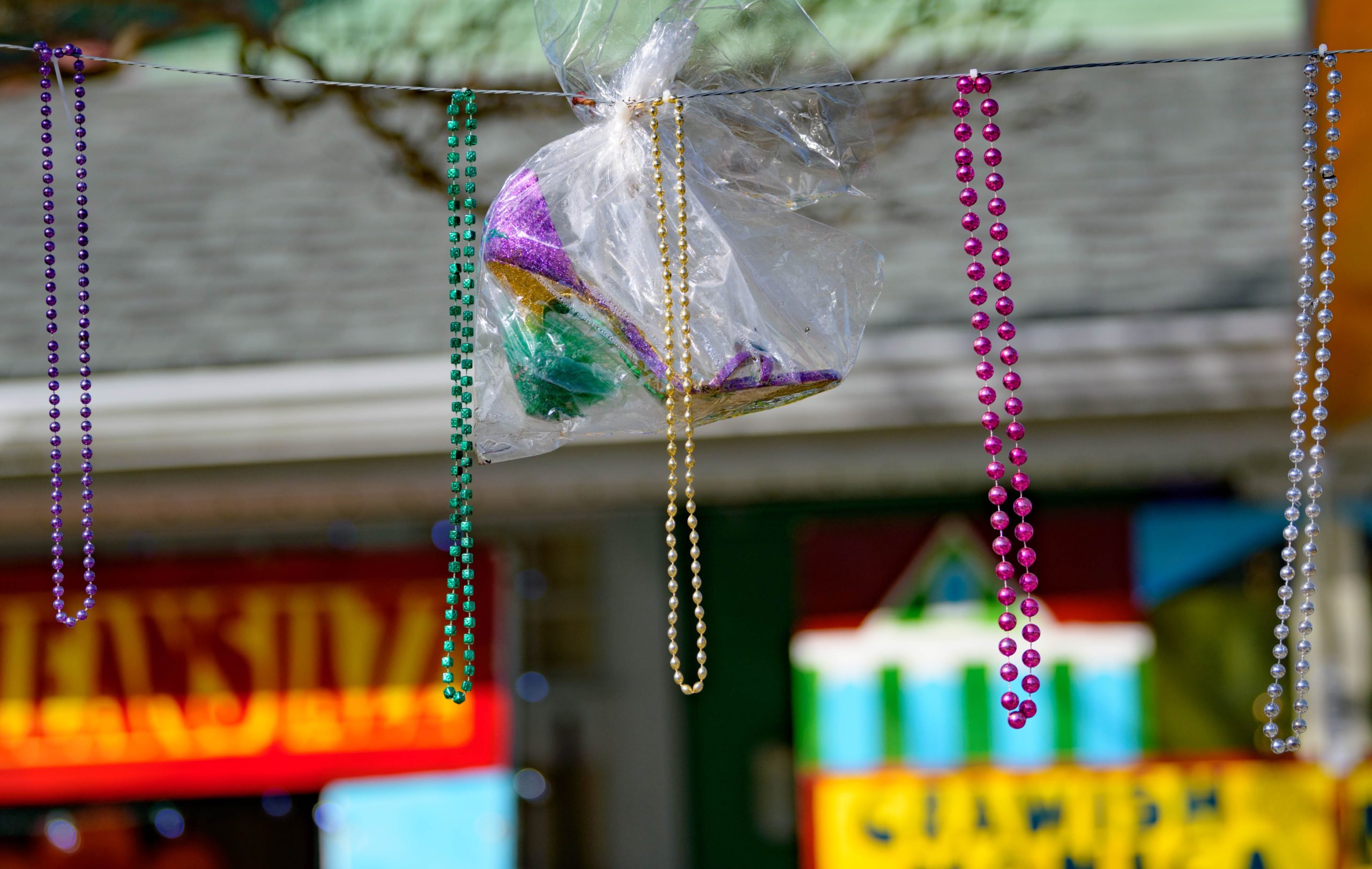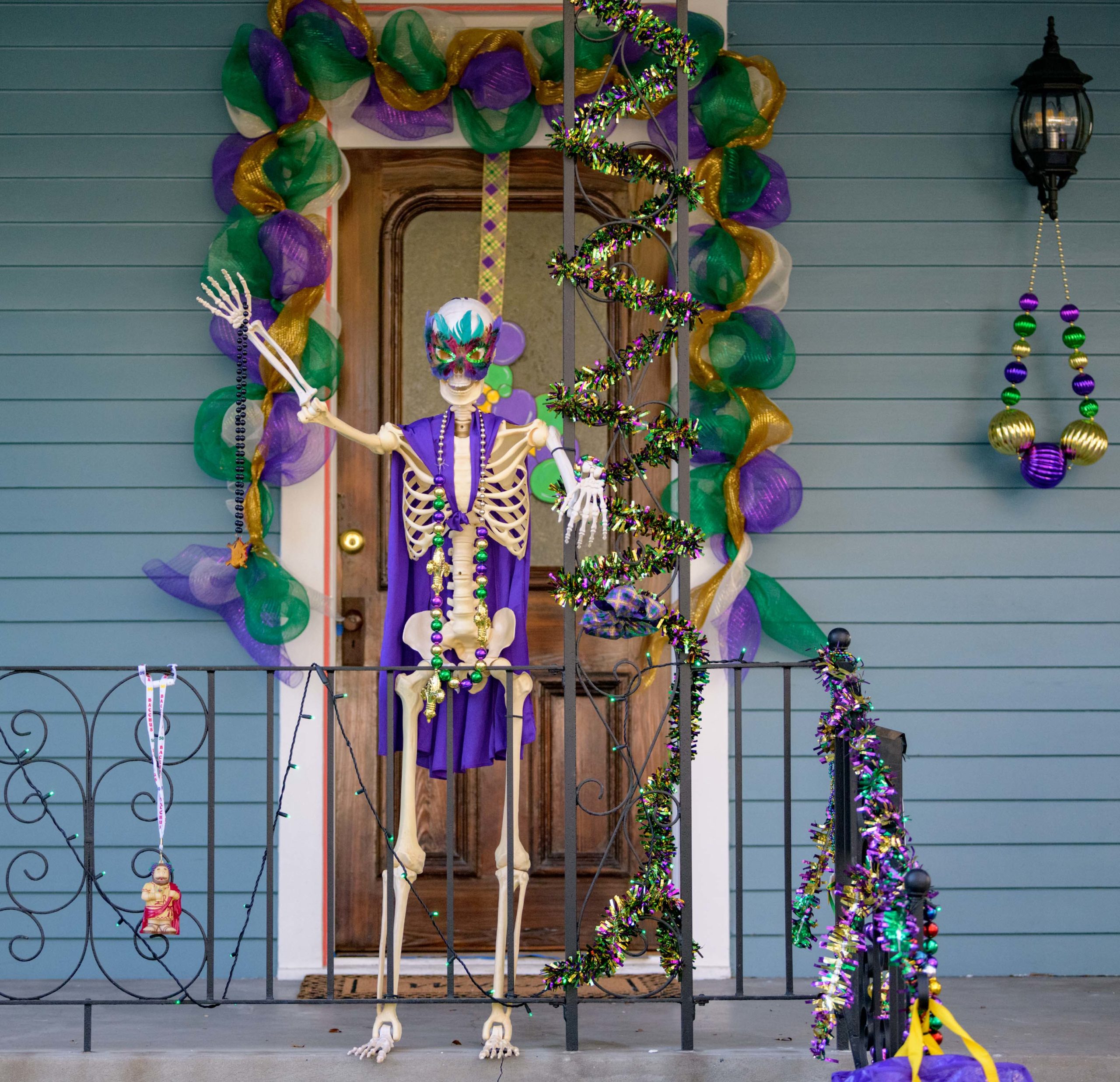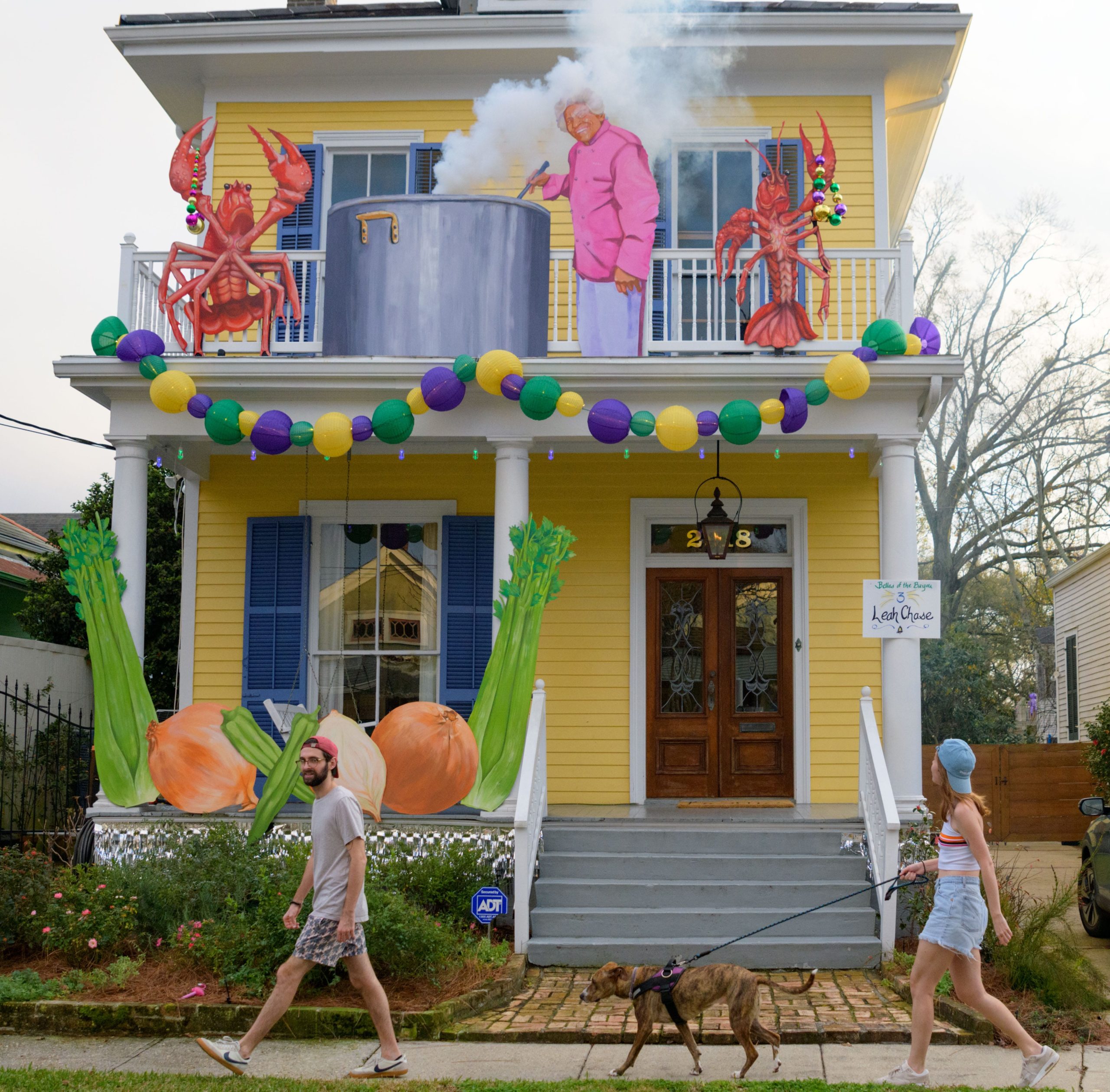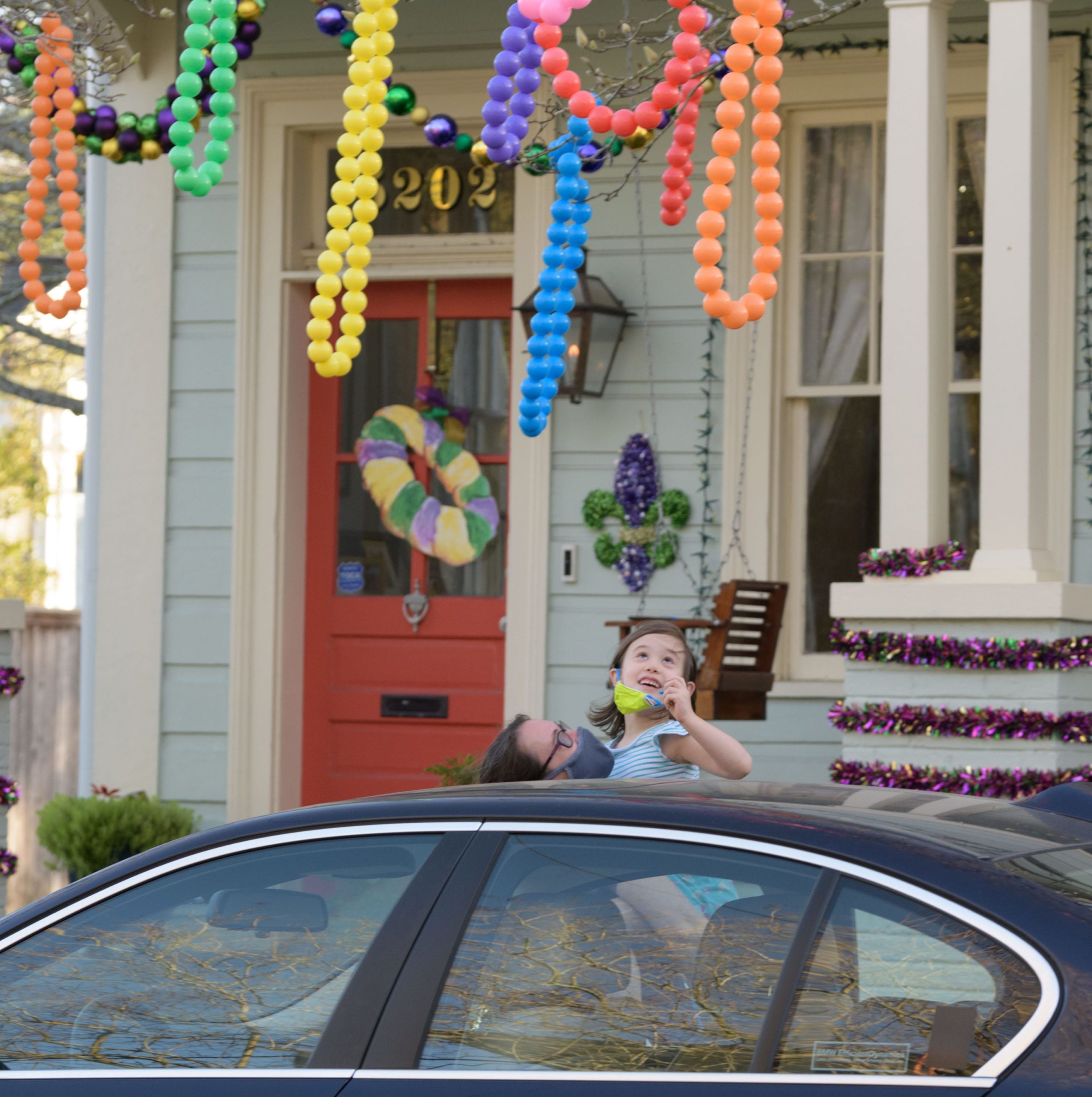 A home on Laurel Street in the Irish Channel, though some may hear it as Yanny Street, is seen with large Venetian-inspired Mardi Gras masks and giant beads strewn across. Photo by Matthew Hinton