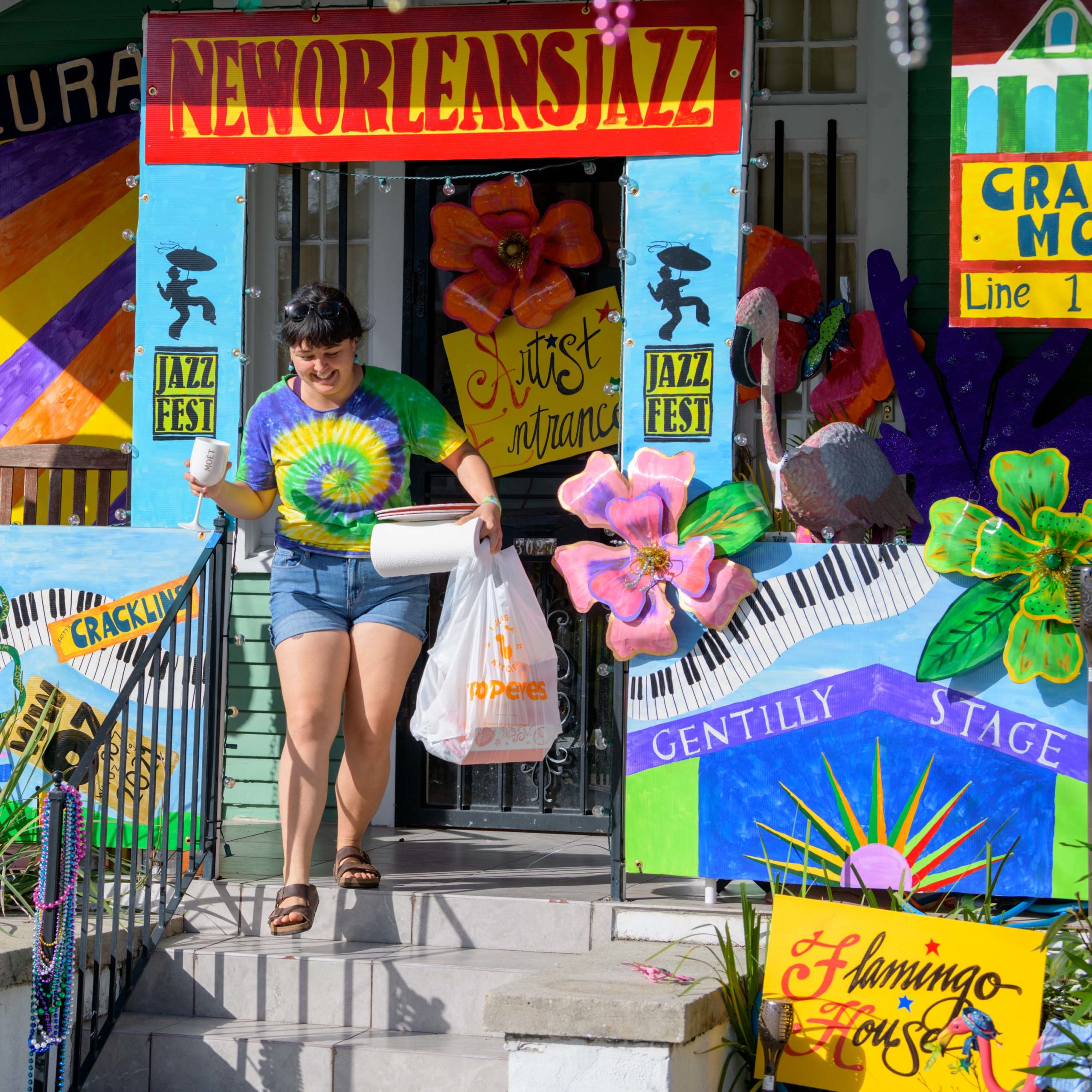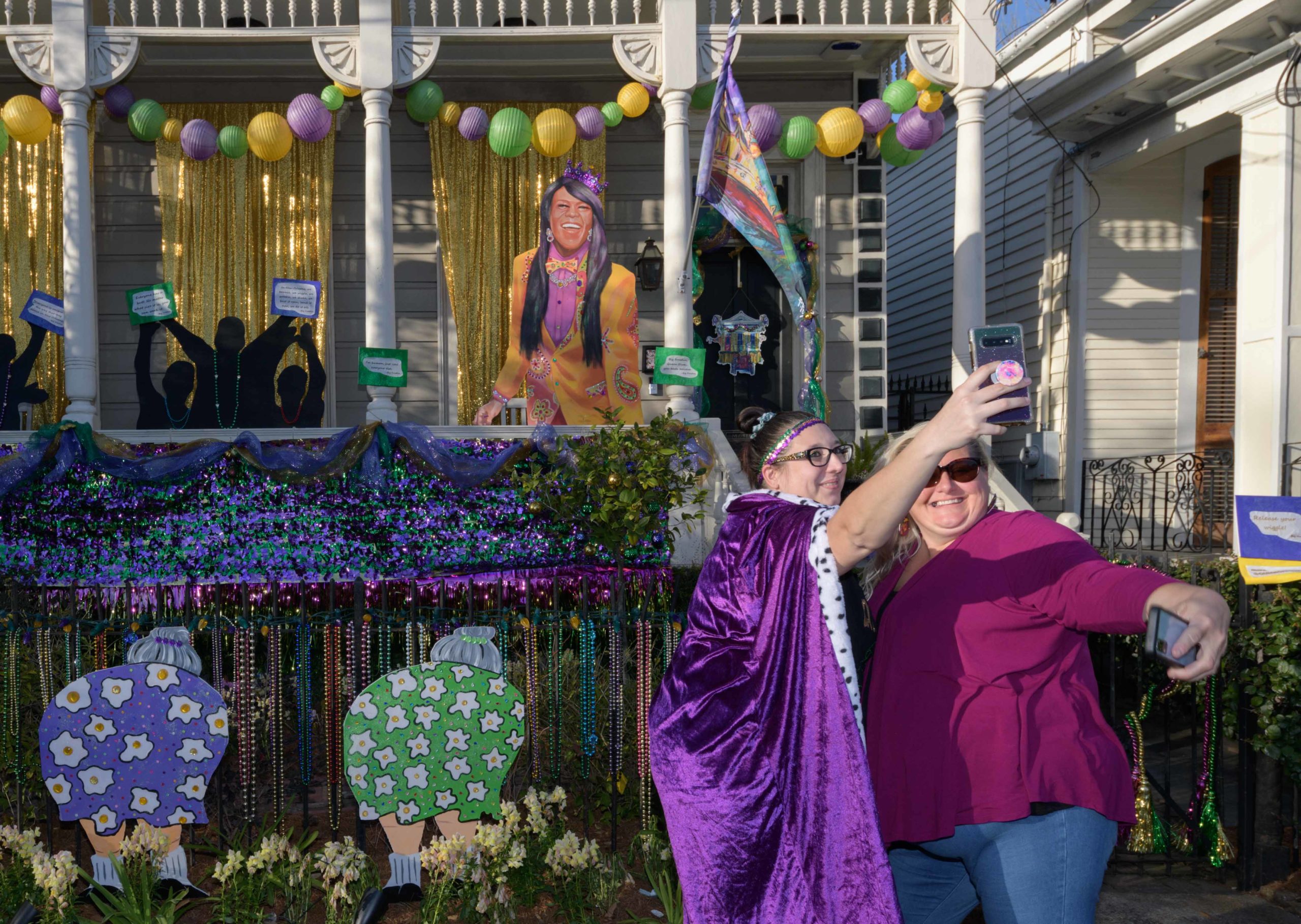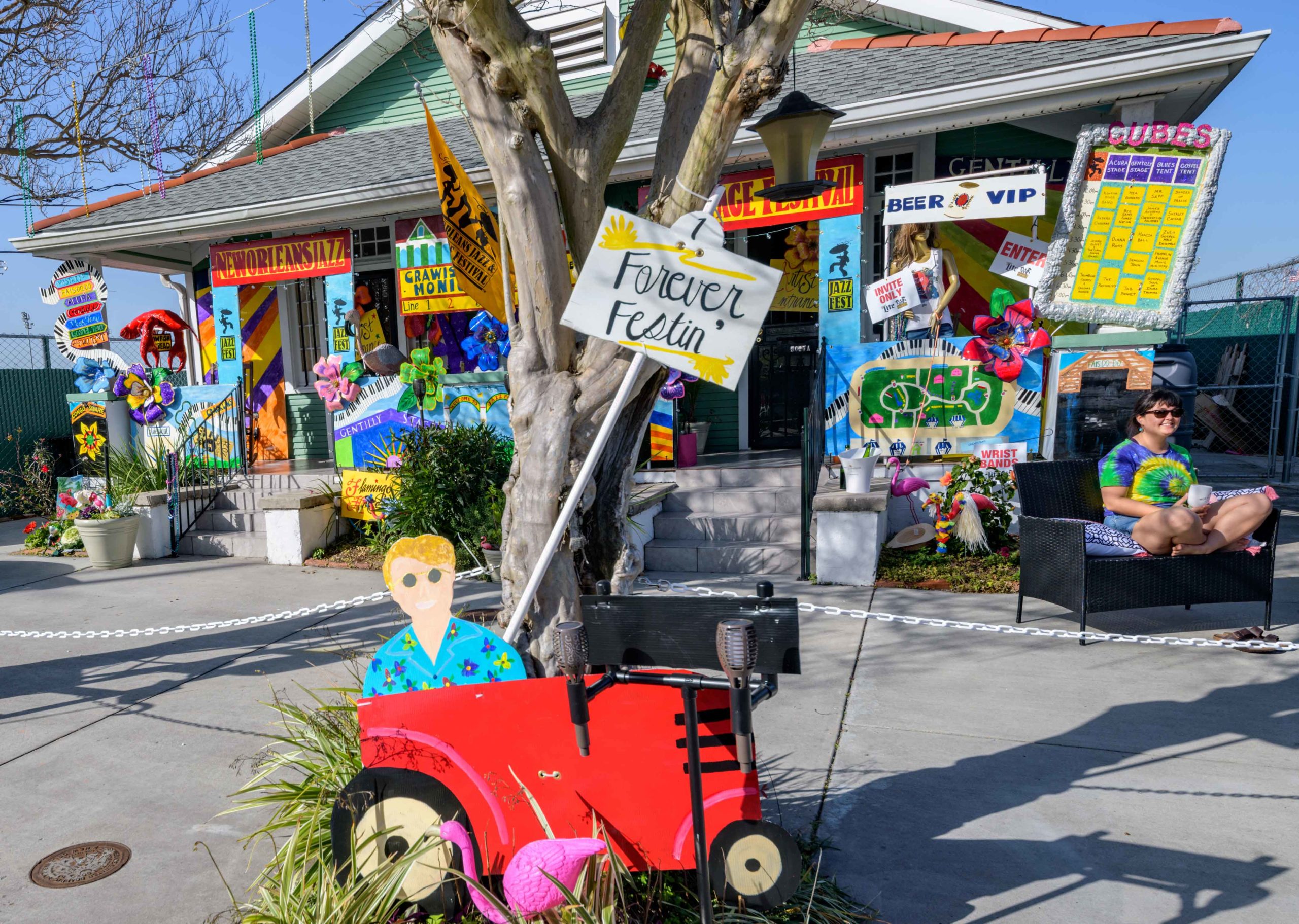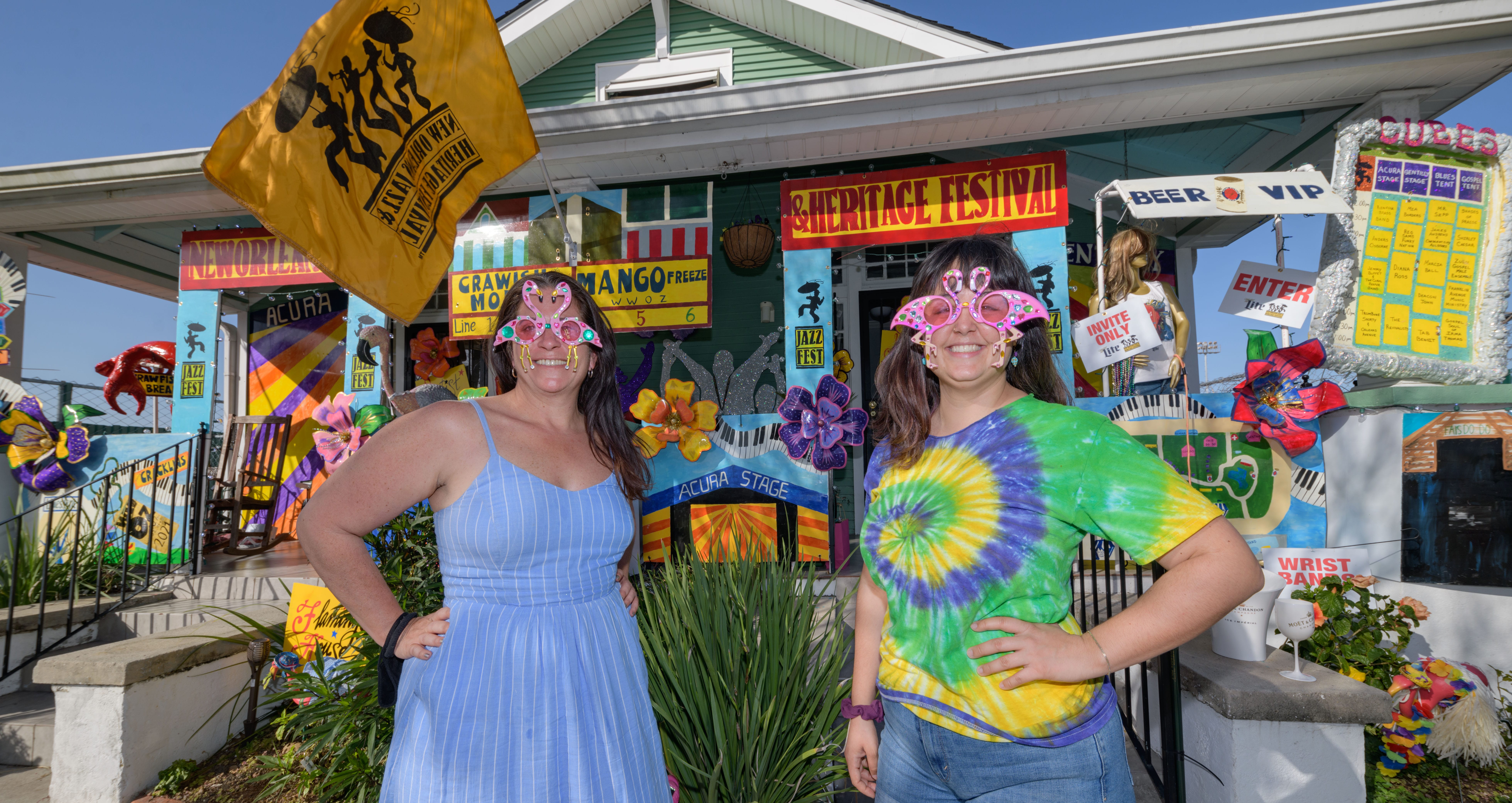 Valerie Landry, left, and Marion Boreros are #ForeverFestin on 3027 Fortin Street for the Krewe of House Floats. @FlamingoHouseNOLA actually neighbors the Fair Grounds where the New Orleans Jazz and Heritage Festival annually takes place but even though the 2020 Jazz Fest was postponed the neighbors are always festing and have decorated their home to look like different stages and food booths at Jazz Fest. The Krewe of House Floats is an initiative to decorate homes during the Carnival season because of the cancellation and postponement of parades and gatherings for Mardi Gras 2021 due to the COVID-19 pandemic. Photo by Matthew Hinton