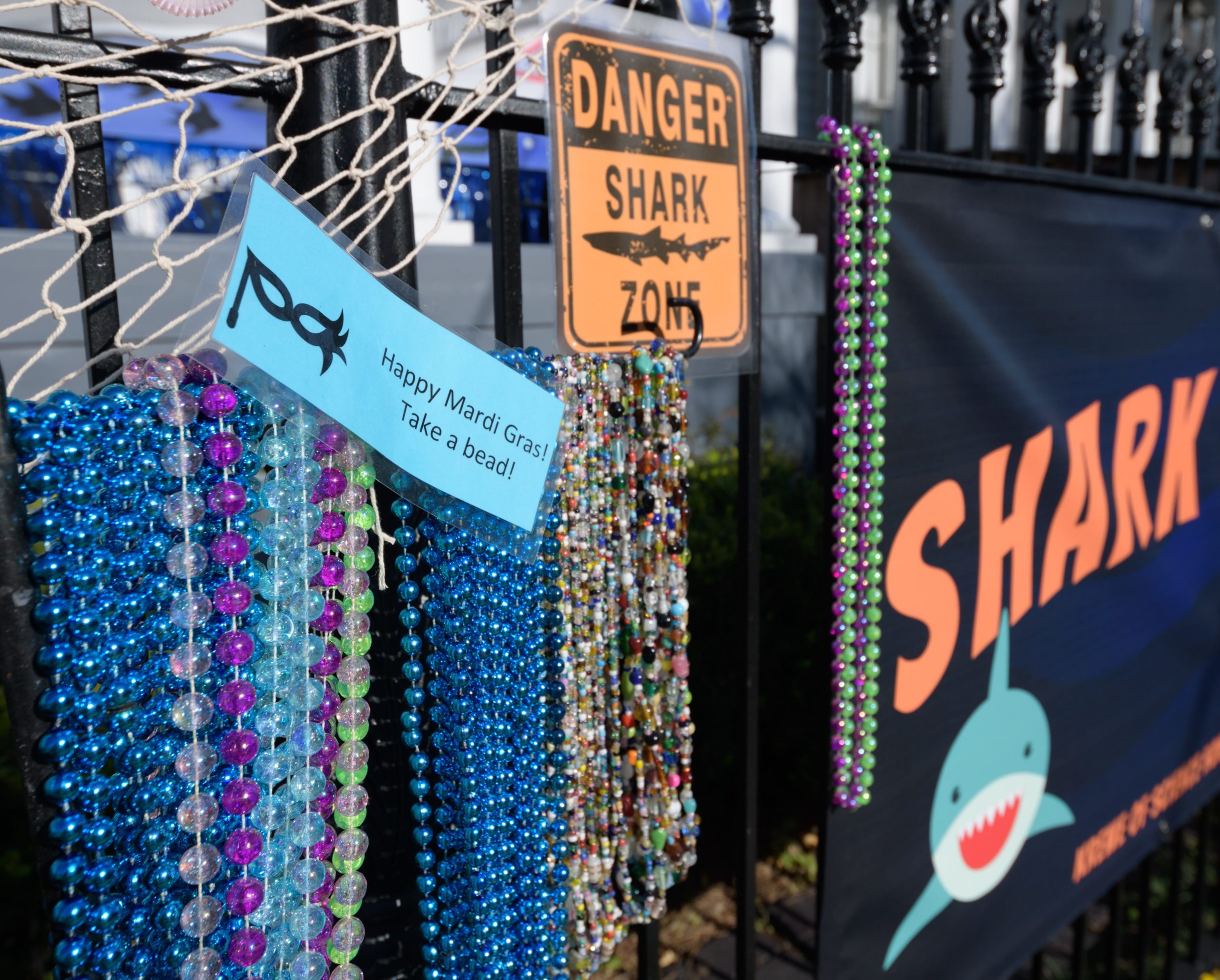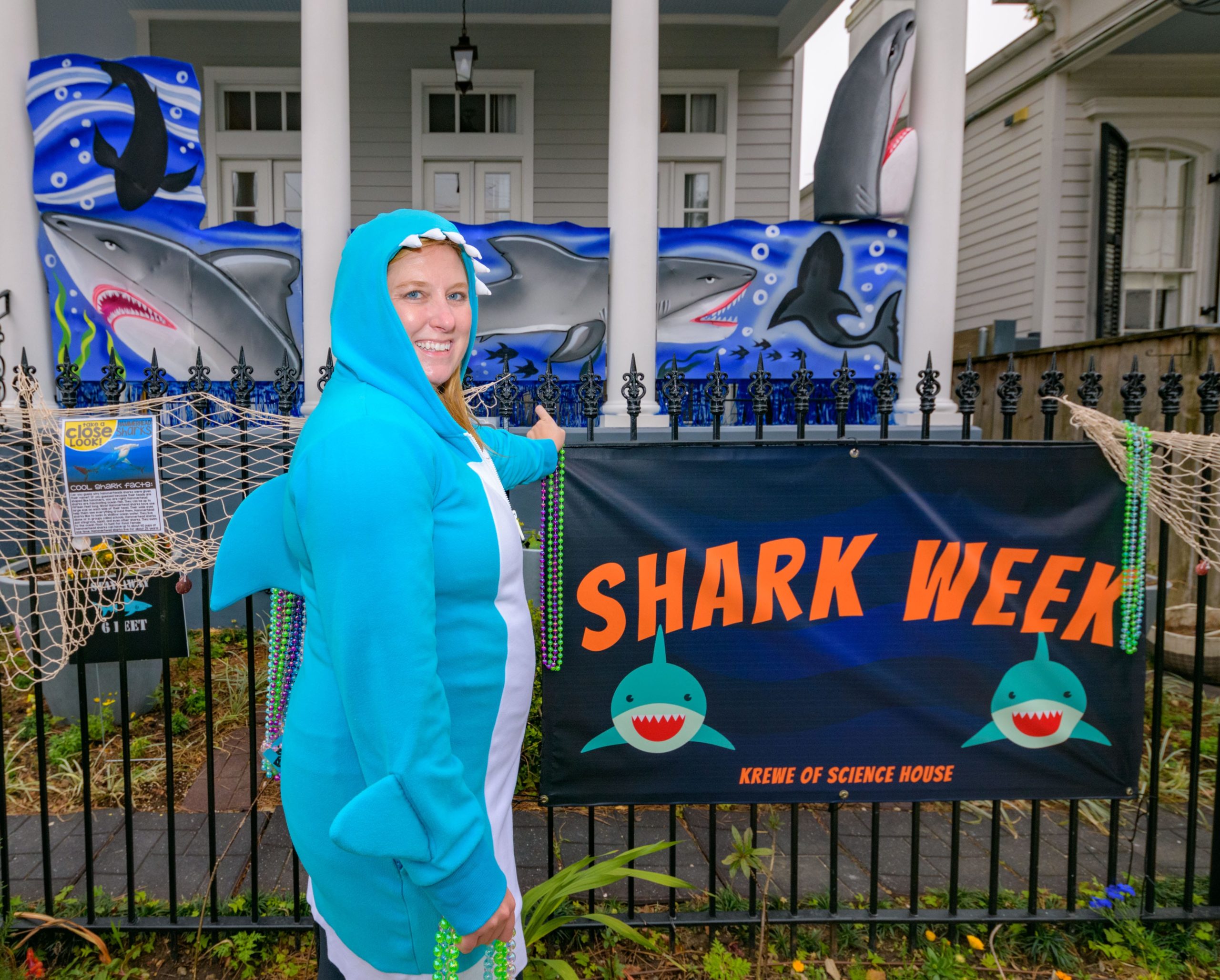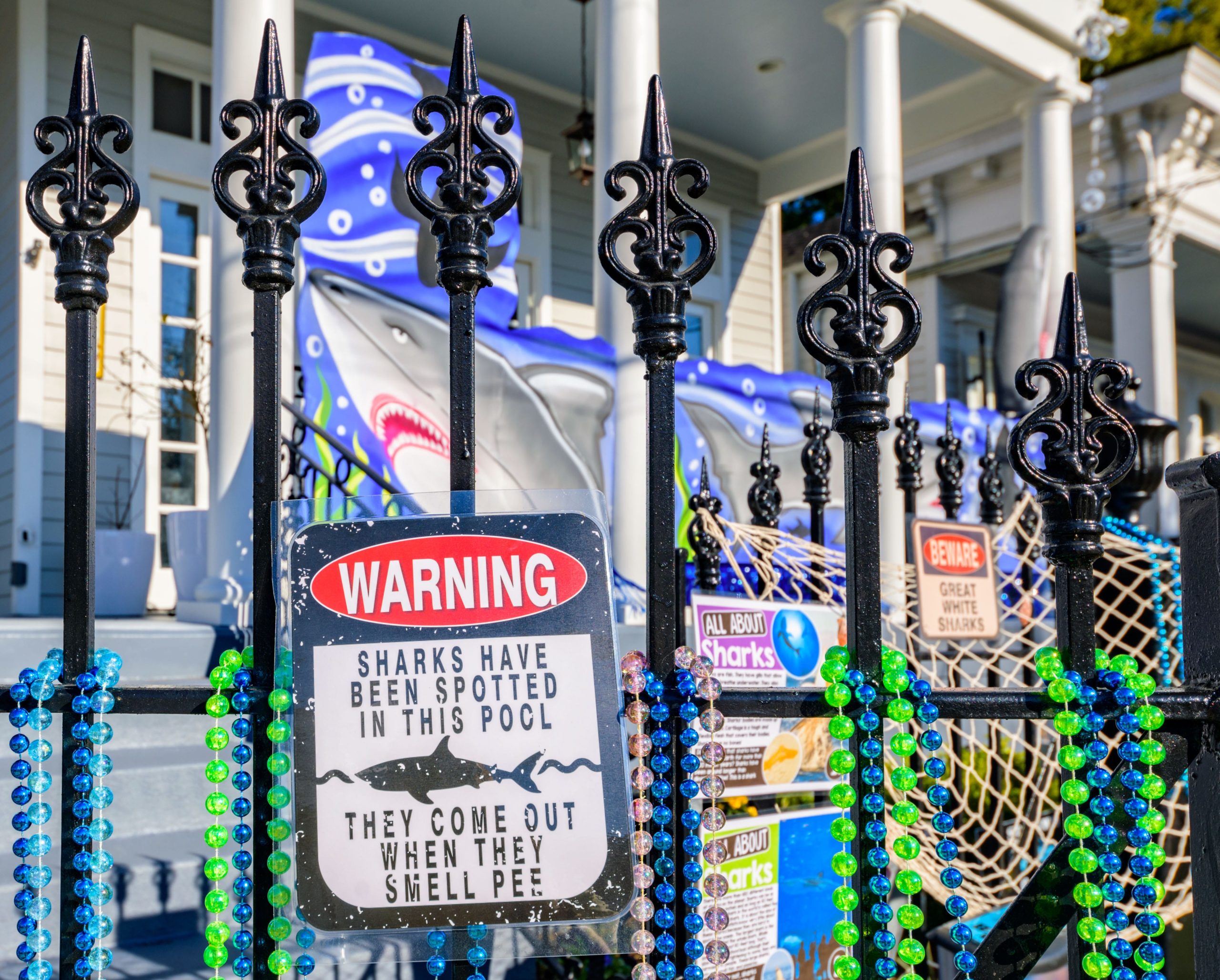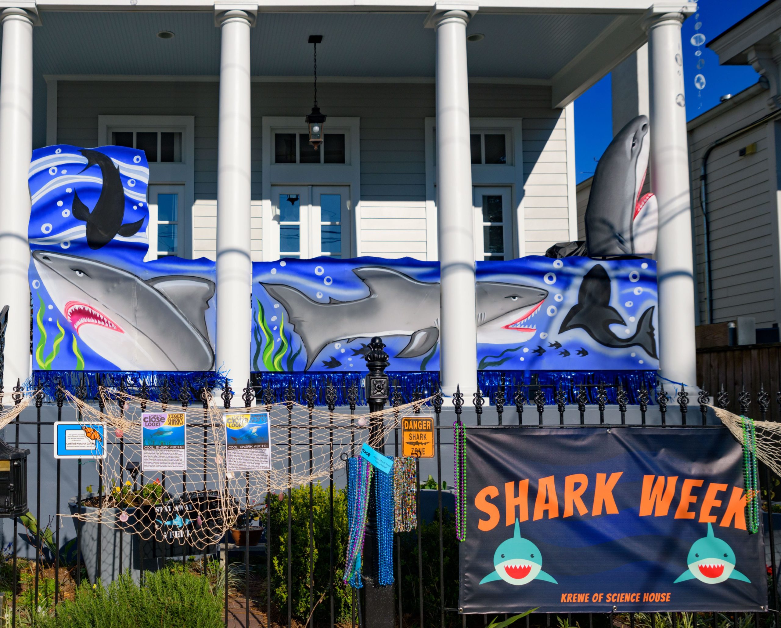 Sharks have been spotted in this pool, but as long as you stay six feet away, you can pick up some free beads and learn some interesting shark facts from the Krewe of Science House at 727 First Street in the Irish Channel. Elizabeth Carter started posting different science topics on her fence during the pandemic including information about COVID-19 and other themes about different animals that live in Louisiana. Carter is an LSU law professor who previously worked in vaccine development after attaining a degree in biology. The Irish Channel neighborhood has chosen Channel Surfing for their theme in the Krewe of House Floats. The Krewe of House Floats is an initiative to decorate homes during the Carnival season because of the cancellation and postponement of parades and gatherings for #MardiGras2021 due to COVID-19 pandemic. Before the pandemic, Carter took part in the satirical Krewe of Tucks parade. Keeping with the channel surfing theme Carter and her husband Adam Swensek chose “Shark Week”. She also has coloring books and toys for kids in the neighborhood along with Mardi Gras beads. The #PorchFloat decorations were created by Crescent City Artists, LLC. #CrescentCityArtists states that they are the first Black-owned Mardi Gras float service providers in Louisiana and are led by a New Orleans husband and wife duo Rene and Inez Pierre. Live everyday like it’s Shark Week. Photo by Matthew Hinton