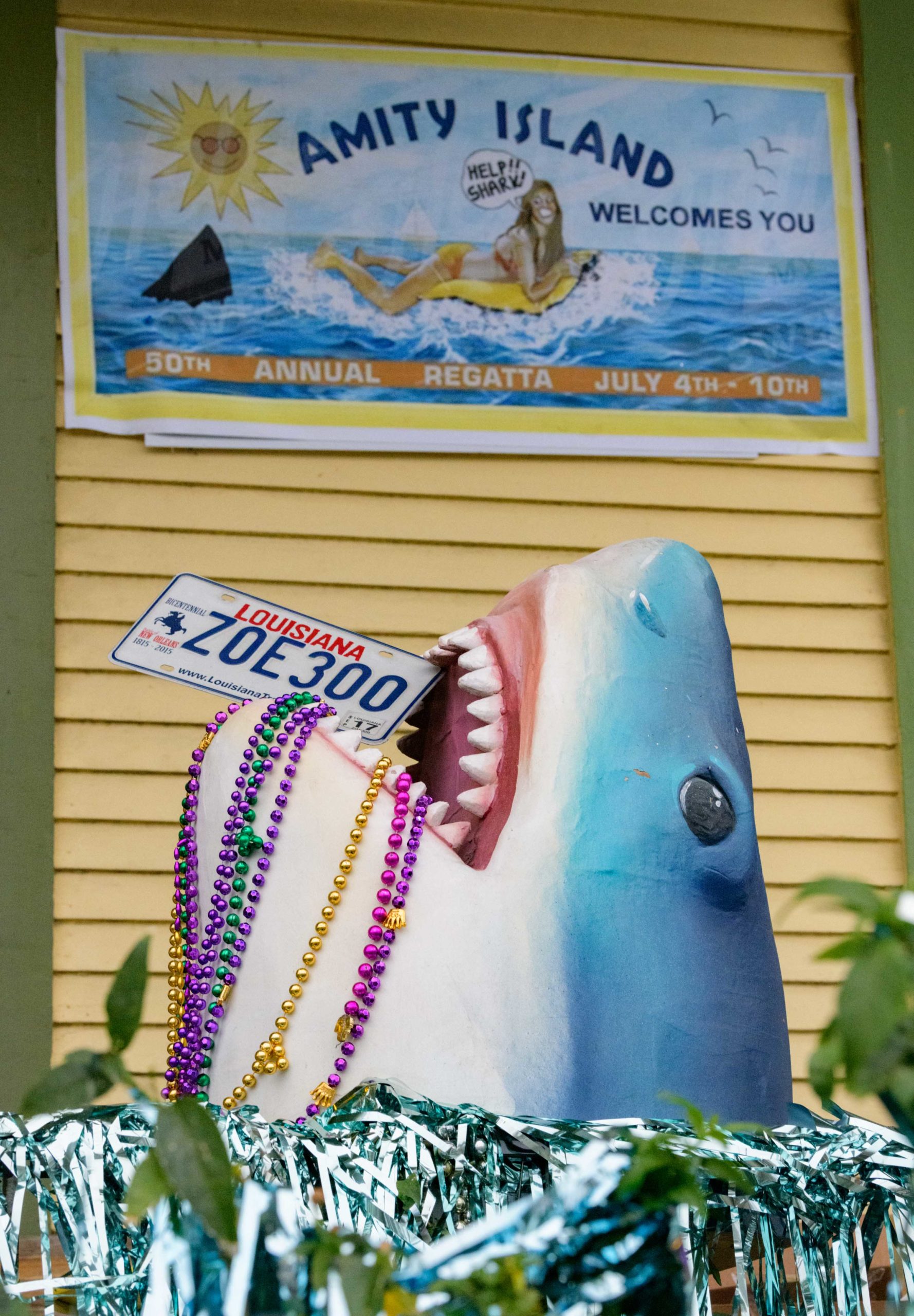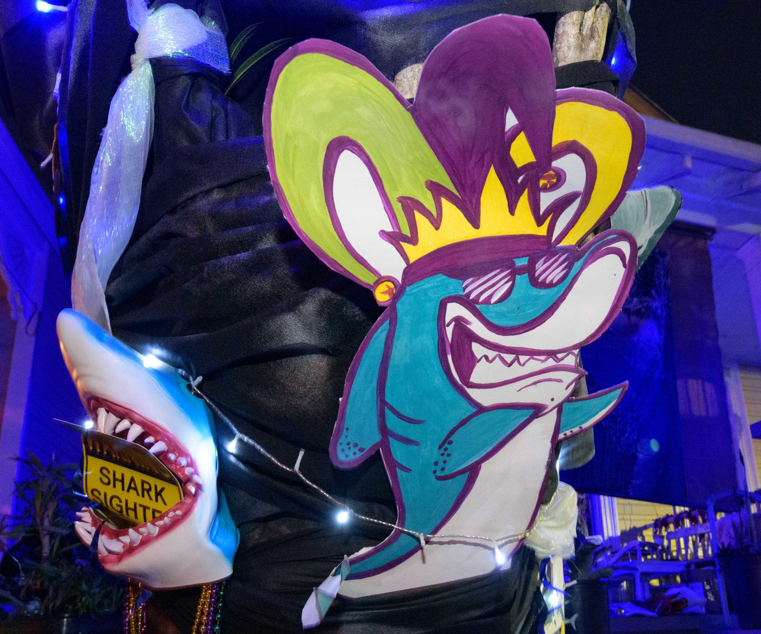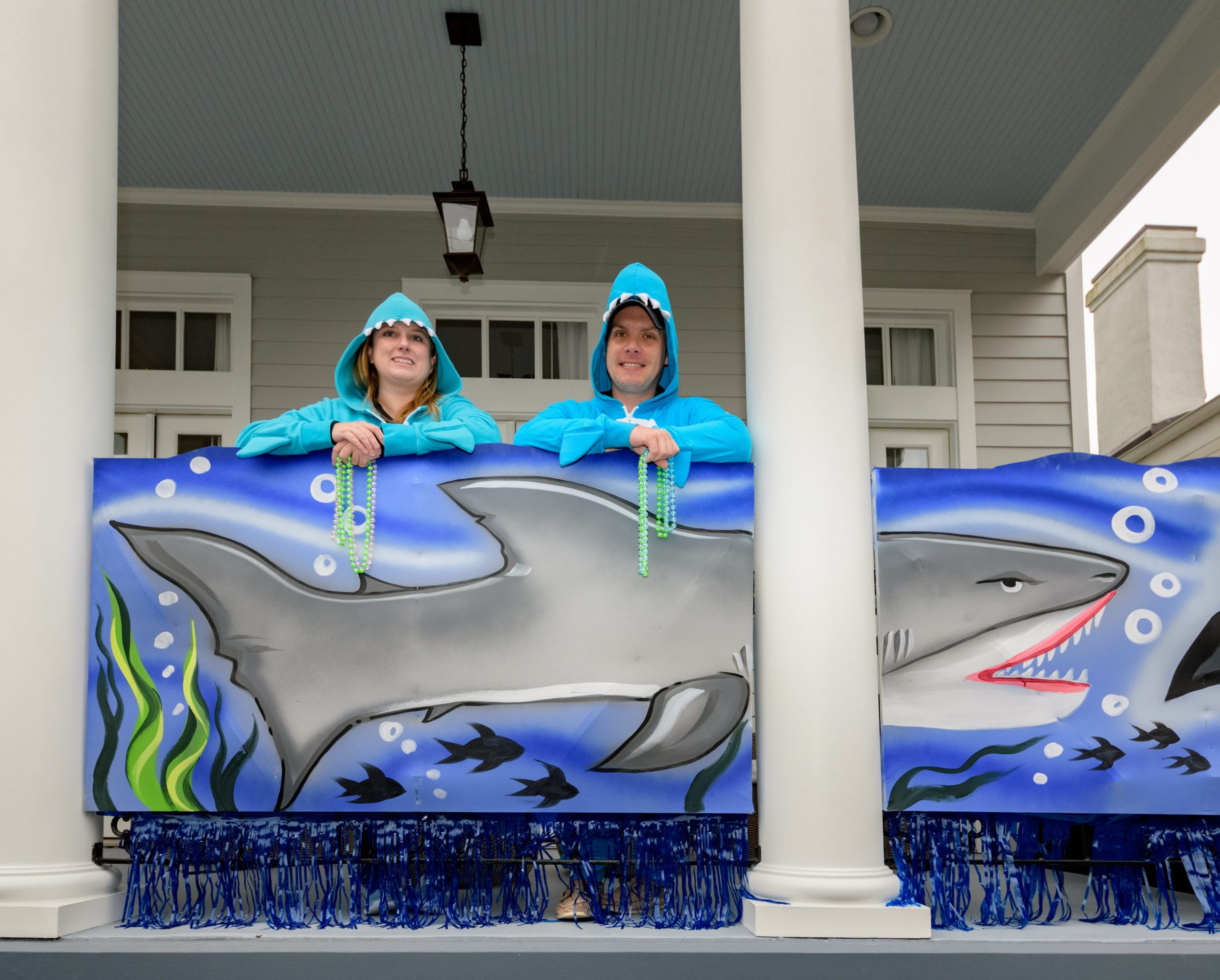 Sharks have been spotted in this pool, but as long as you stay six feet away, you can pick up some free beads and learn some interesting shark facts from the Krewe of Science House at 727 First Street in the Irish Channel. Elizabeth Carter started posting different science topics on her fence during the pandemic including information about COVID-19 and other themes about different animals that live in Louisiana. Carter is an LSU law professor who previously worked in vaccine development after attaining a degree in biology. The Irish Channel neighborhood has chosen Channel Surfing for their theme in the Krewe of House Floats. The Krewe of House Floats is an initiative to decorate homes during the Carnival season because of the cancellation and postponement of parades and gatherings for #MardiGras2021 due to COVID-19 pandemic. Before the pandemic, Carter took part in the satirical Krewe of Tucks parade. Keeping with the channel surfing theme Carter and her husband Adam Swensek chose “Shark Week”. She also has coloring books and toys for kids in the neighborhood along with Mardi Gras beads. The #PorchFloat decorations were created by Crescent City Artists, LLC. #CrescentCityArtists states that they are the first Black-owned Mardi Gras float service providers in Louisiana and are led by a New Orleans husband and wife duo Rene and Inez Pierre. Live everyday like it’s Shark Week. Photo by Matthew Hinton