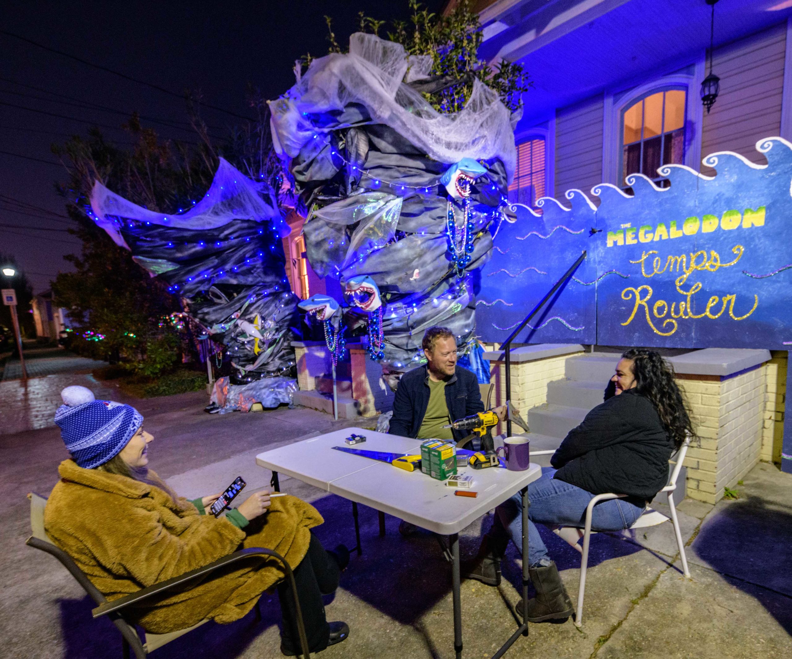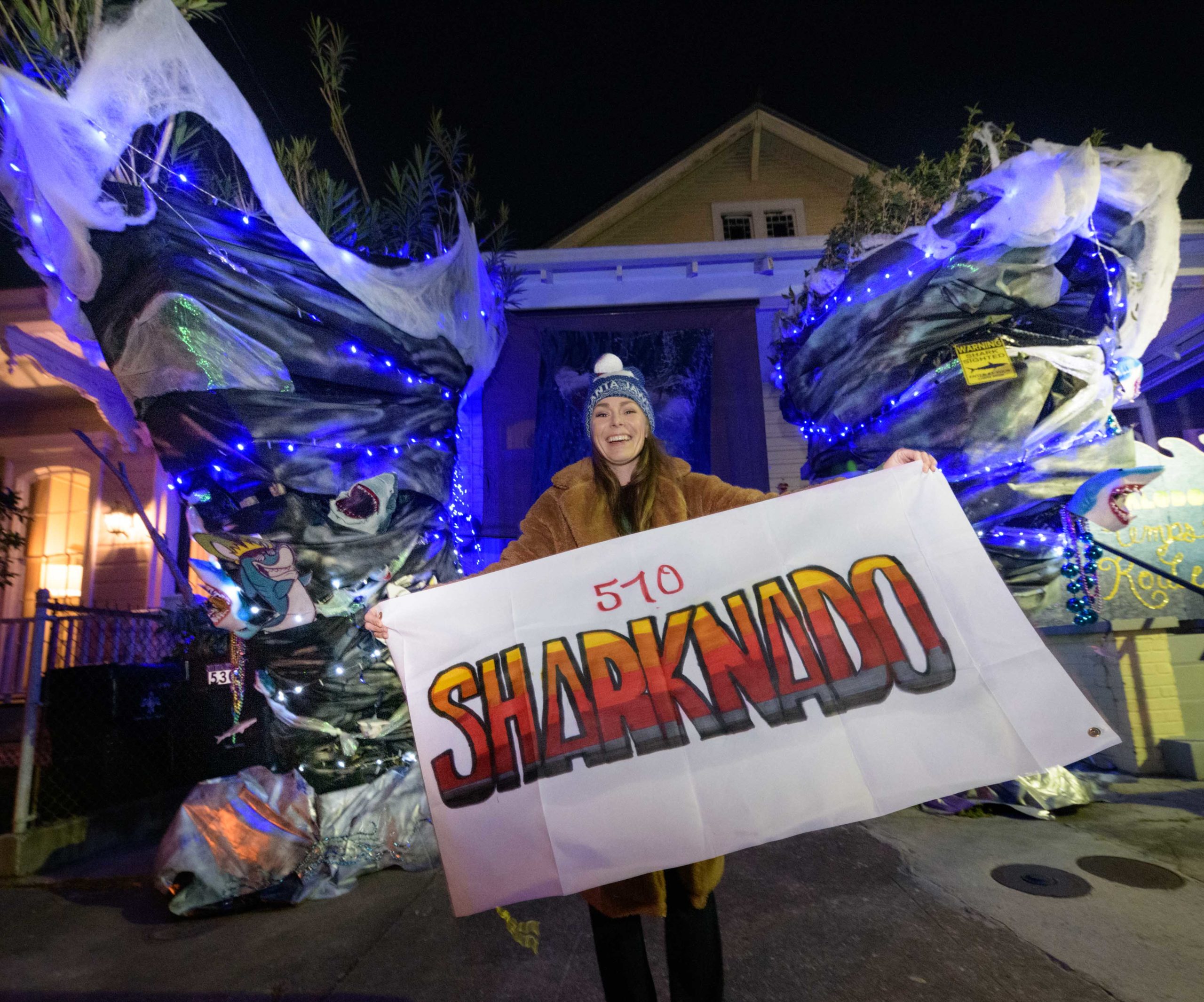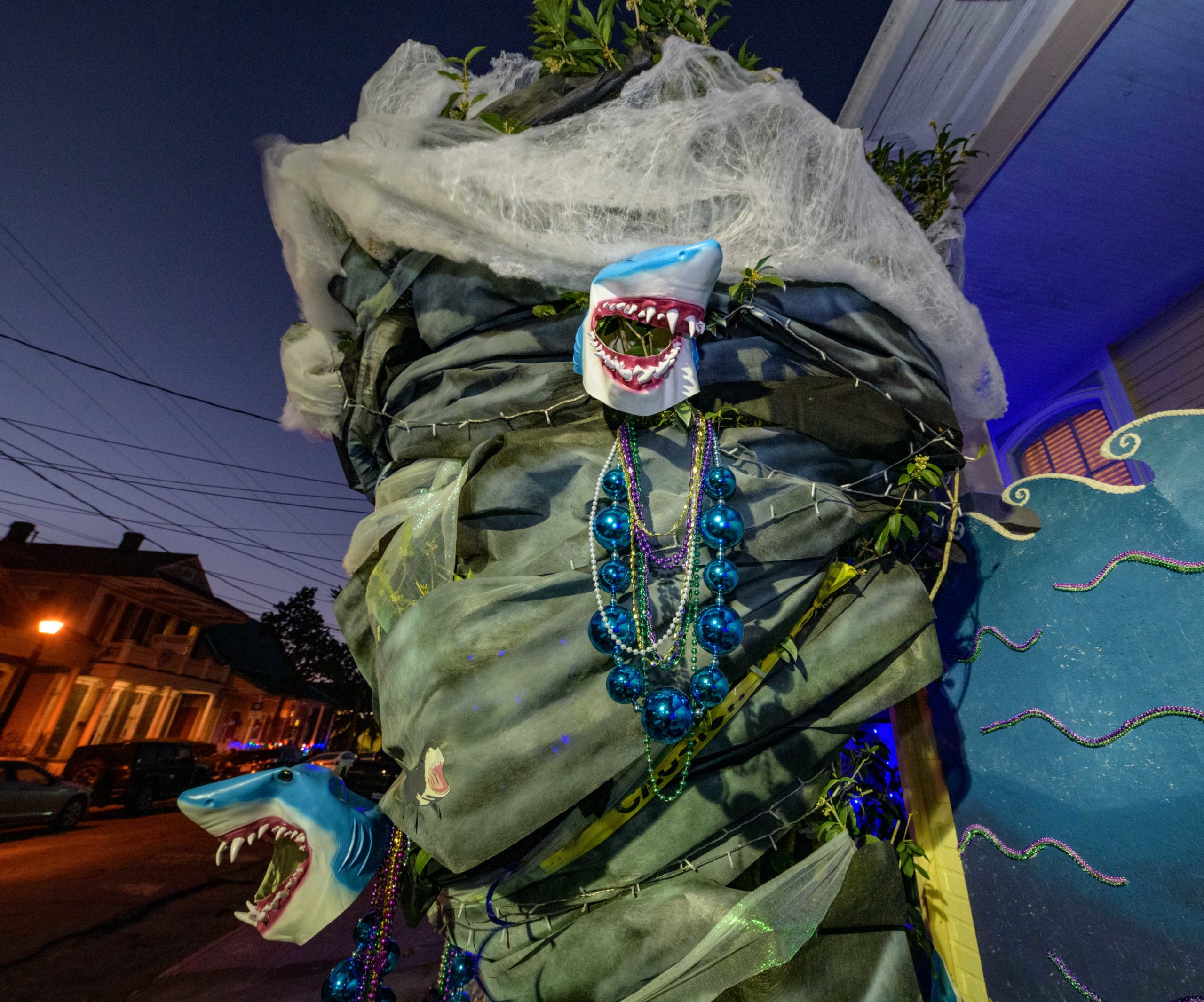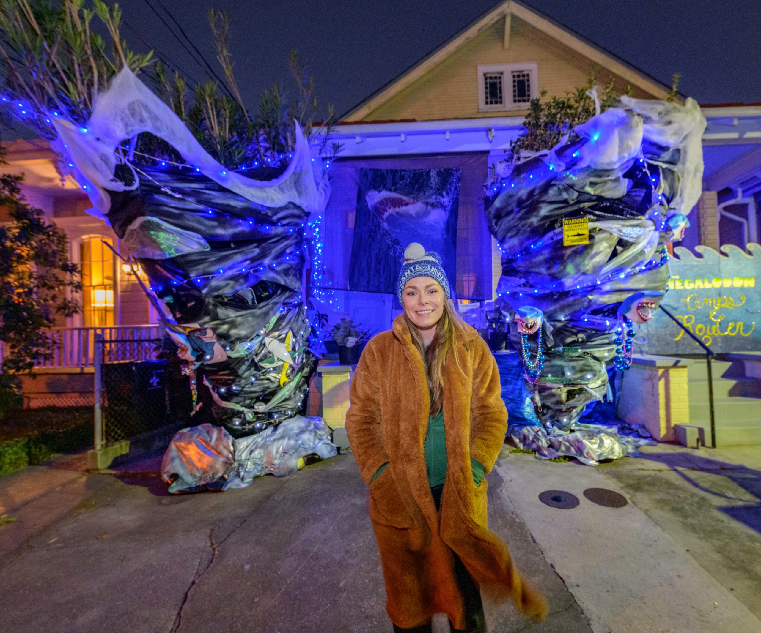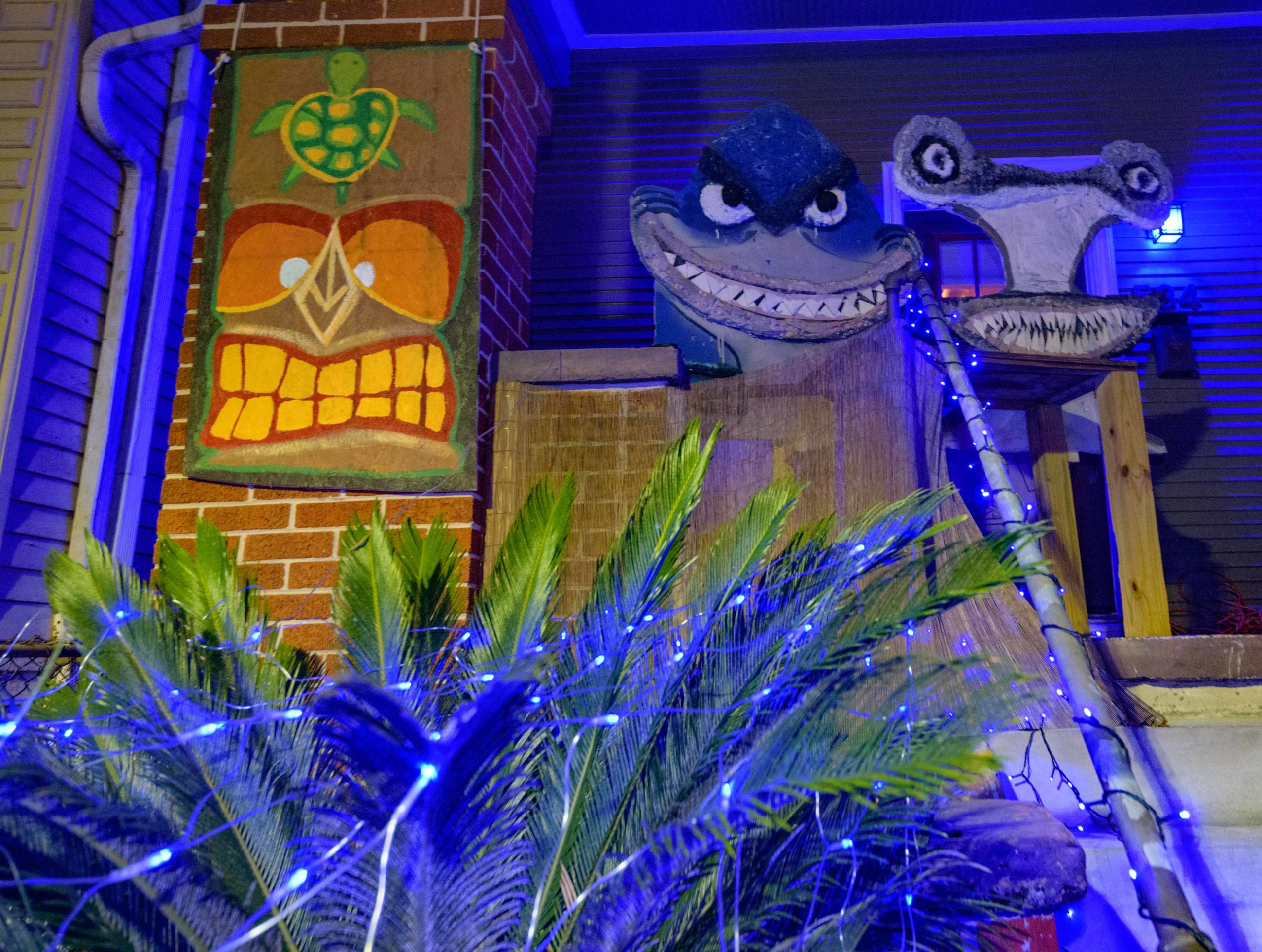 Its a little windy around the home of Katie and Jared Bankens in the 500 block of Seguin St. in Algiers Point due to a Sharknado watch. Taking a suggestion from their neighbor who grew up on the New England coast, where the fictional Amity Island of the movie Jaws is located, the Bankens and their neighbors went for a shark theme for their street and used their tornado-shaped bushes to help create a Sharknado themed house float. One neighbor also has a Jaws theme and another has a shark Tiki bar. Jared Bankens grew up in Lake Charles and his next door neighbors had to relocate from there because of the damage from Hurricane Laura. They painted their house as The Megalodon Temps Rouler a play on the phrase Les Bon Temps Rouler and the movie The Meg. The Krewe of House Floats is an initiative to decorate homes during the Carnival season because of the cancellation and postponement of parades and gatherings for #MardiGras2021 due to the COVID-19 pandemic. Photo by Matthew Hinton