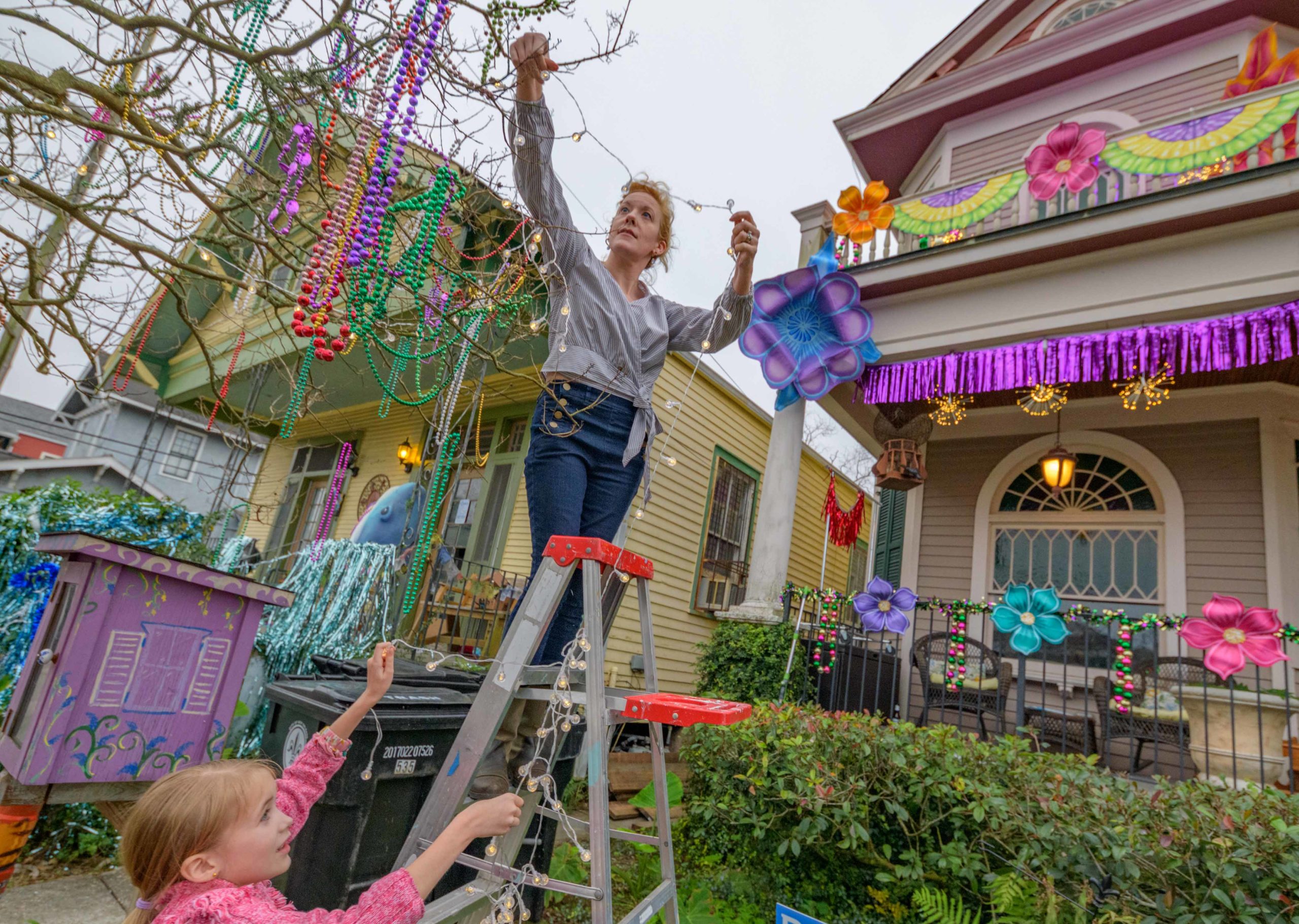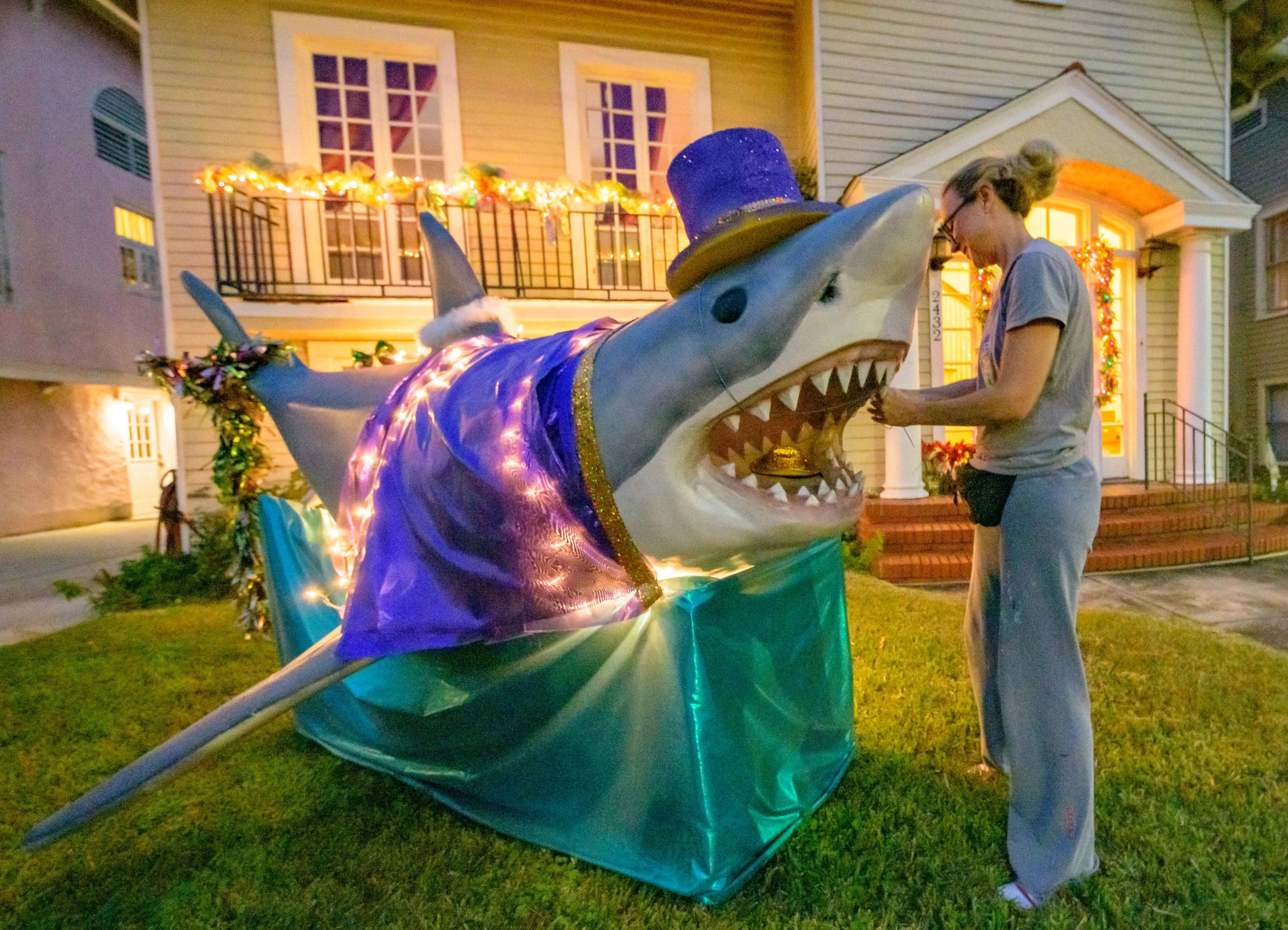Kelly Thompson and her daughter Emelia Thompson string lights on their home that is surrounded by sharks on the 500 block of Seguin Street in Algiers Point.Photo by Matthew Hinton