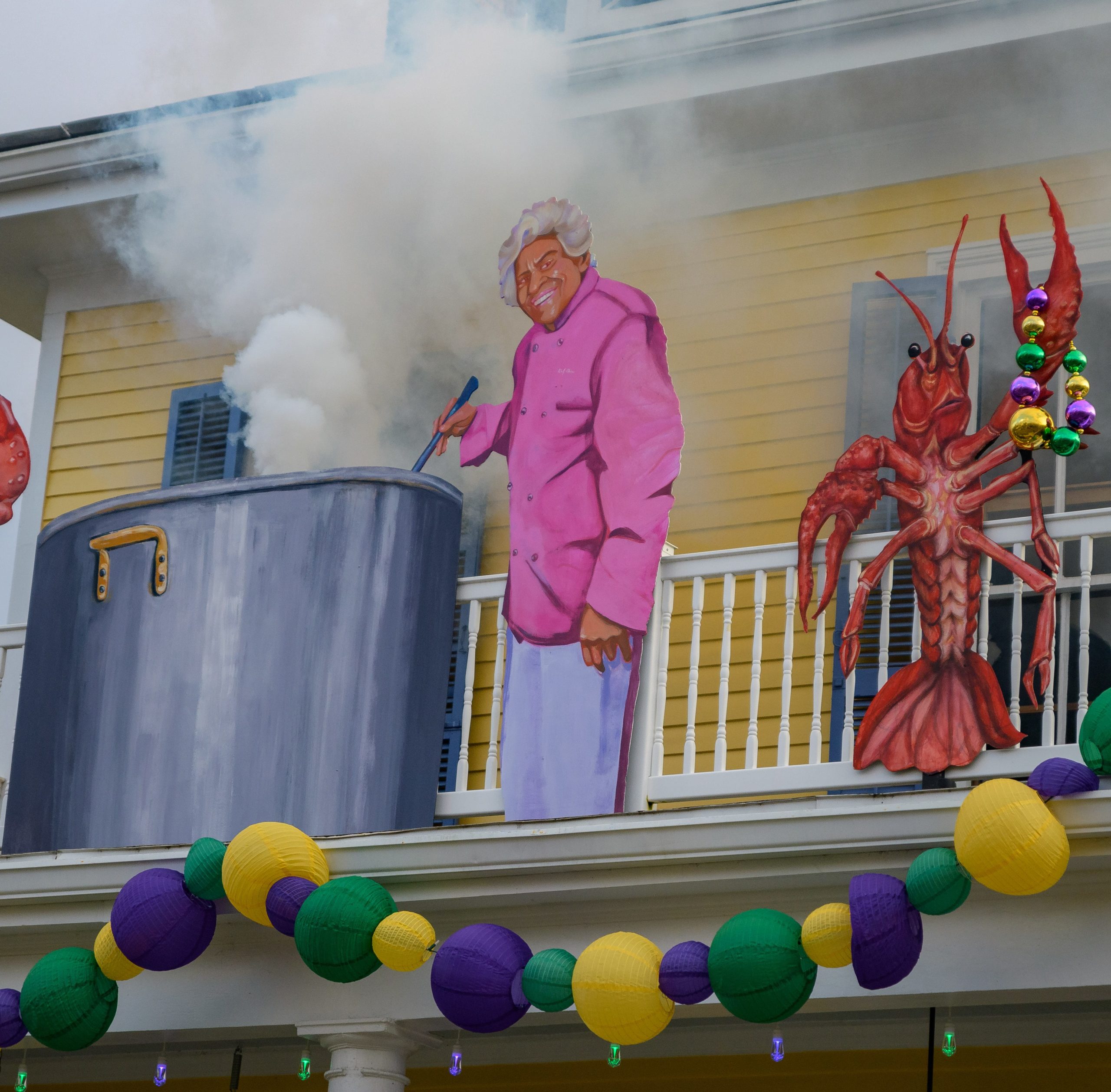 The house at 2918 Bell Street celebrates Chef Leah Chase complete with a smoke machine to simulate her cooking a big pot of gumbo in the Bayou St. John neighborhood in New Orleans, Sunday, Jan. 24, 2021. The house float is home to Mark Douce, his wife Alistair Johnson, and their son Sawyer Douce. The float is part of a theme for the street called Belles of the Bayou, celebrating important women in New Orleans history. Other homes on the street celebrate Voodoo practitioner Marie Laveau, singer Mahalia Jackson, and Baroness Pontalba, with others to feature performer Chris Owens and author Anne Rice. The porch decorations were created by the Stronghold Studios, a New Orleans entertainment display and prop company, with Douce creating the smoke. Photo by Matthew Hinton