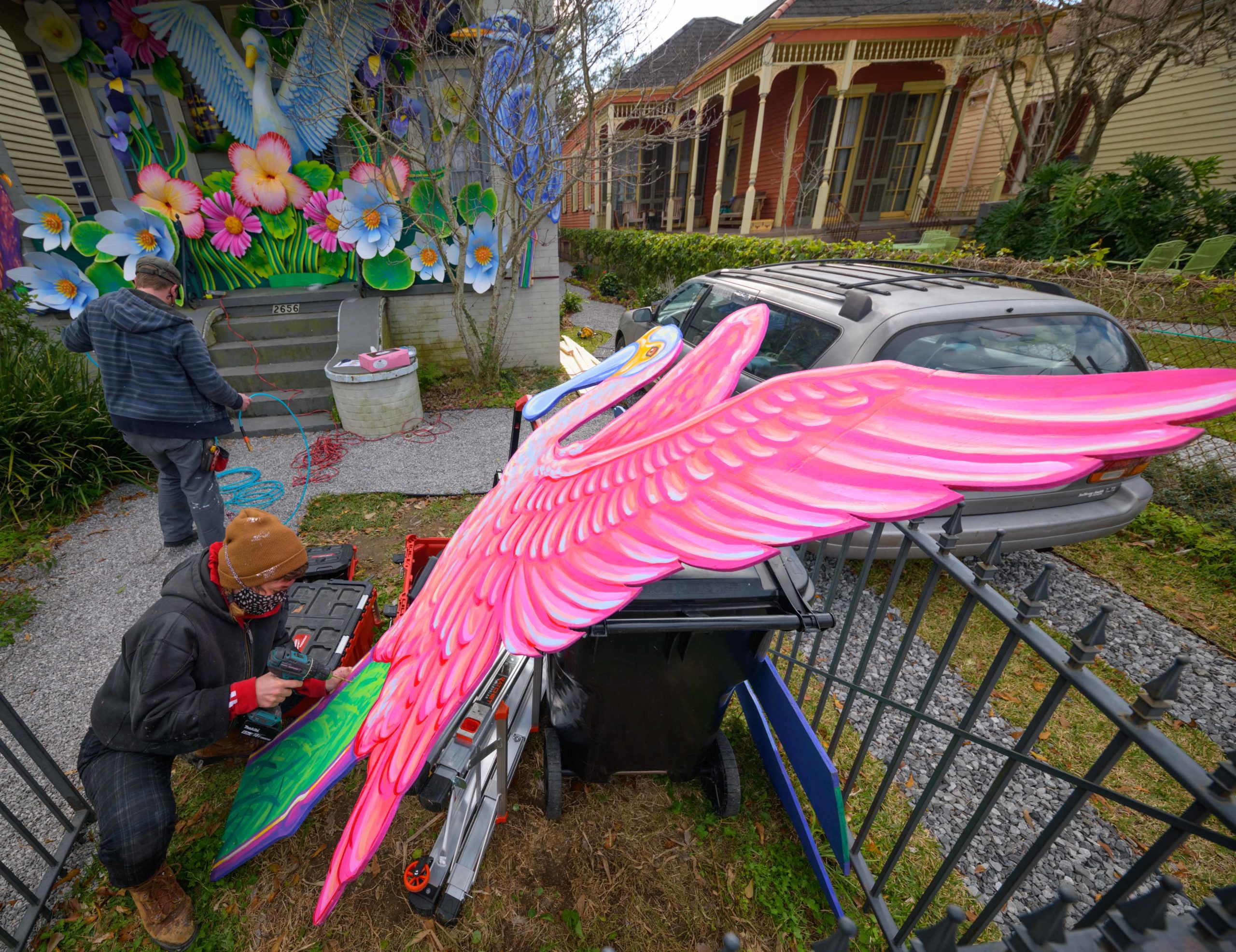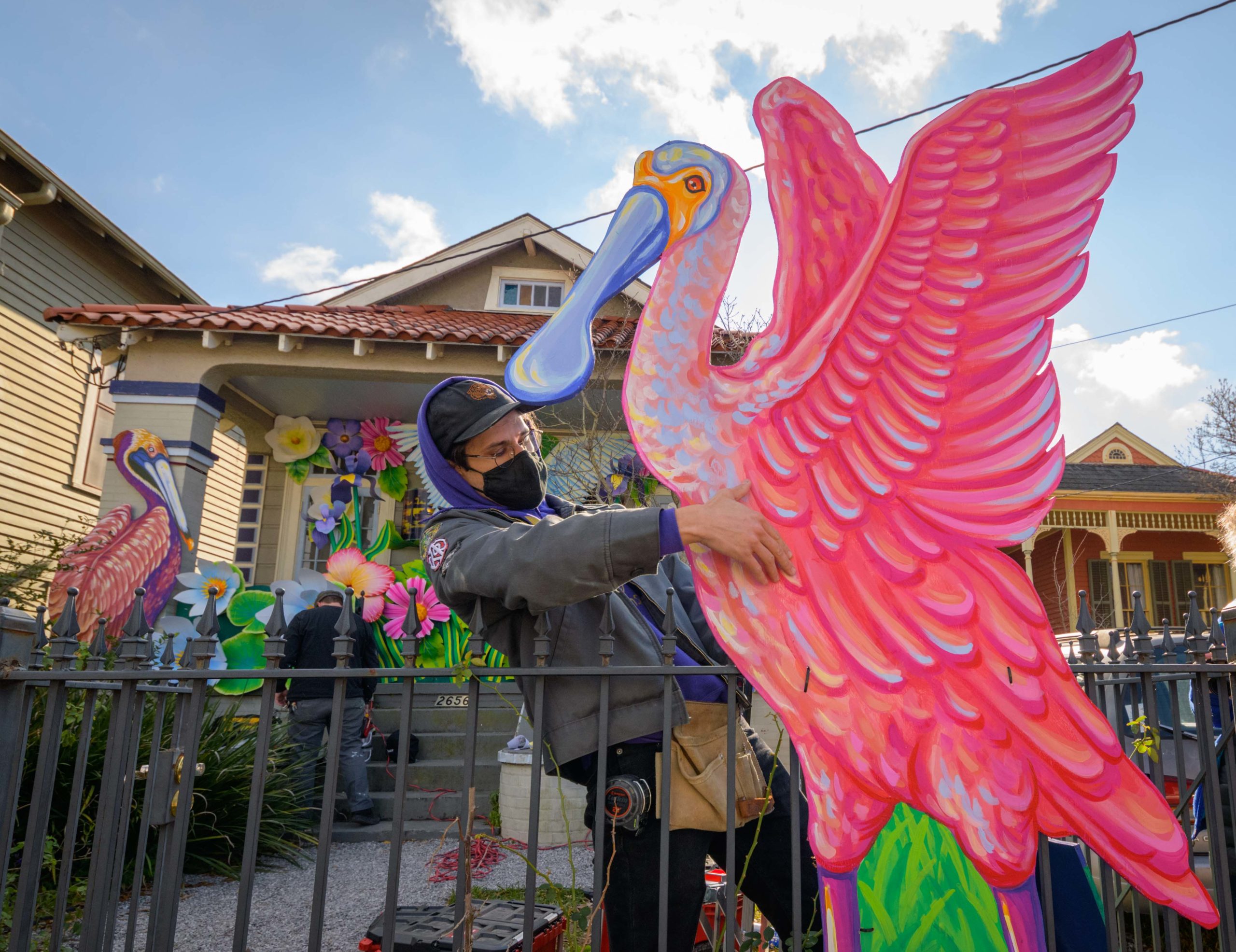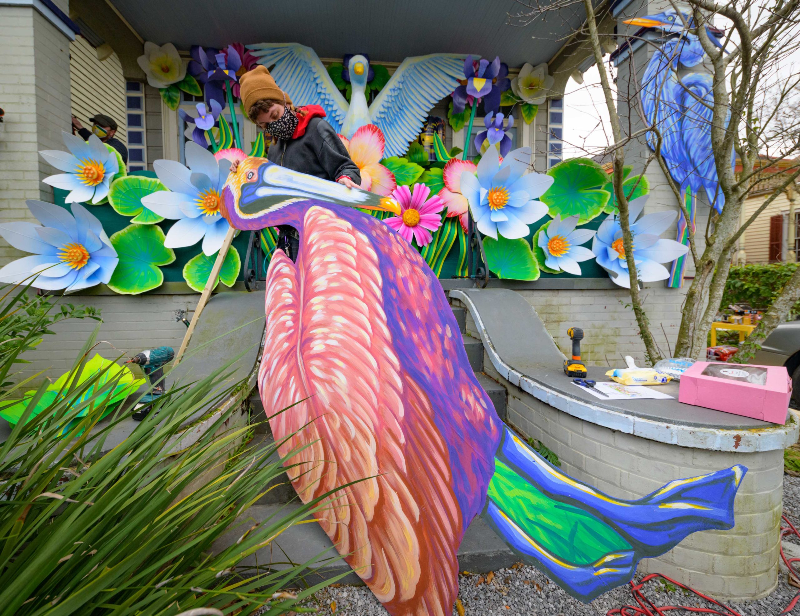 Mardi Gras float artists Chelsea Kamm, brown hat, Joey Mercer, yellow mask, and Travis Keene, purple hoodie, help construct a house float designed by Caroline Thomas, enjoying a piece of pink King Cake, for Hire a Mardi Gras Artist a project of the Krewe of Red Beans. This float on 2656 LePage St. in the Fair Grounds neighborhood celebrates local wildlife and is called The Birds of Bulbancha. Residents who live in Orleans Parish and donate to the project are entered into the raffle to get one of the house floats and this float went to a raffle winner in the Fairgrounds neighborhood of New Orleans. The grassroots effort hopes to build 40 house floats for every $15,000 donated. The donations go towards supplies and hiring float artists, many who are out-of-work because of the cancellation of Mardi Gras and Carnival parades due to the COVID-19 pandemic. In addition to the three artists putting the float together many other artists helped sculpt and construct the birds and flowers for the float. Bulbancha is Choctaw word meaning place of many tongues, and was the name the indigenous people called the trading port in what is now New Orleans before the arrival of European colonists. The birds include a Great Egret, the centerpiece sculpture, and panels of a Great Blue Heron, Brown Pelican, Whooping Crane, and Roseate Spoonbill. Photo by Matthew Hinton