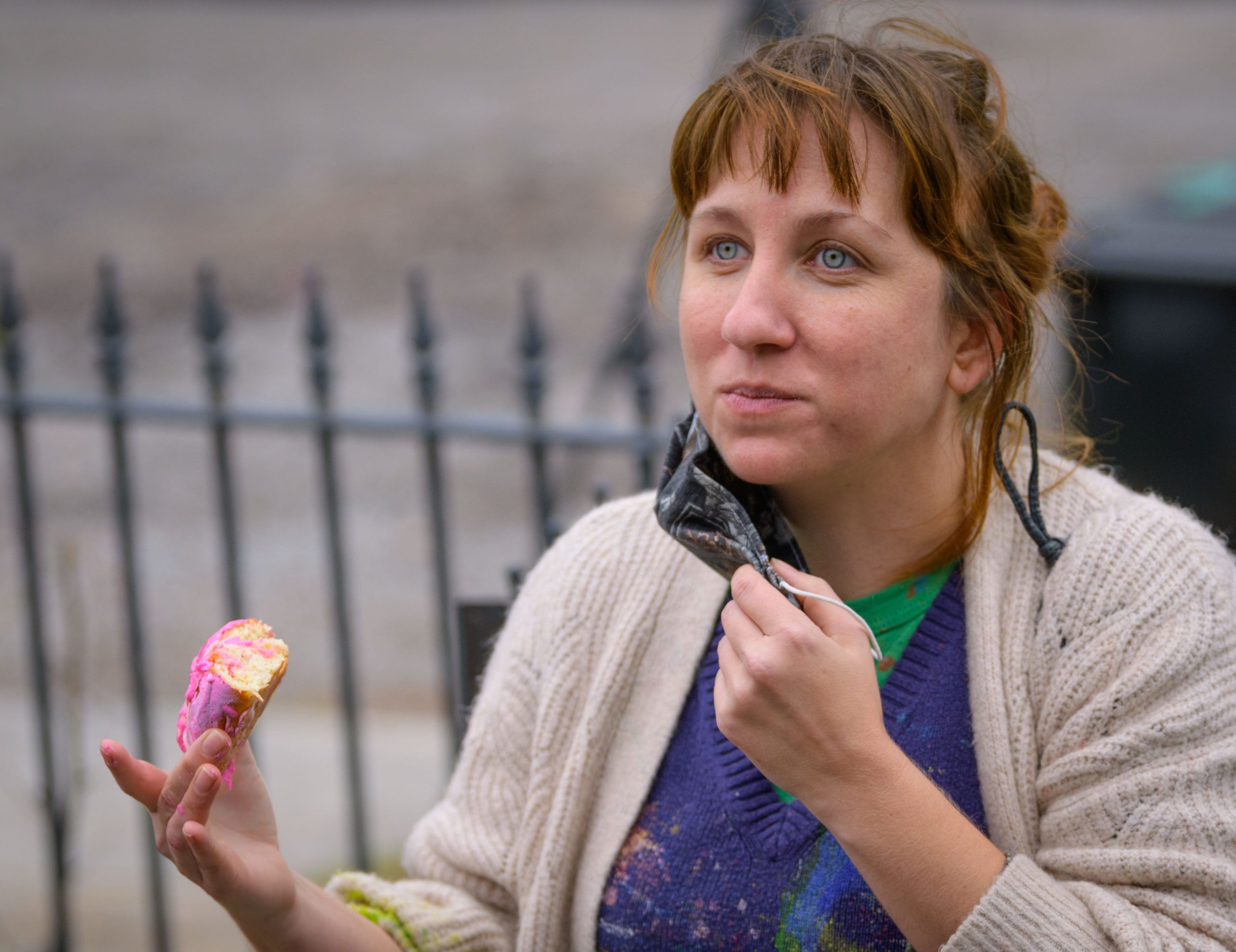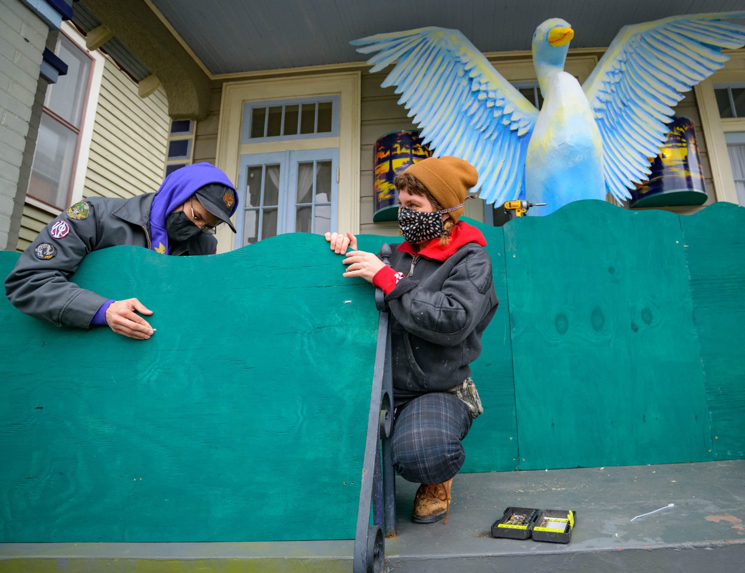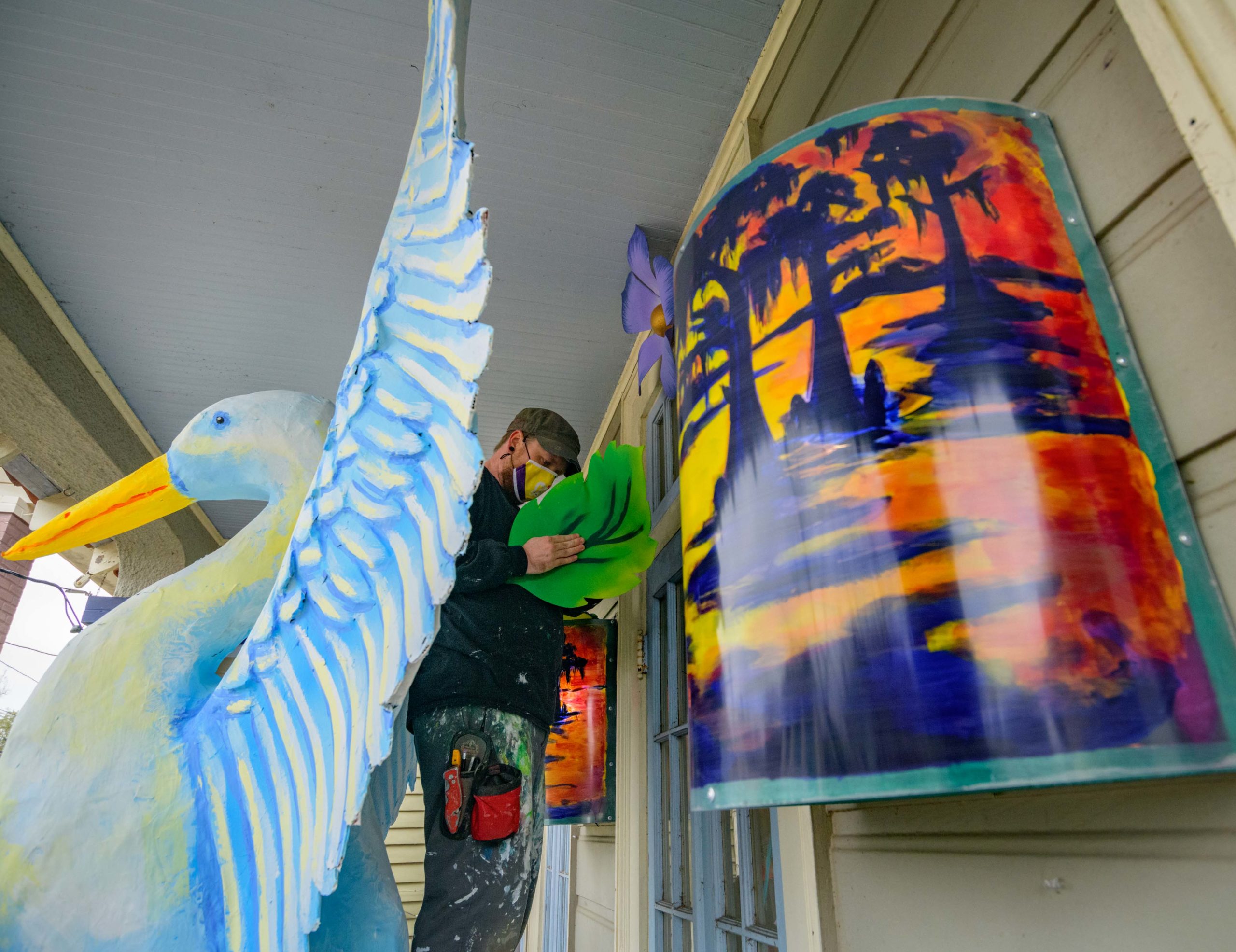 Mardi Gras float artists Chelsea Kamm, brown hat, Joey Mercer, yellow mask, and Travis Keene, purple hoodie, help construct a house float designed by Caroline Thomas, enjoying a piece of pink King Cake, for Hire a Mardi Gras Artist a project of the Krewe of Red Beans. This float on 2656 LePage St. in the Fair Grounds neighborhood celebrates local wildlife and is called The Birds of Bulbancha. Residents who live in Orleans Parish and donate to the project are entered into the raffle to get one of the house floats and this float went to a raffle winner in the Fairgrounds neighborhood of New Orleans. The grassroots effort hopes to build 40 house floats for every $15,000 donated. The donations go towards supplies and hiring float artists, many who are out-of-work because of the cancellation of Mardi Gras and Carnival parades due to the COVID-19 pandemic. In addition to the three artists putting the float together many other artists helped sculpt and construct the birds and flowers for the float. Bulbancha is Choctaw word meaning place of many tongues, and was the name the indigenous people called the trading port in what is now New Orleans before the arrival of European colonists. The birds include a Great Egret, the centerpiece sculpture, and panels of a Great Blue Heron, Brown Pelican, Whooping Crane, and Roseate Spoonbill. Photo by Matthew Hinton