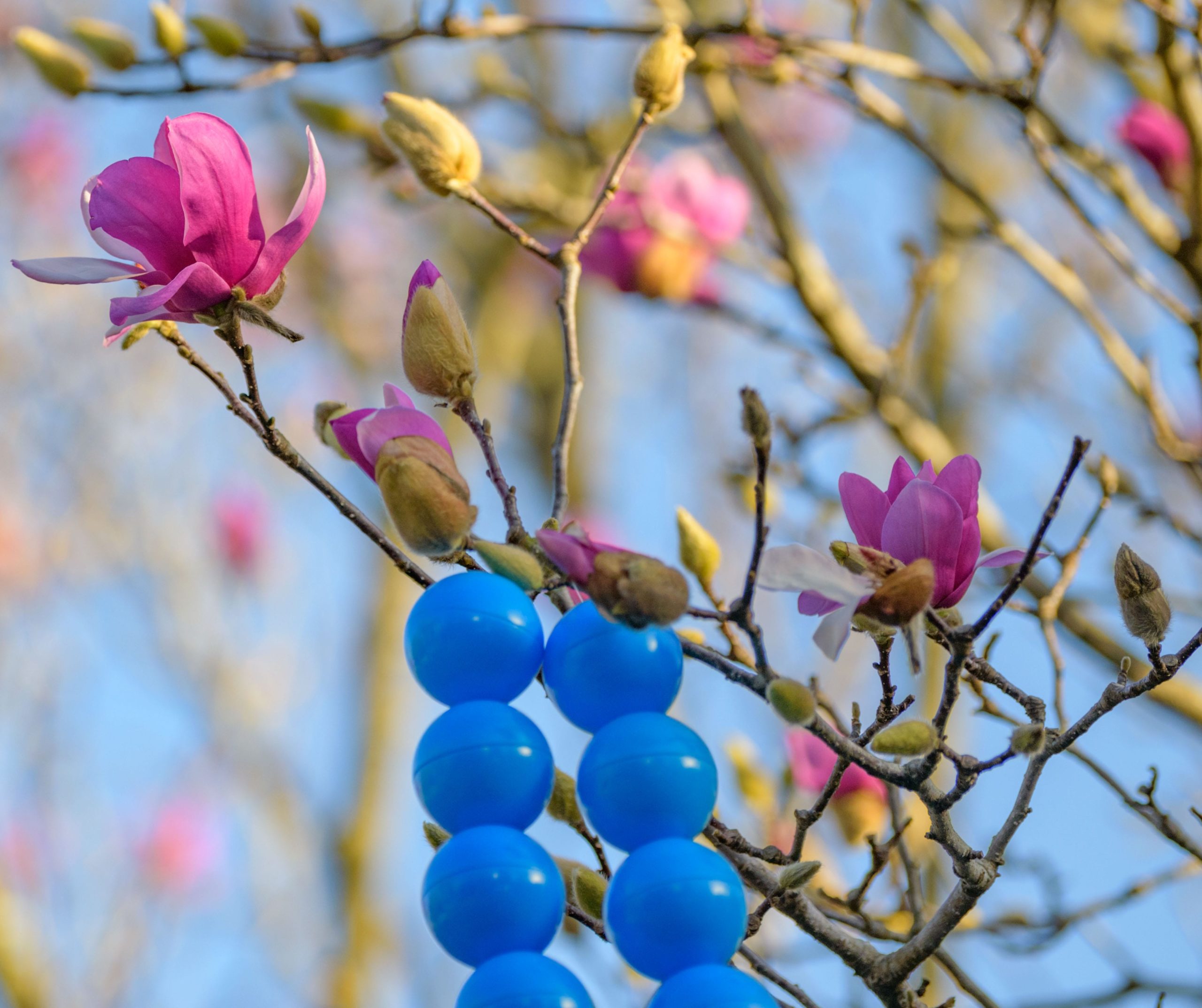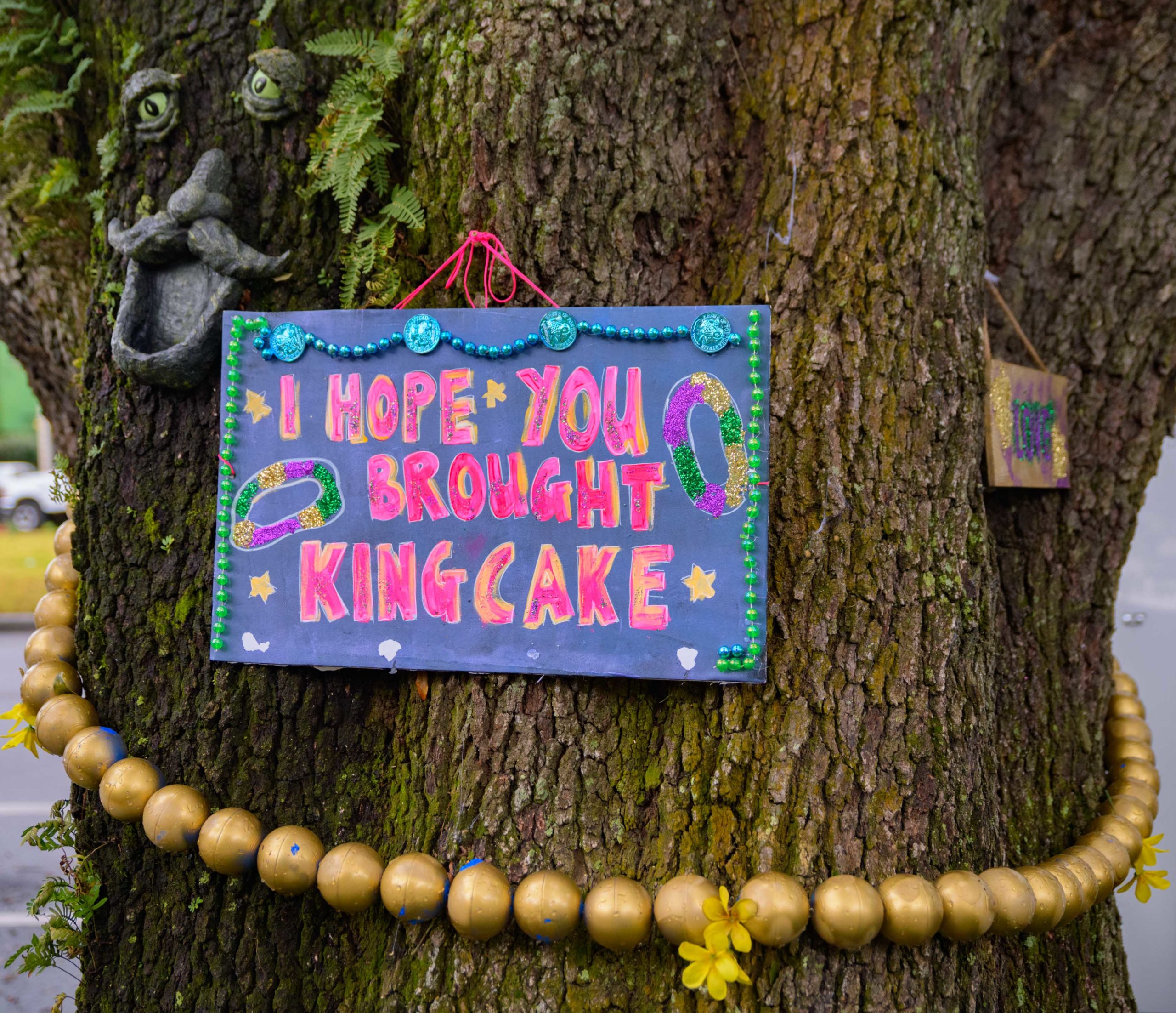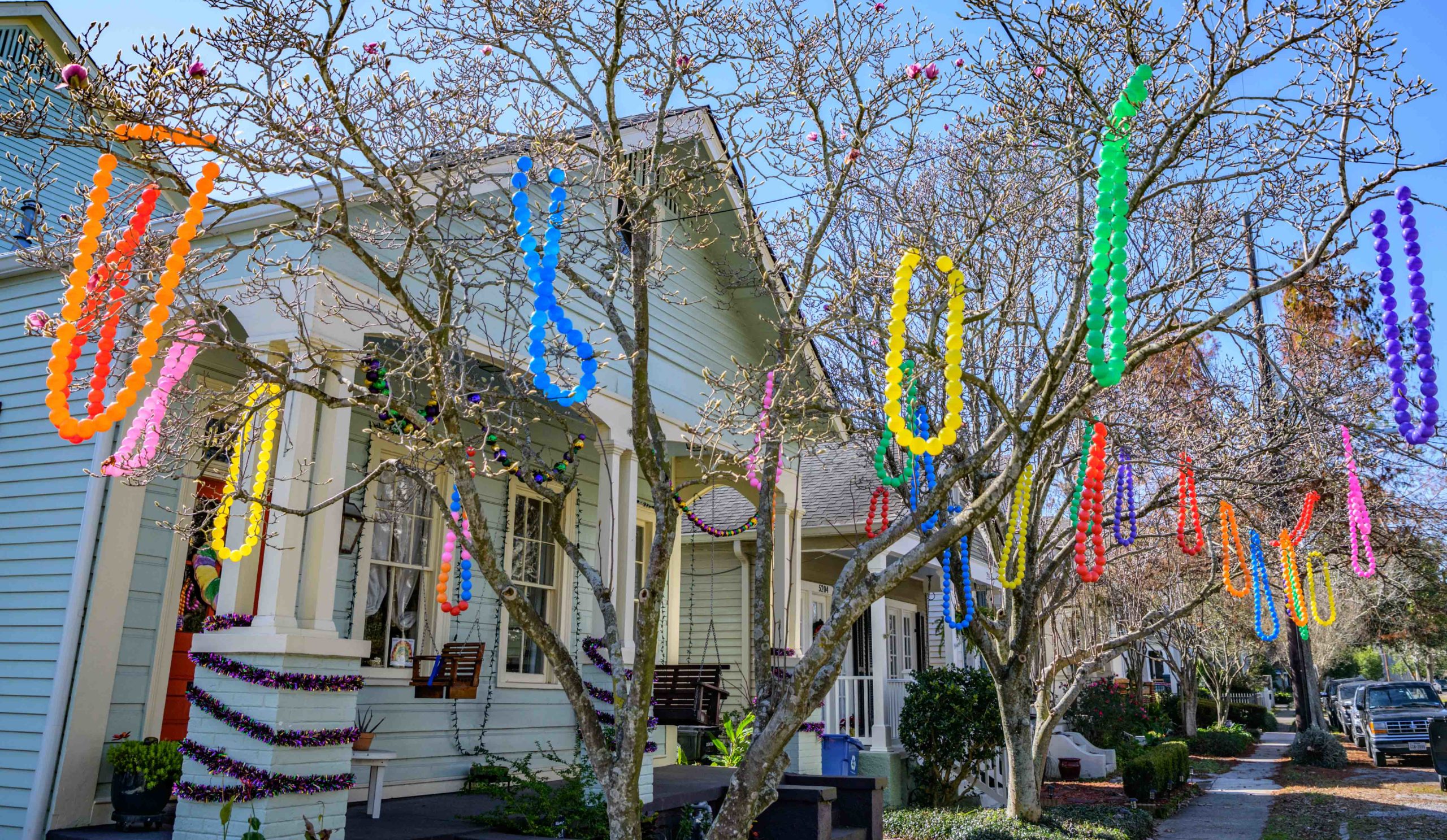 Cherry blossoms begin to bloom by big beads in the trees at 5202 Chestnut St. in the Audubon / Riverside neighborhood of New Orleans. Photo by Matthew Hinton