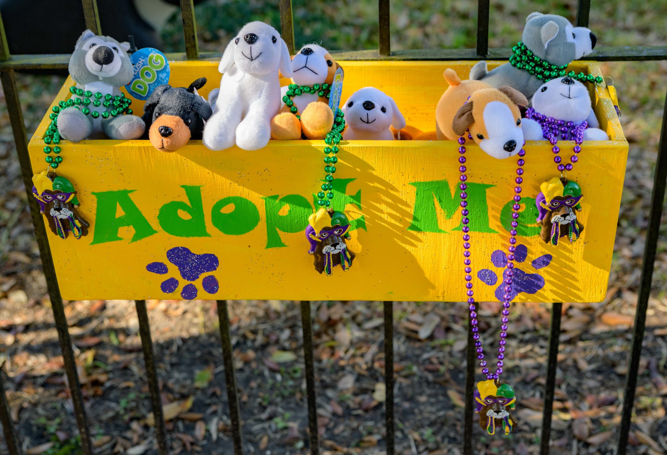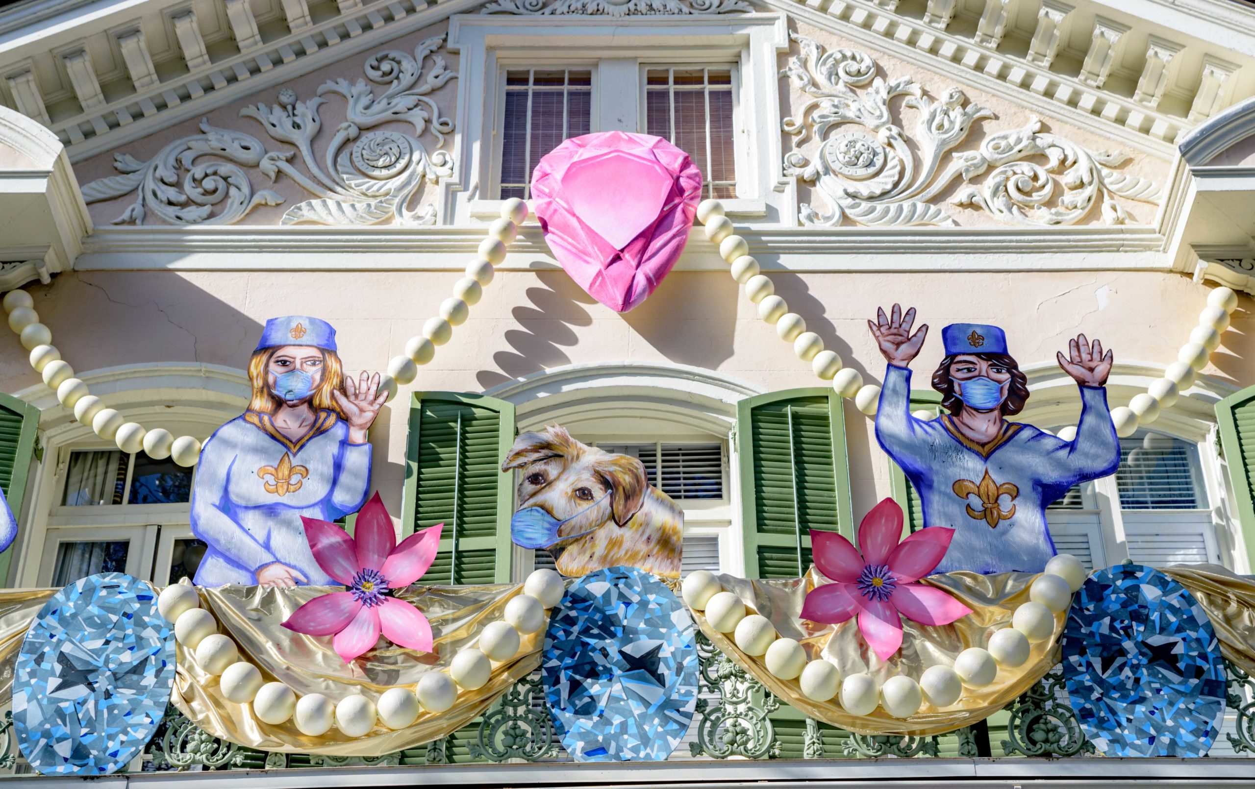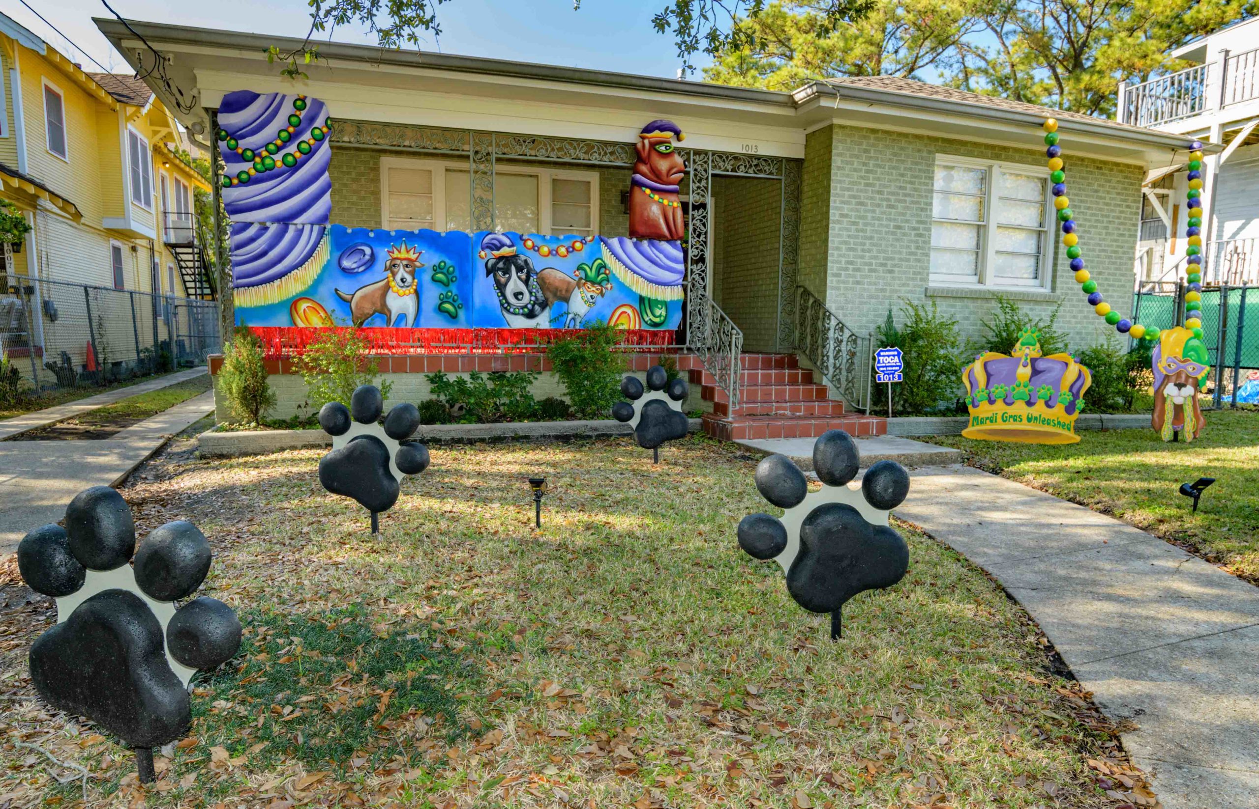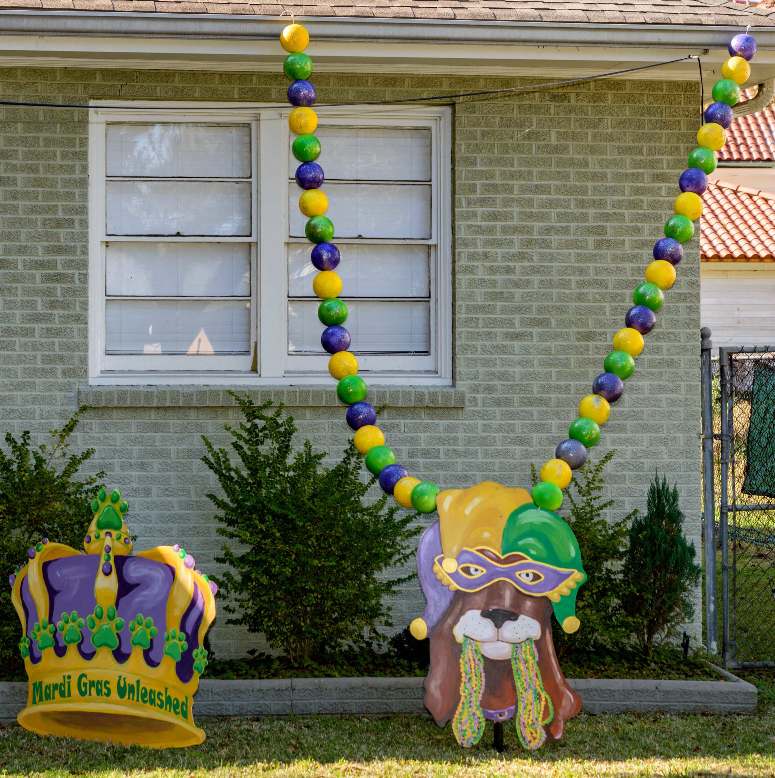 These puppies are free to a good home in front of a City Park neighborhood house decorated with the theme Mardi Gras Unleashed, at the corner of Carrollton and City Park Ave. The home features a #PorchFloat created by Crescent City Artists, LLC. #CrescentCityArtists states that they are the first Black-owned Mardi Gras float service providers in Louisiana and are led by a New Orleans husband and wife duo Rene and Inez Pierre. The beads and crown were created by Stronghold Studios. The group has created several porch floats to fit on balconies and porches for the Krewe of House Floats, an initiative to decorate homes during the Carnival season because of the cancellation and postponement of parades and gatherings for Mardi Gras 2021 due to COVID-19 pandemic. Photo by Matthew Hinton