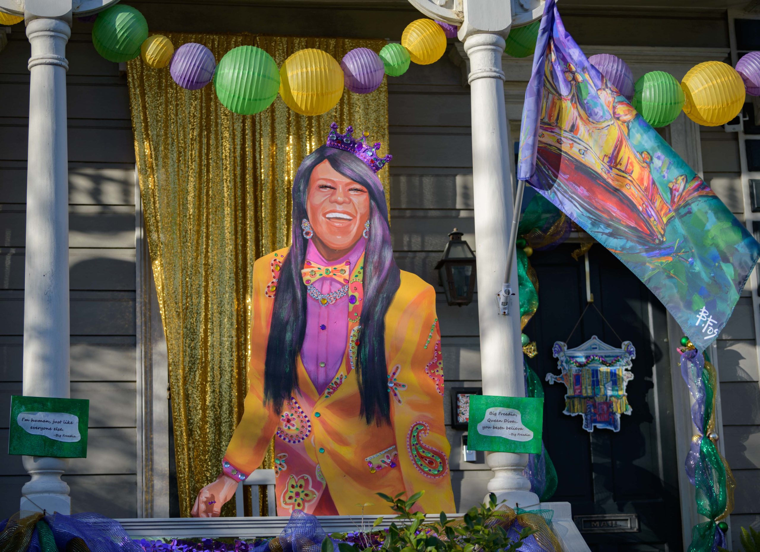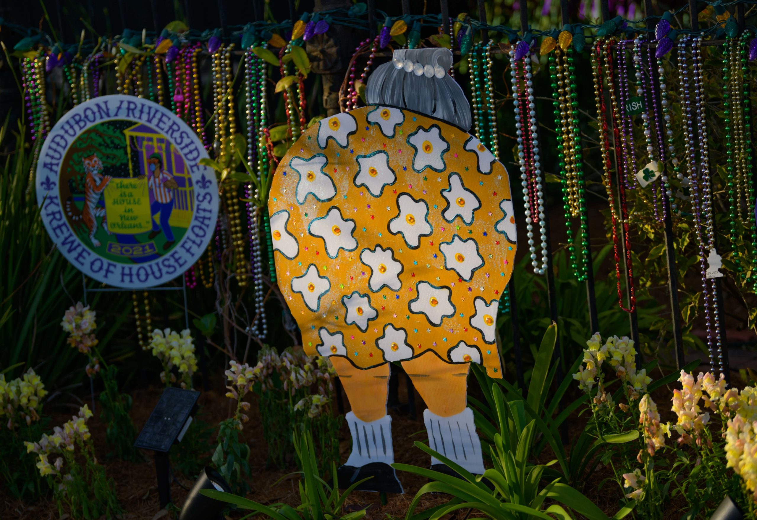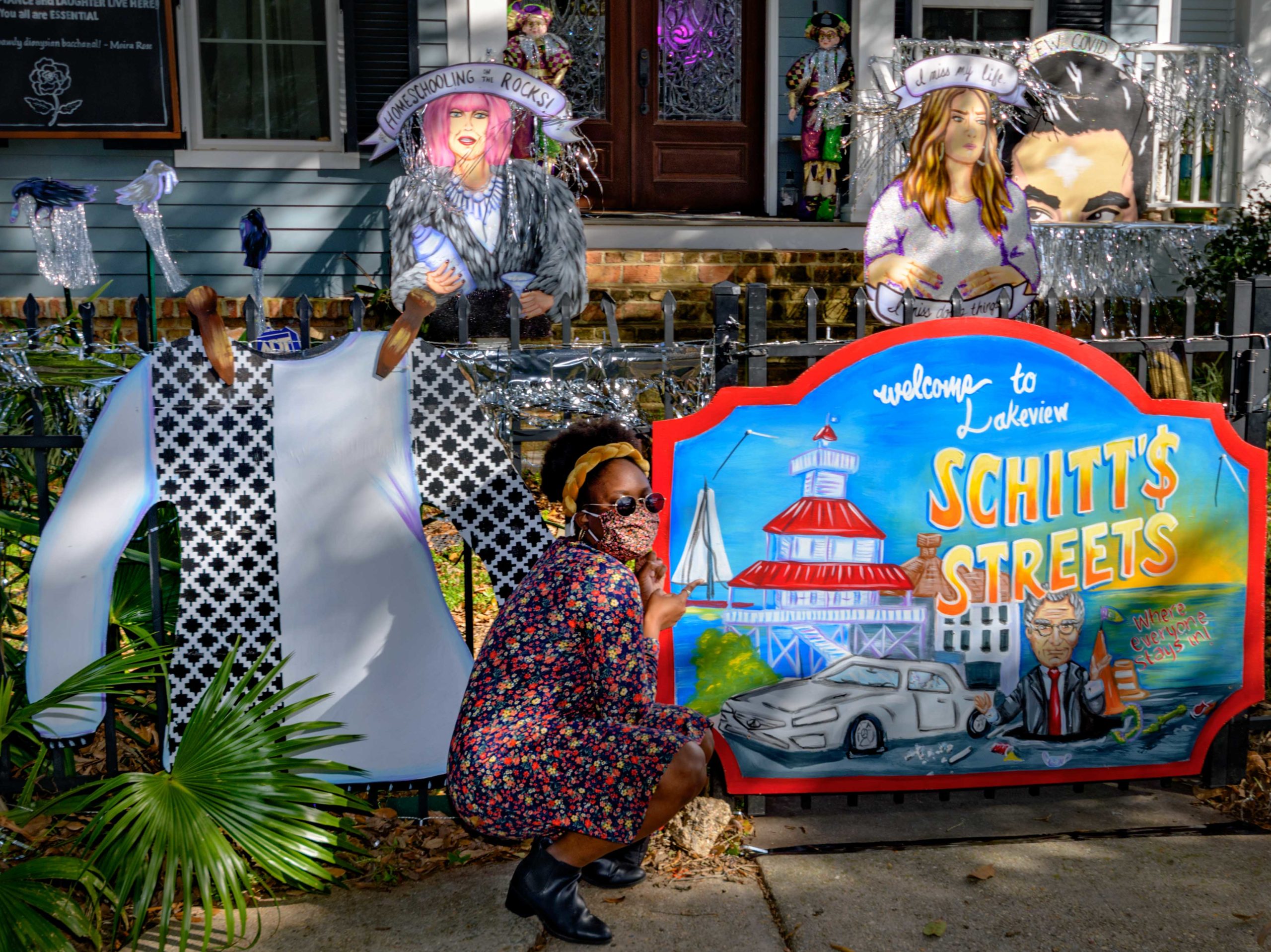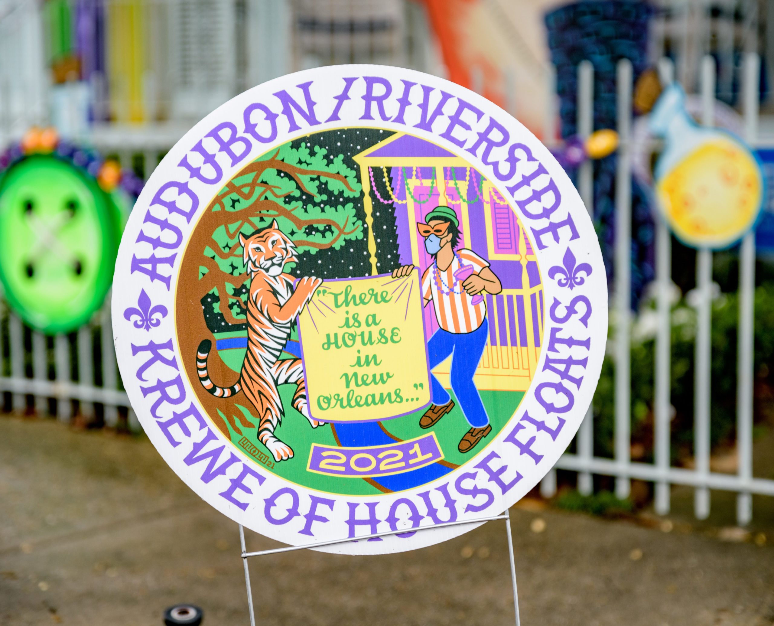 These puppies are free to a good home in front of a City Park neighborhood house decorated with the theme Mardi Gras Unleashed, at the corner of Carrollton and City Park Ave. The home features a #PorchFloat created by Crescent City Artists, LLC. #CrescentCityArtists states that they are the first Black-owned Mardi Gras float service providers in Louisiana and are led by a New Orleans husband and wife duo Rene and Inez Pierre. The beads and crown were created by Stronghold Studios. The group has created several porch floats to fit on balconies and porches for the Krewe of House Floats, an initiative to decorate homes during the Carnival season because of the cancellation and postponement of parades and gatherings for Mardi Gras 2021 due to COVID-19 pandemic. Photo by Matthew Hinton