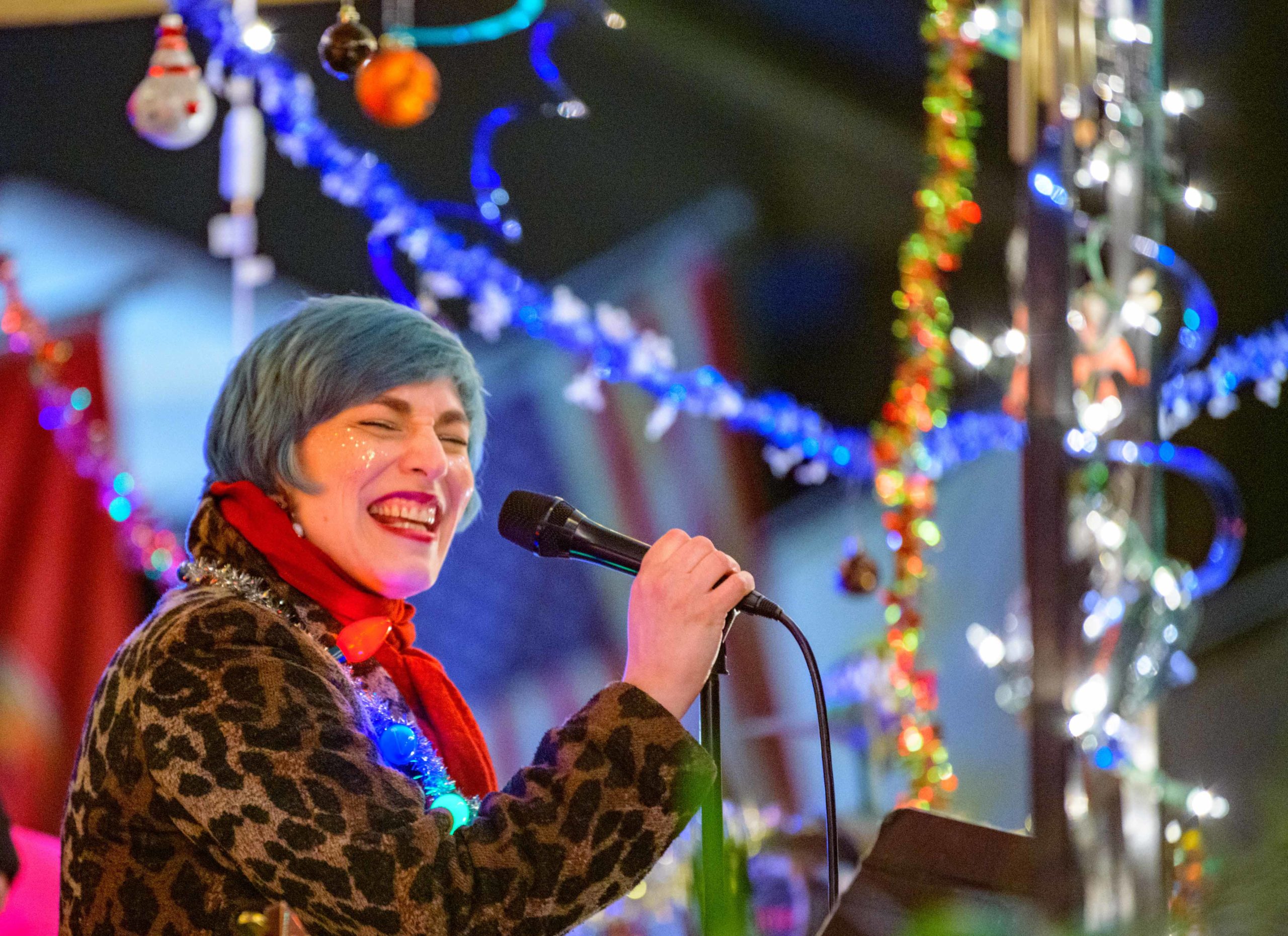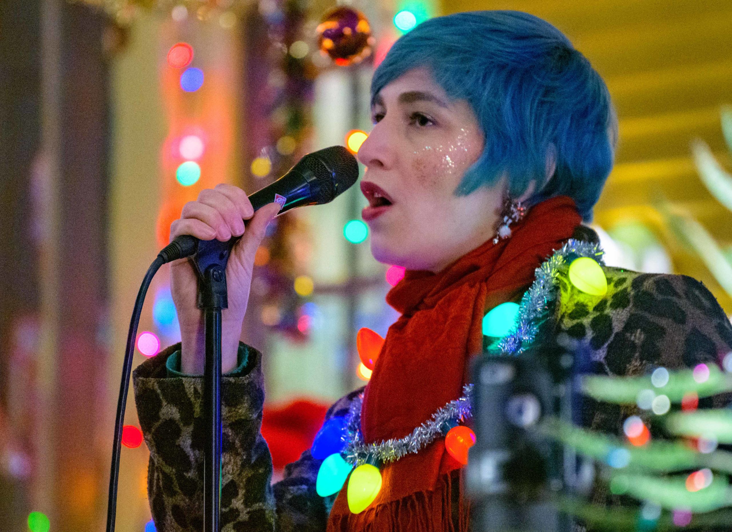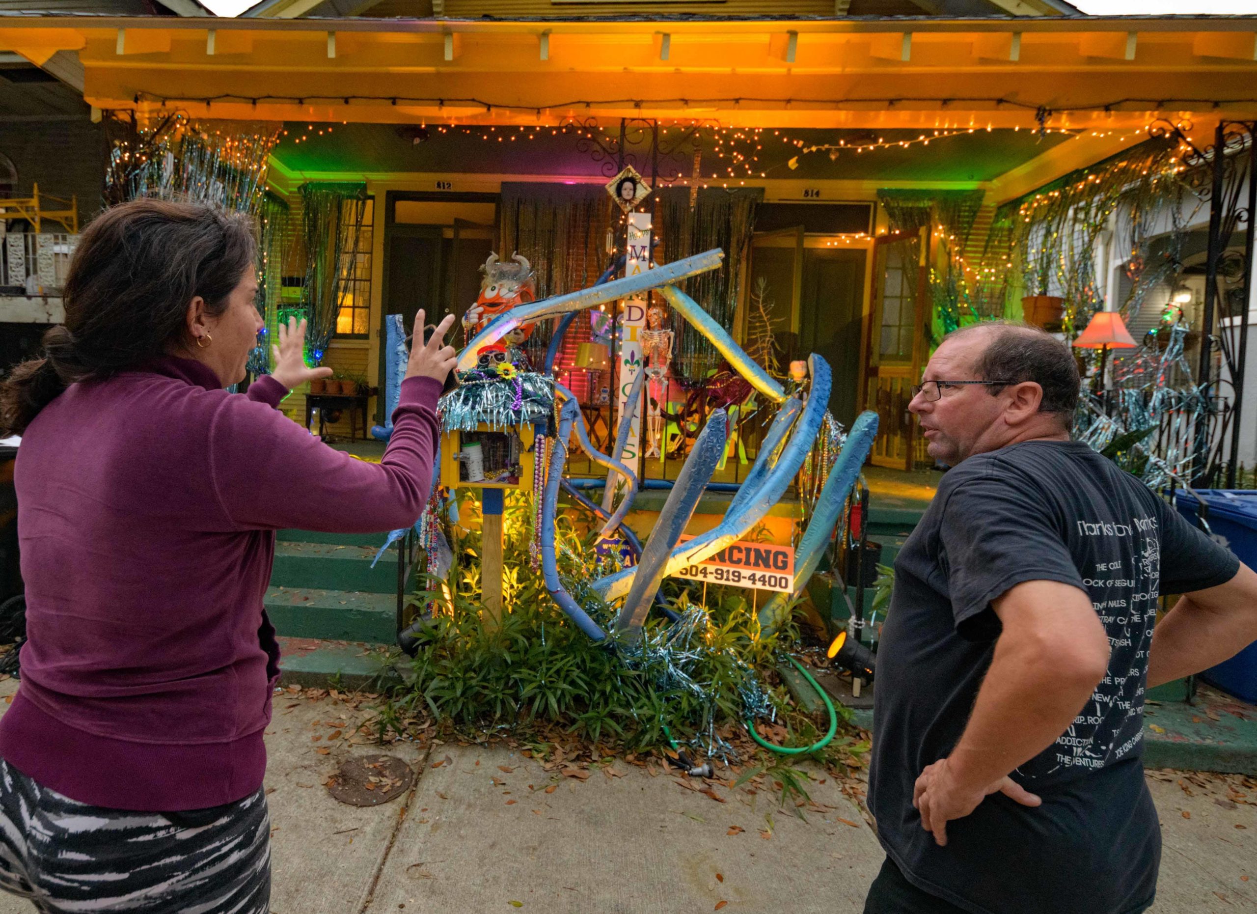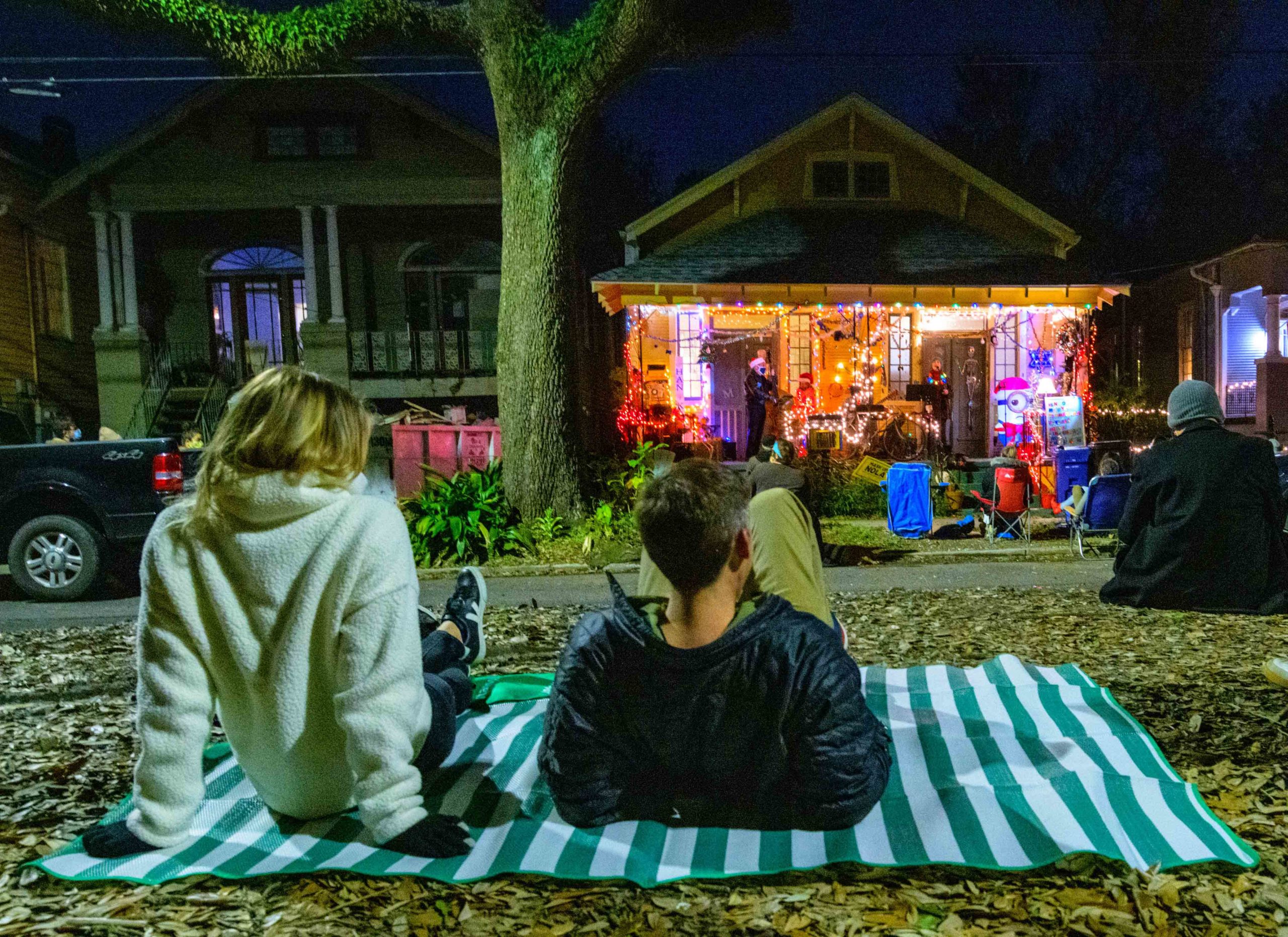 One of the beautiful things about New Orleans is you can unexpectedly find art by driving through a neighborhood causing you to make a quick U-turn. Sometimes youll make a couple of U-turns in the same place at different times. Maria Clark lives in the 800 block of Opelousas Ave. where she has made a house float she calls The Outer Limits of Boredom, in New Orleans, Tuesday, Jan. 26, 2021. The theme refers to the Sci Fi and fantasy TV show from the 1960s and to staying at home a lot because of the COVID-19 pandemic. The house features a bunch of tentacles, a horned M&Ms Viking, and squid skeletons. Some of the items were used for Halloween and Christmas. Back at Christmas time Singer Meryl Zimmerman sang holiday tunes to her neighbors in the Algiers Point neighborhood in New Orleans, Friday, Dec. 18, 2020, the last night of Hanukkah. For her Christmas Jazz in the Point concert on the porch, she was accompanied by Loyola Jazz Bass Professor Ed Wise and Eric Merchant on guitar. They played for socially distanced music lovers on the neutral ground and the front lawn on Opelousas Ave. Zimmerman said I want to give a shout out to my new neighborhood Algiers Point, its a fairytale land of wonders. Clark designed the house herself but had help from Rzi Stage Lighting to light the house at night. Photo by Matthew Hinton