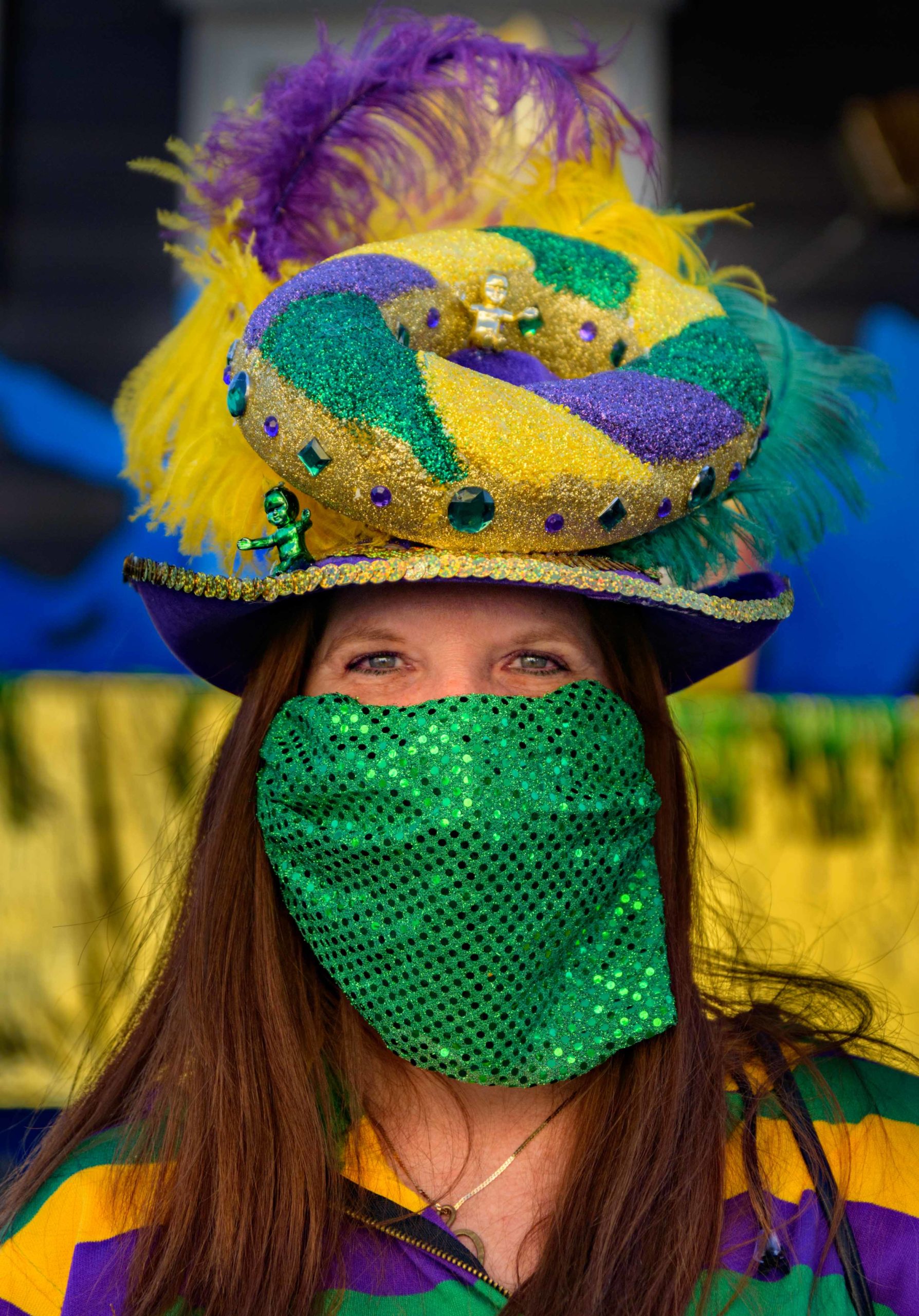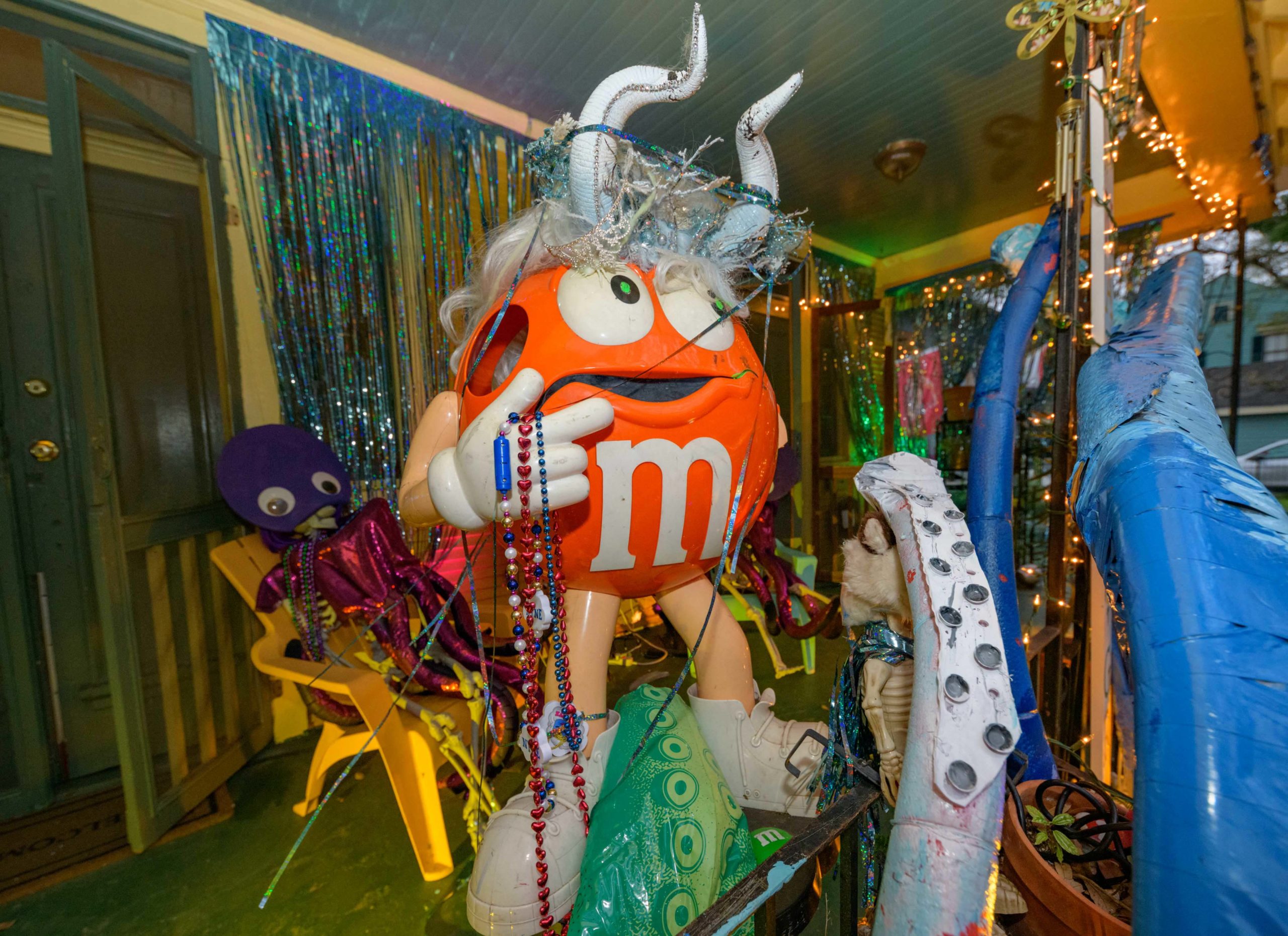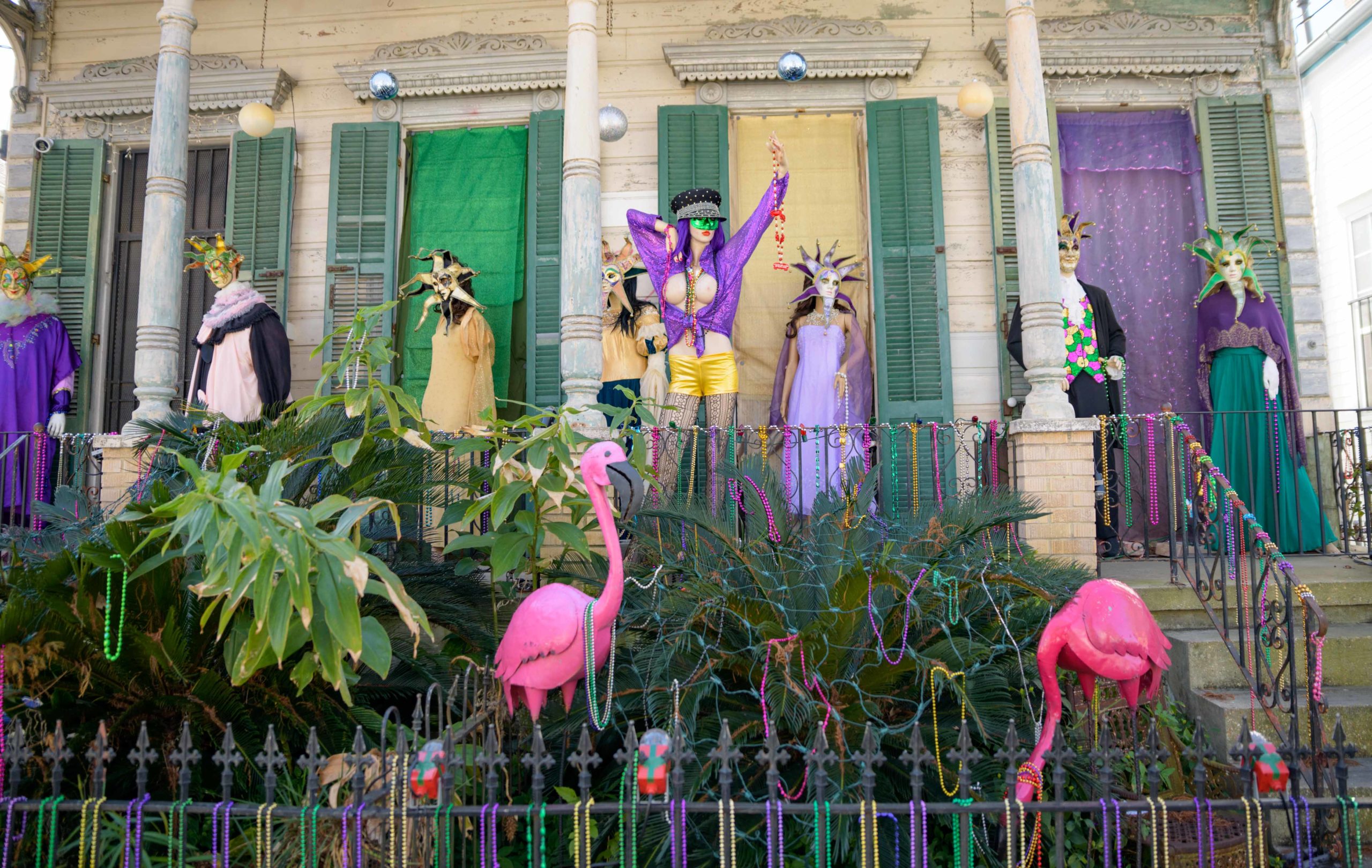 Though not officially part of the Krewe of House floats Jeff Thomas has been decorating his home on Burgundy St. (pronounced Brr-gun-dee in New Orleans) in the Bywater neighborhood with such themes as “Bywater Asylum” or “The 9th Ward Orphanage,” or “Hillbilly Hollow.” He uses at least 13 dolls with various masks. Normally Thomas only decorates for Halloween but he has already caused people to stop and pause as they walk by with “The Ladies of Corona” a group of mannequins holding toilet paper and wearing masks. Now he has decorated for Mardi Gras complete with a mannequin begging for beads. Photo by Matthew Hinton