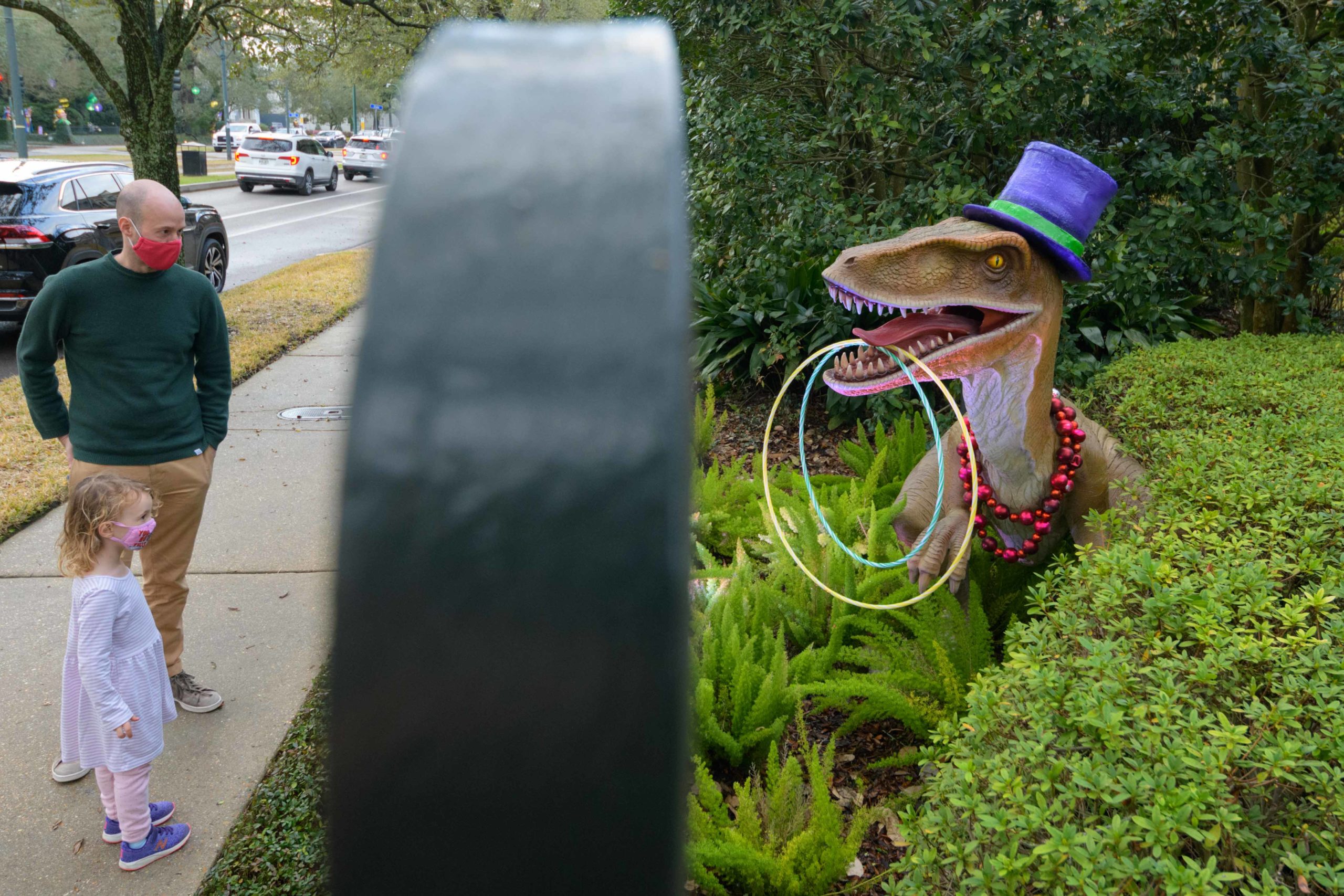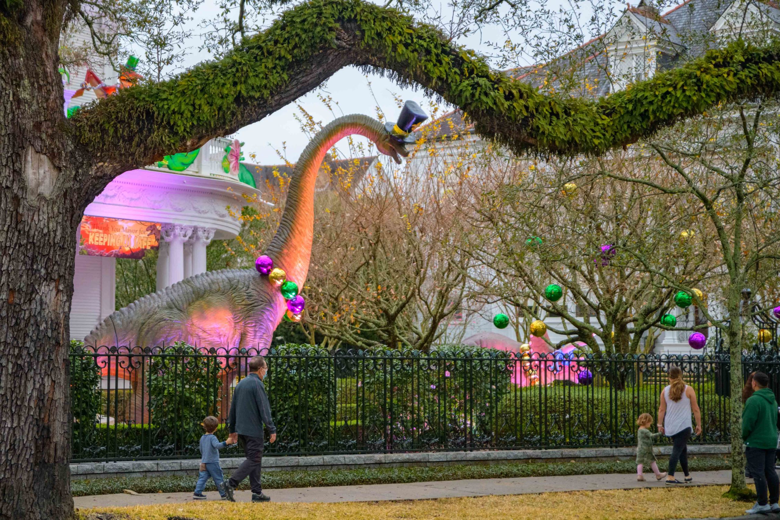 Its Dino Gras on St. Charles Ave. at Rosa Park near State Street with a house looking like a Mardi Gras themed Jurassic Park with a velociraptor, brachiosaurus, and pterodactyl. All are wearing top hats and beads and a triceratops wears a carnival mask. The decorations were made by Kern Studios famous for designing floats for Super Krewes like Bacchus, Endymion, Orpheus and Muses. Photo by Matthew Hinton