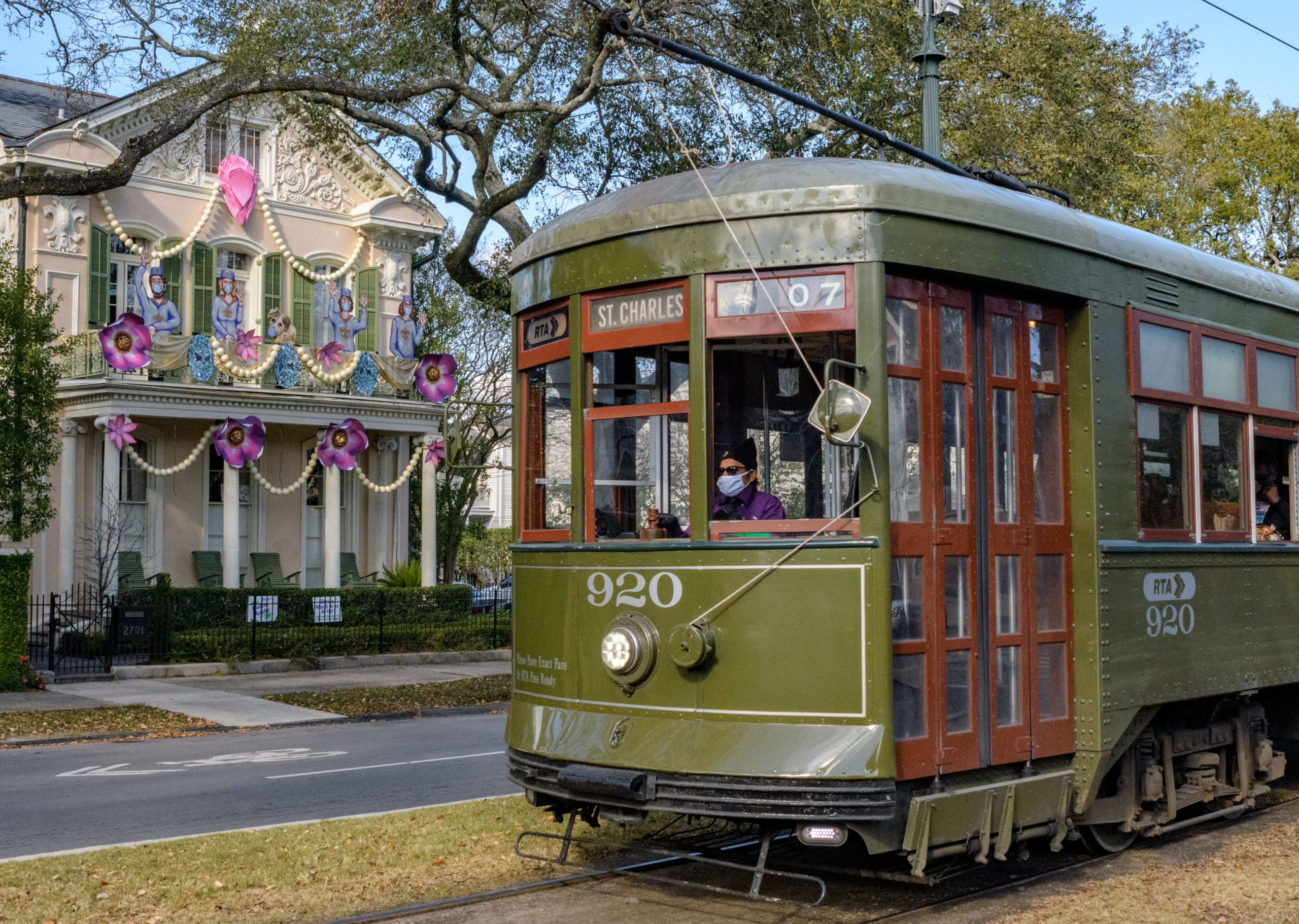 A streetcar passes by the Queen Jubilee float house at 2701 St.Charles Ave. created by the Krewe of Red Beans Hire a Mardi Gras Artist in New Orleans, La. Thursday, Jan. 14, 2021. Photo by Matthew Hinton