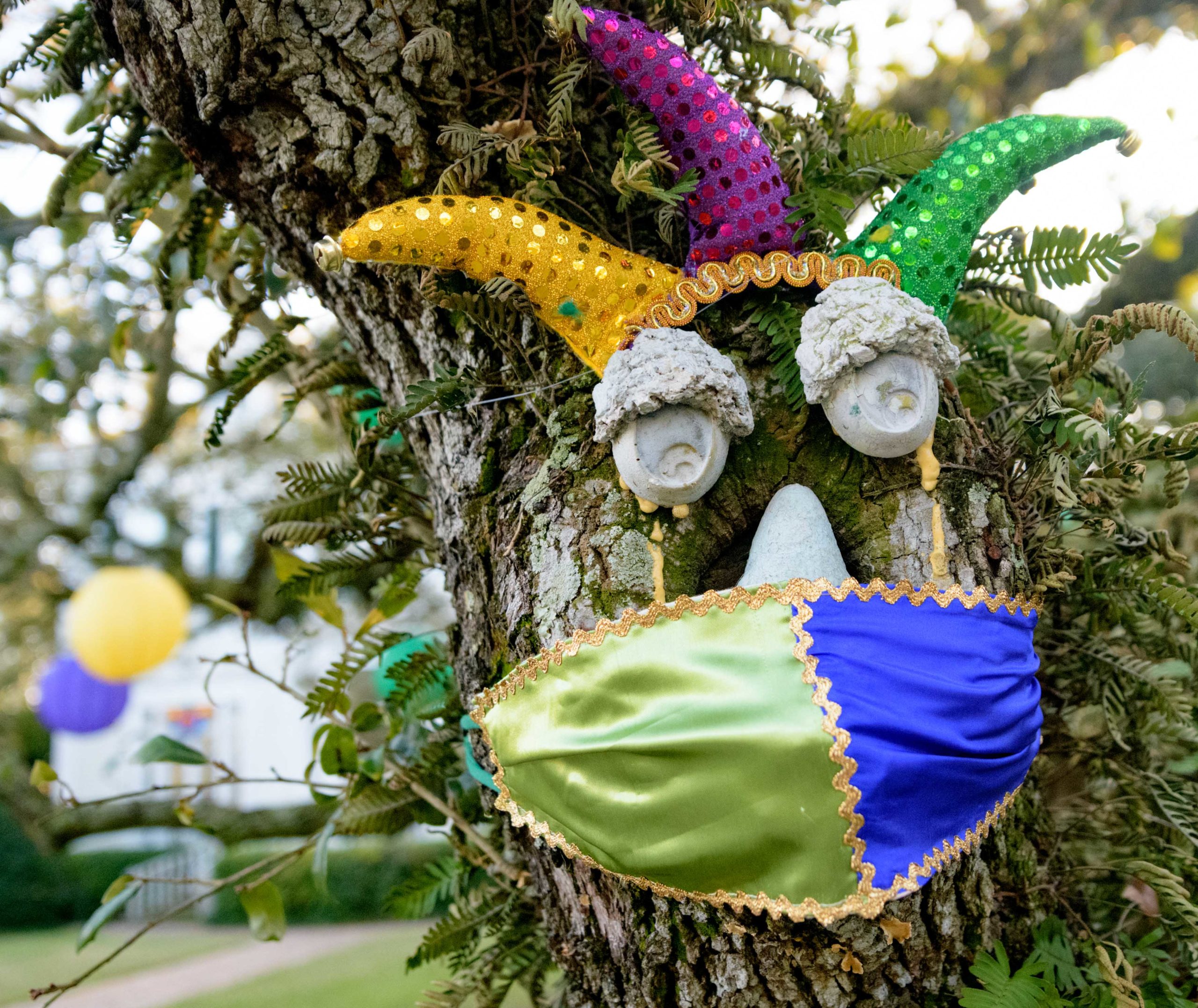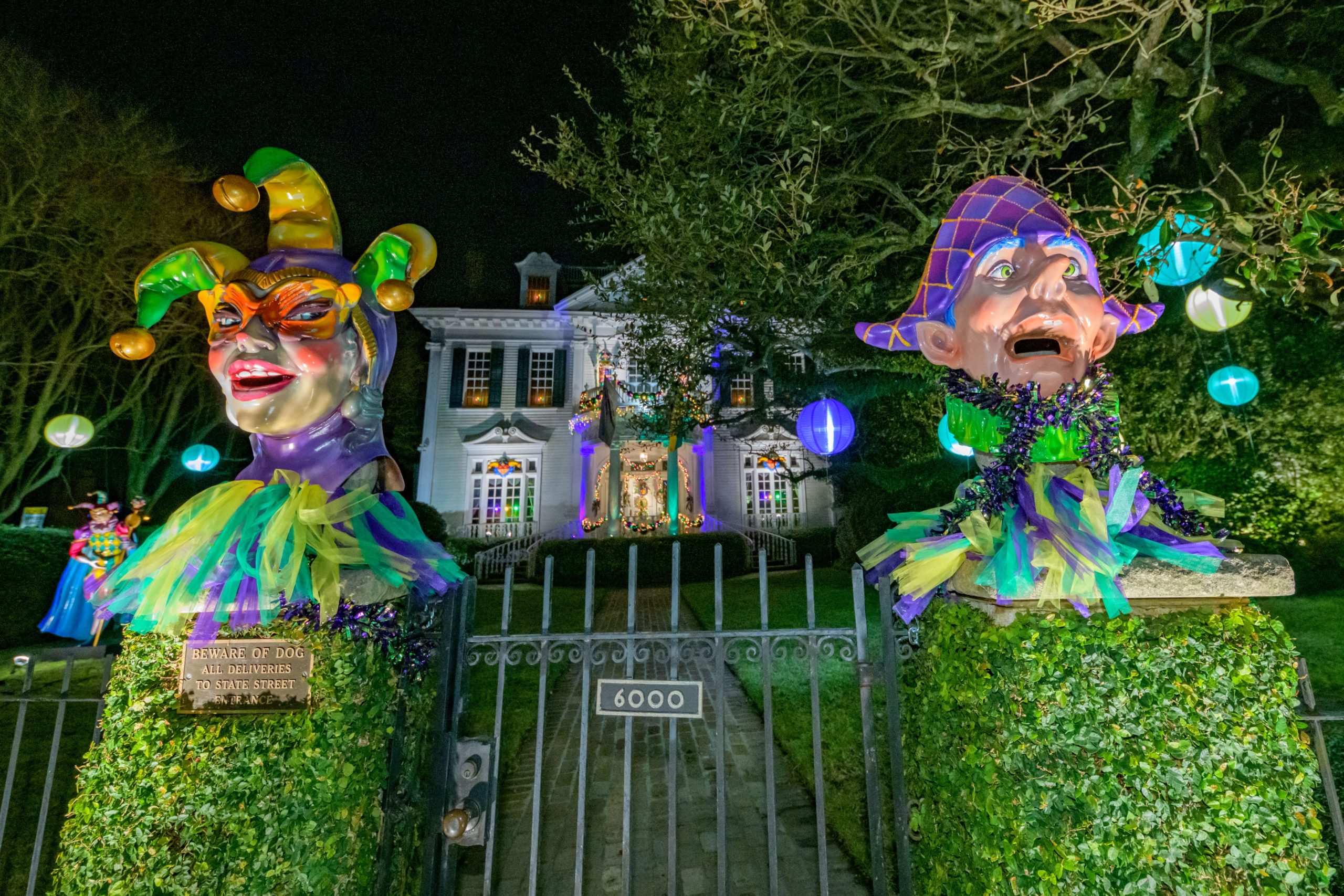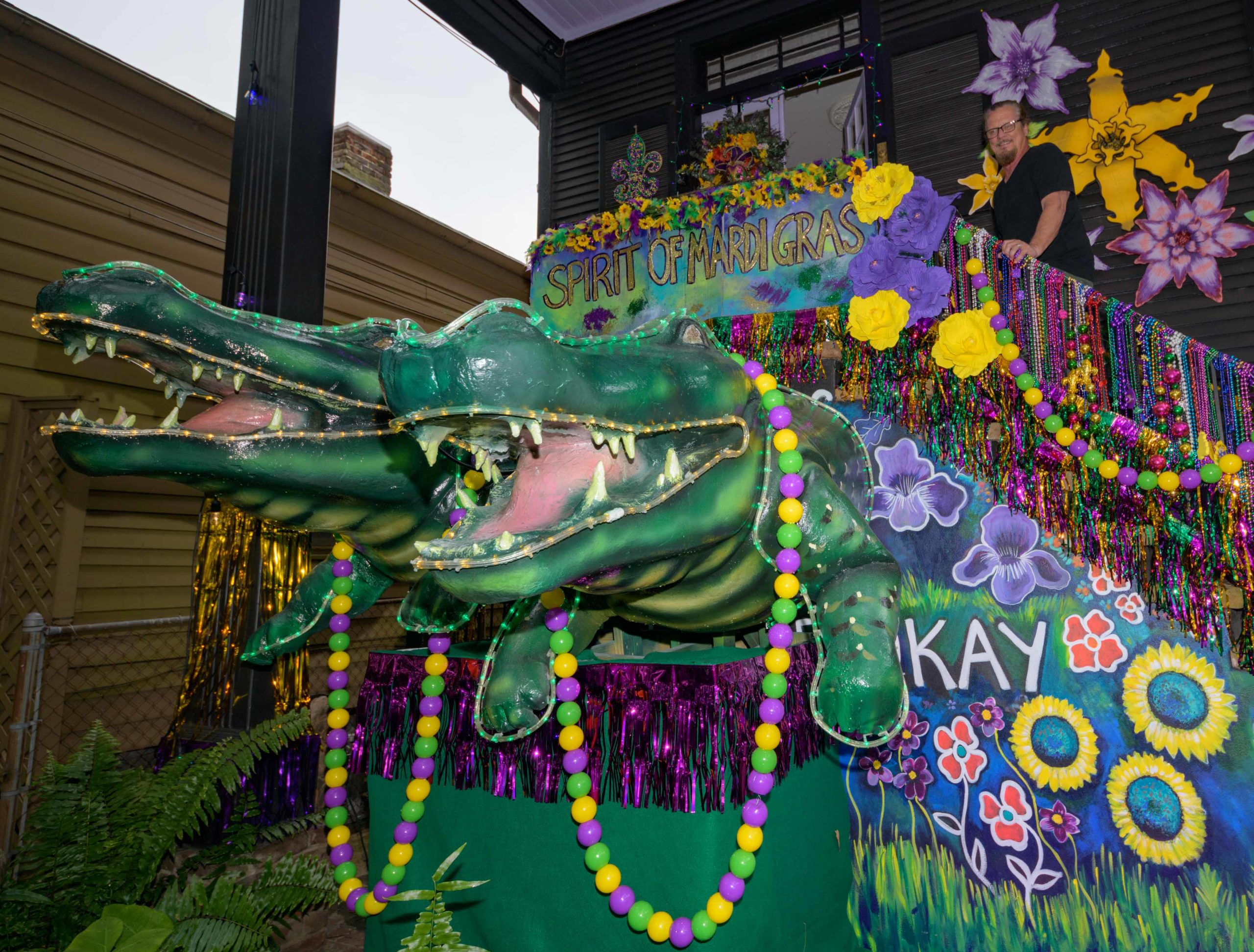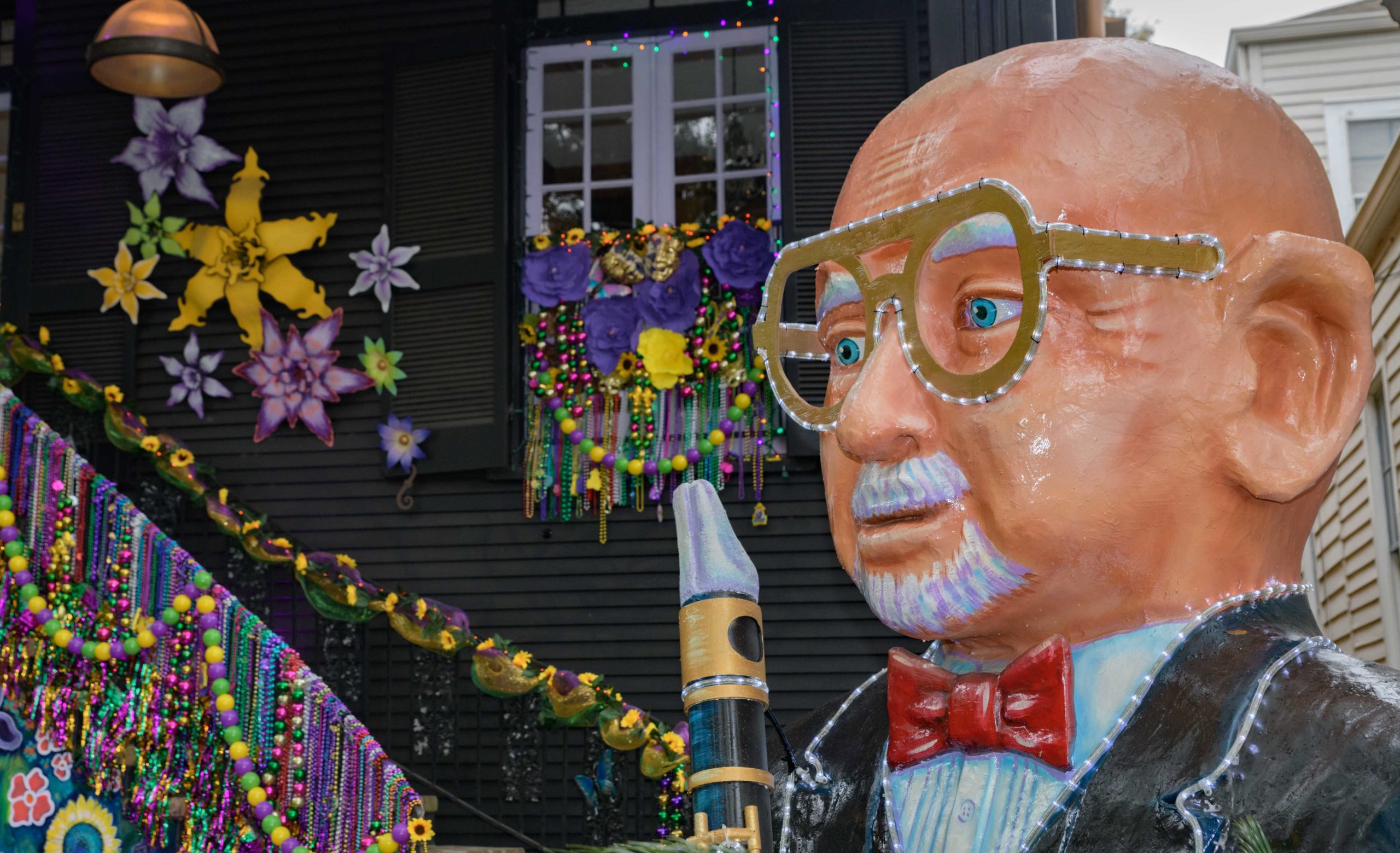 Mardi Gras Decorators of Slidell owner Rachel Elsensohn has loaned some of her float pieces including Pete Fountain a Jester and two large gators to this float house on 808 Napoleon Ave. Photo by Matthew Hinton