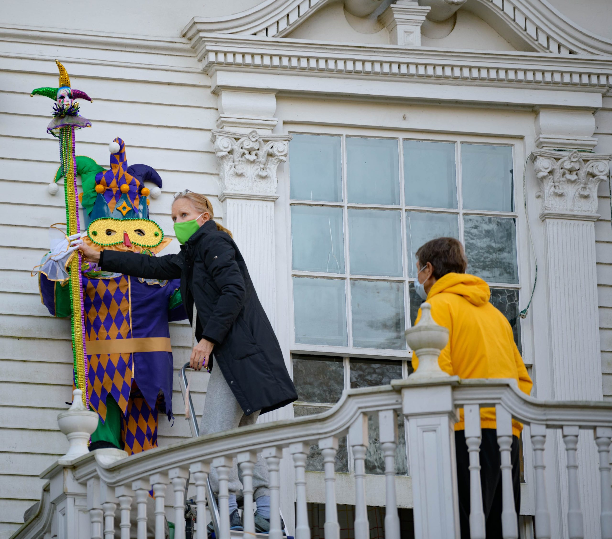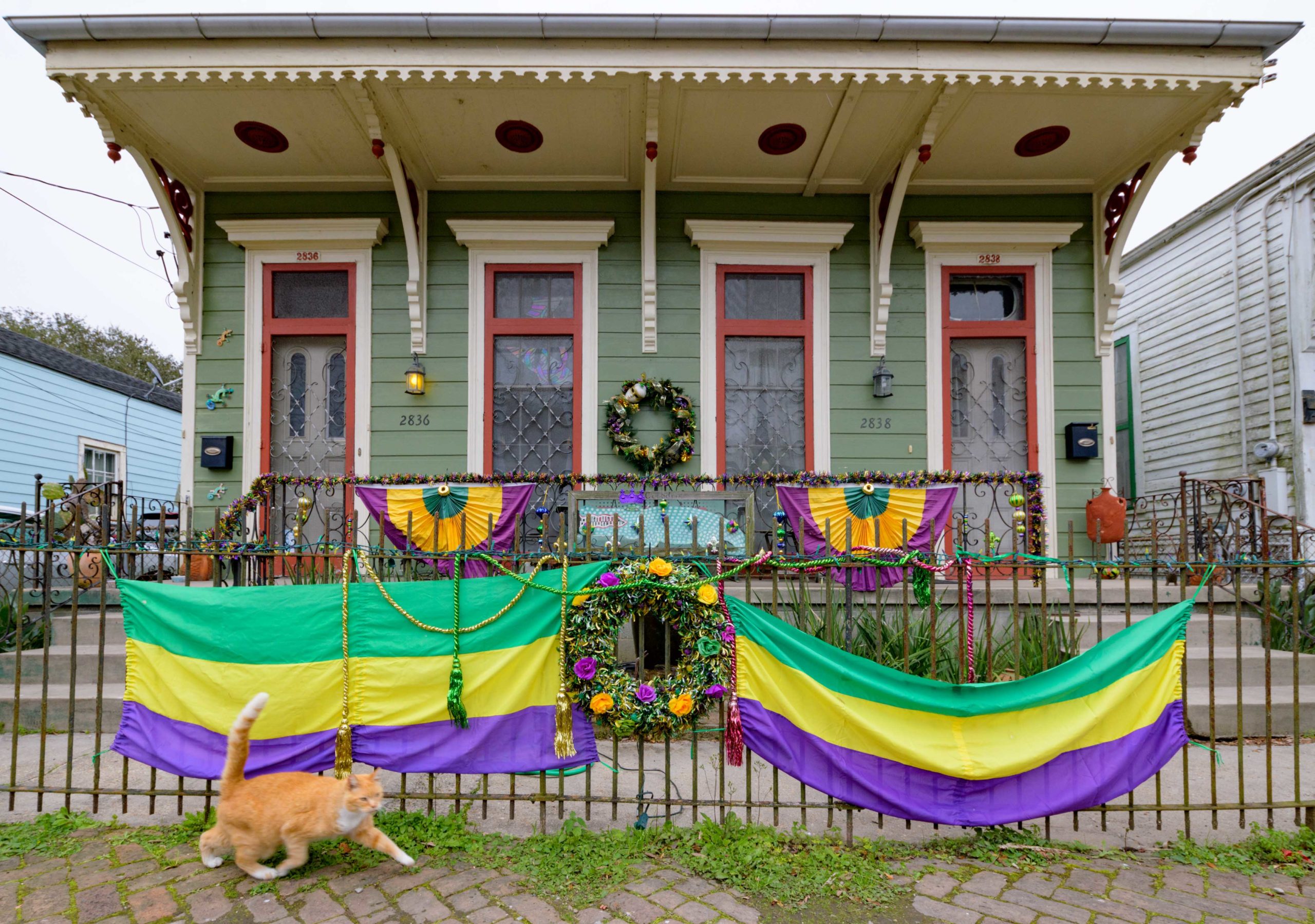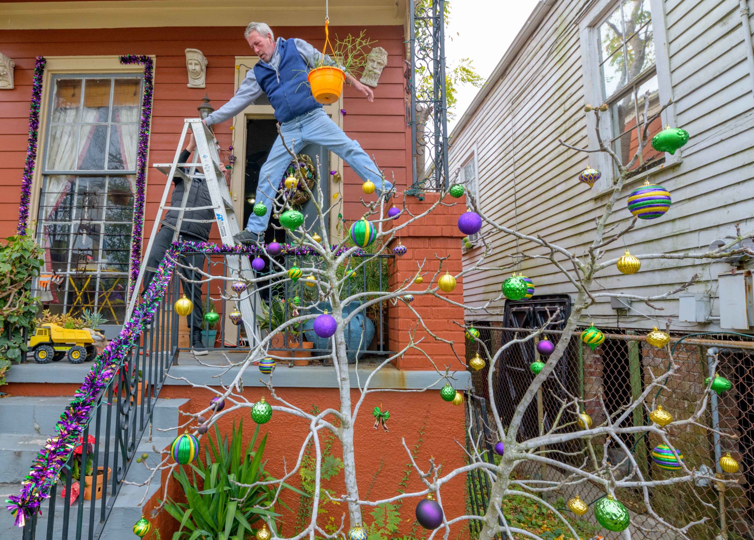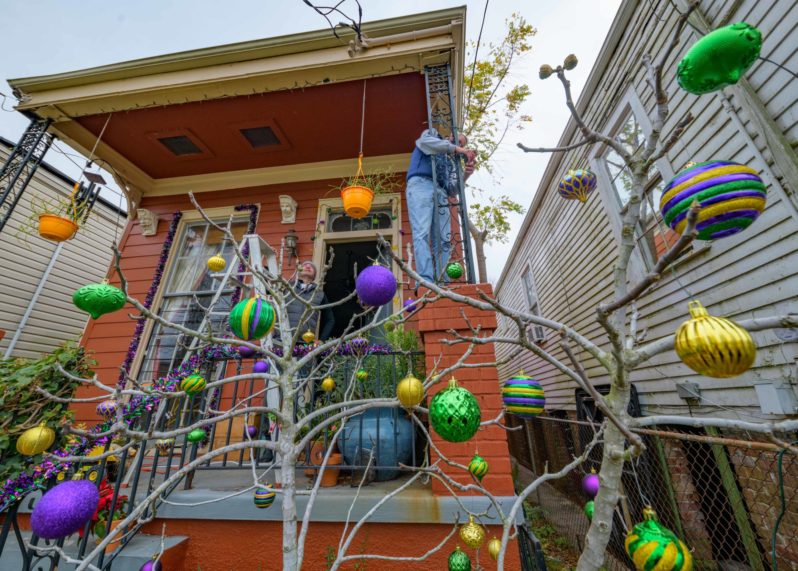 Darren Brouillette and David Bockstruck decorate their porch for the Carnival / Mardi Gras season Sunday, January 10, 2021 in the Milan neighborhood of New Orleans. Photo by Matthew Hinton