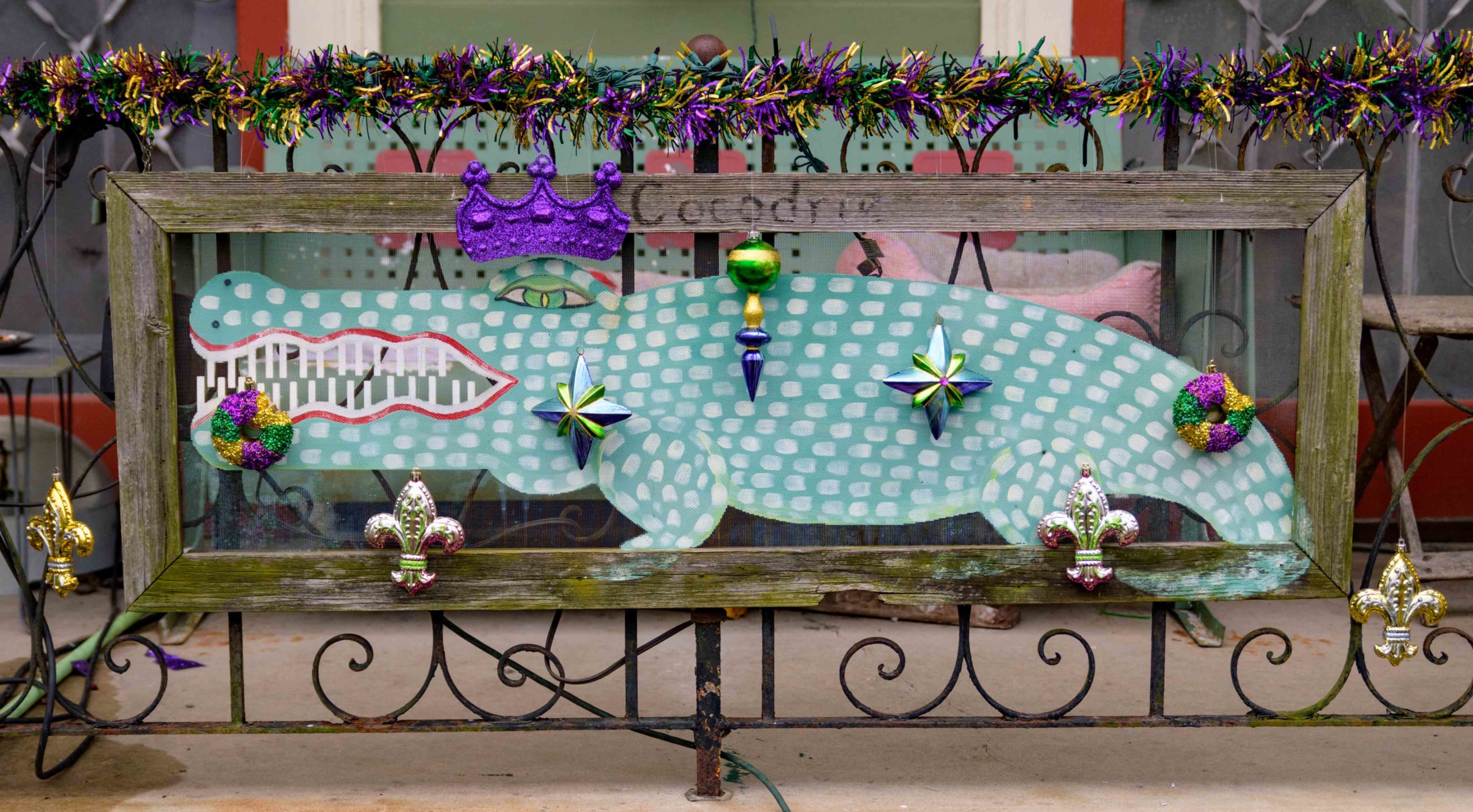 A crowned cocodrie, a French spelling of crocodile, is seen on a Mardi Gras decorated porch on Laurel Street in the Irish Channel neighborhood of New Orleans. Alligators are native to Louisiana though not crocodiles, but there is Cocodrie, Louisiana in Terrebonne Parish. Photo by Matthew Hinton