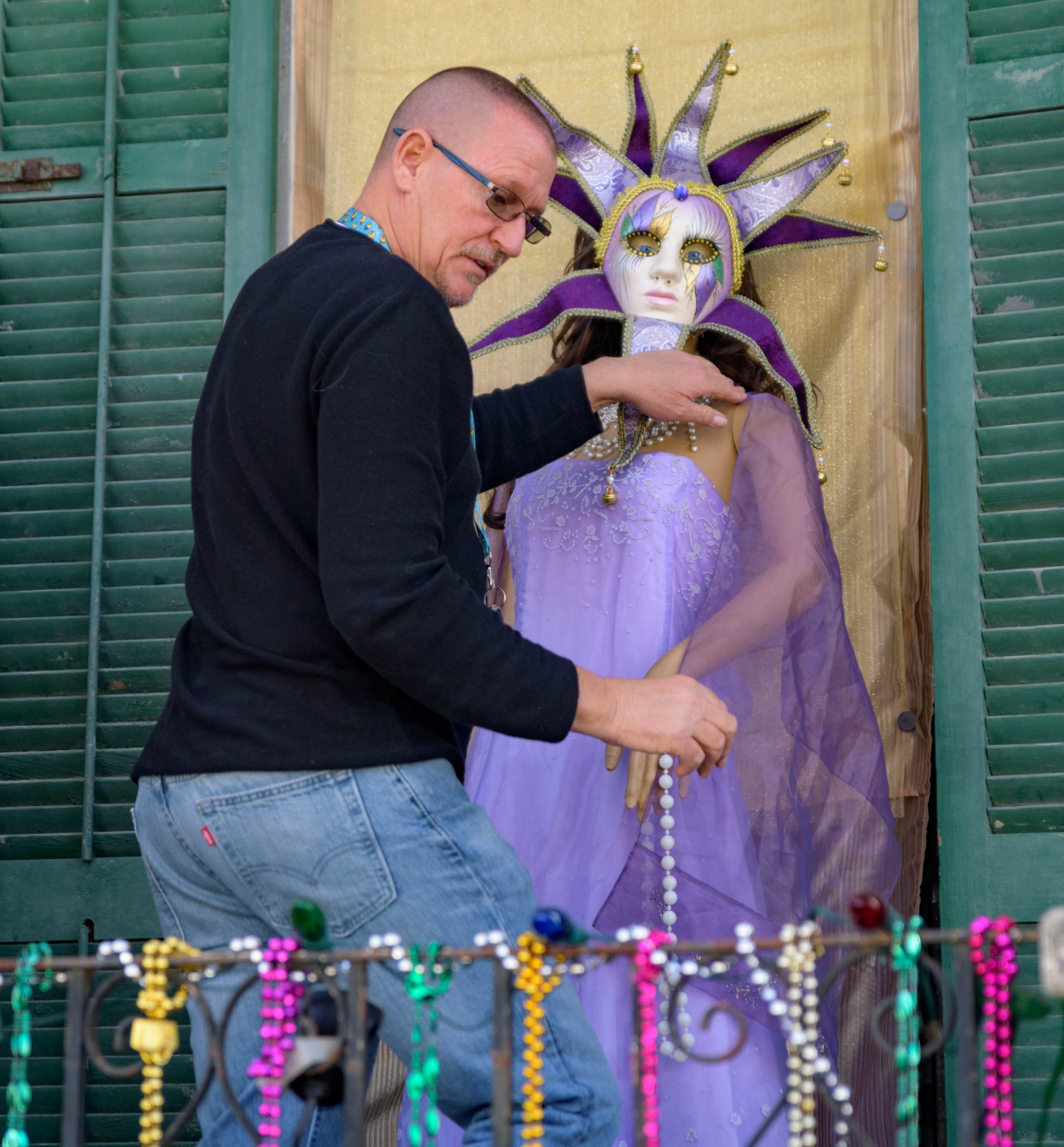 The not officially part of the Krewe of House floats Jeff Thomas has been decorating his home on Burgundy St. (pronounced Brr-gun-dee in New Orleans) in the Bywater neighborhood with such themes as Bywater Asylum or The 9th Ward Orphanage, or Hillbilly Hollow. He uses at least 13 dolls with various masks. Normally Thomas only decorates for Halloween but he has already caused people to stop and pause as they walk by with The Ladies of Corona a group of mannequins holding toilet paper and wearing masks. Now he has decorated for Mardi Gras complete with a mannequin begging for beads. Photo by Matthew Hinton
