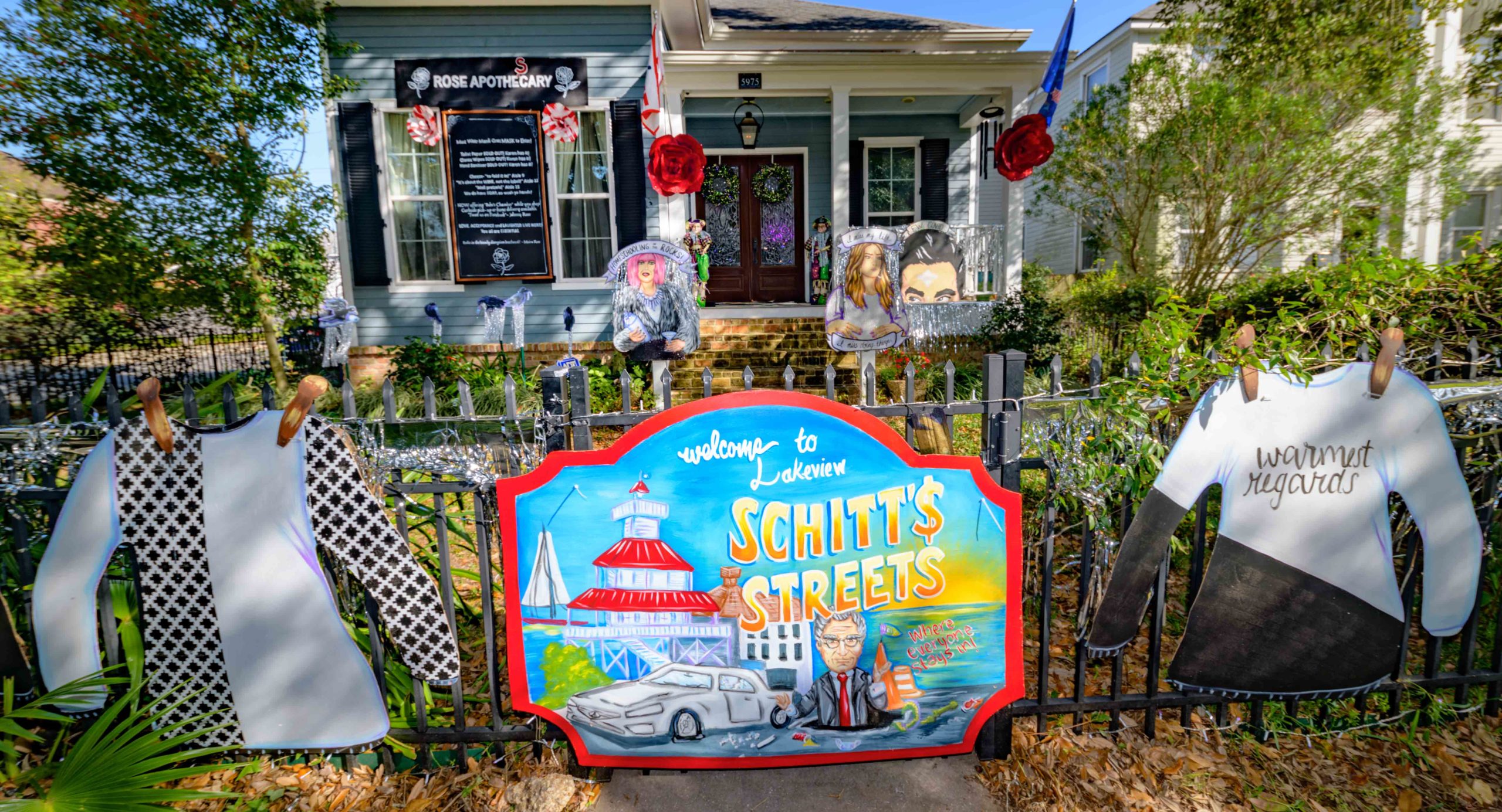 The Welcome to Lakeview : Schitt$ Streets parodies the potholes in Lakeview and pays homage to characters from the TV show Schitt’s Creek at 5975 Canal Blvd. Photo by Matthew Hinton