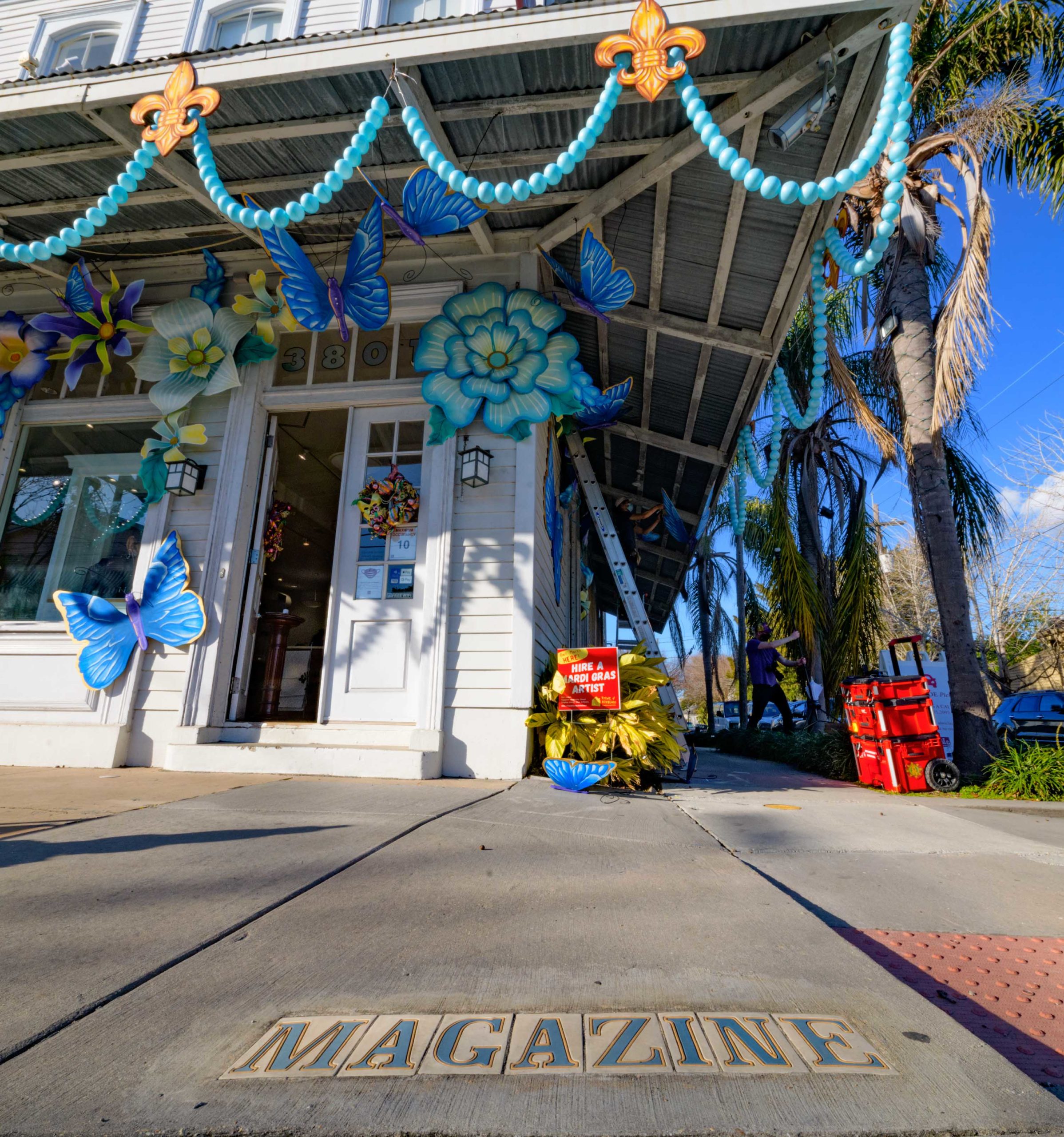 The Krewe of Red Beans’ “Hire A Mardi Gras Artist,” has decorated the Mignon Faget store on 3801 Magazine Street with butterflies.