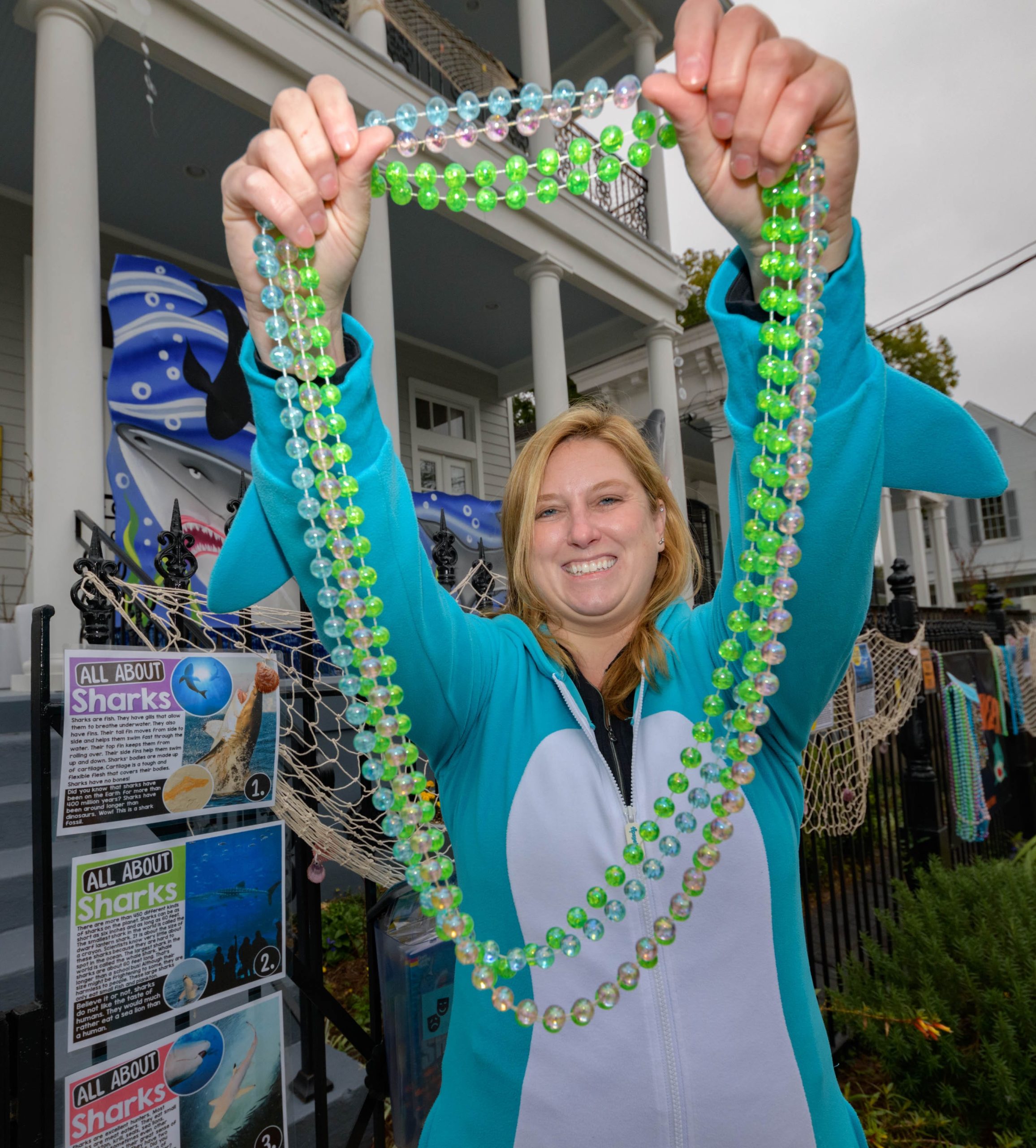 Sharks have been spotted in this pool, but as long as you stay six feet away, you can pick up some free beads and learn some interesting shark facts from the Krewe of Science House at 727 First Street in the Irish Channel. Elizabeth Carter started posting different science topics on her fence during the pandemic including information about COVID-19 and other themes about different animals that live in Louisiana. Carter is an LSU law professor who previously worked in vaccine development after attaining a degree in biology. The Irish Channel neighborhood has chosen Channel Surfing for their theme in the Krewe of House Floats. The Krewe of House Floats is an initiative to decorate homes during the Carnival season because of the cancellation and postponement of parades and gatherings for #MardiGras2021 due to COVID-19 pandemic. Before the pandemic, Carter took part in the satirical Krewe of Tucks parade. Keeping with the channel surfing theme Carter and her husband Adam Swensek chose Shark Week. She also has coloring books and toys for kids in the neighborhood along with Mardi Gras beads. The #PorchFloat decorations were created by Crescent City Artists, LLC. #CrescentCityArtists states that they are the first Black-owned Mardi Gras float service providers in Louisiana and are led by a New Orleans husband and wife duo Rene and Inez Pierre. Live everyday like its Shark Week. Photo by Matthew Hinton