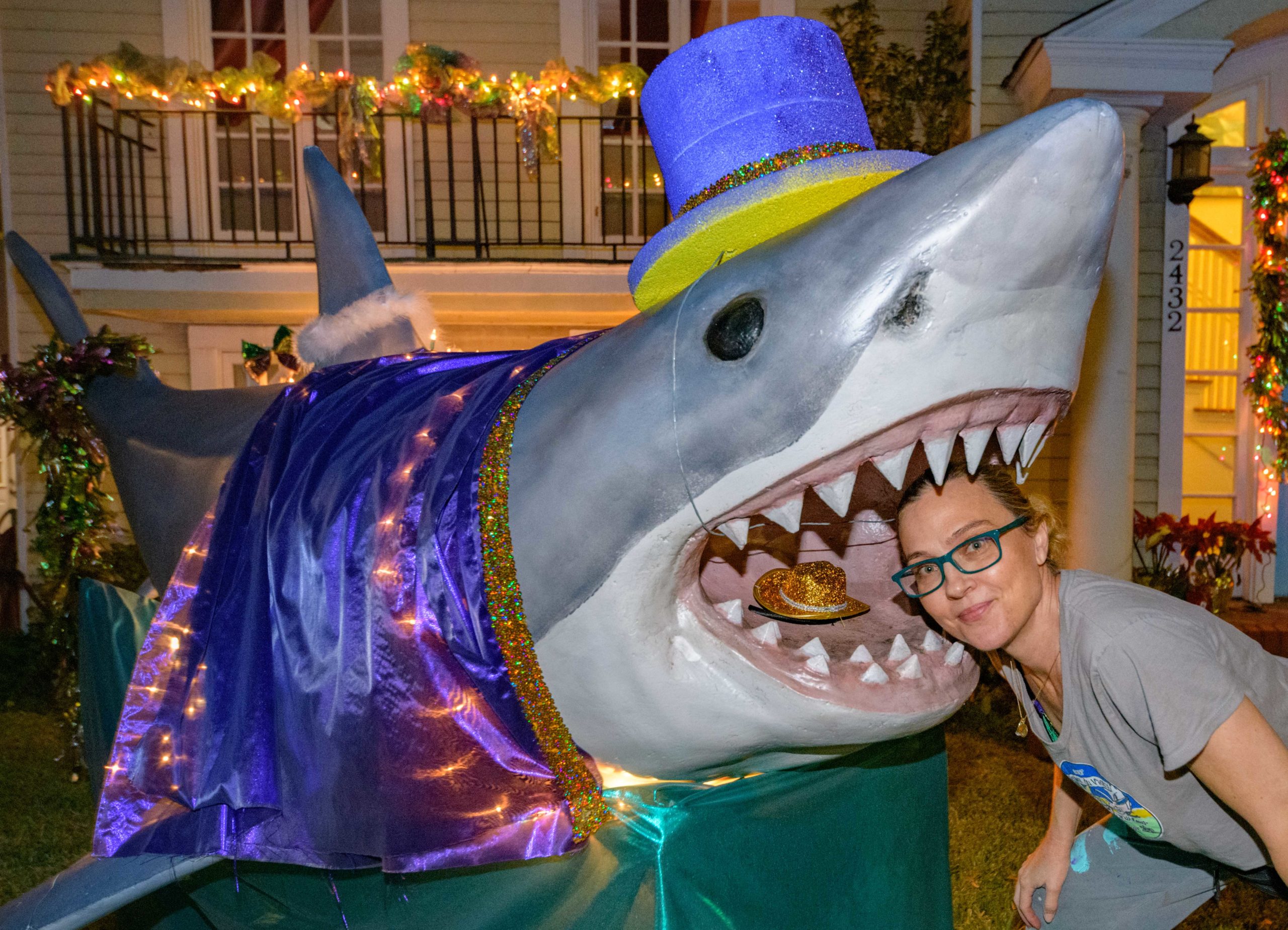 Knock, knock . . . whos there? Well its a land shark of course. Just when you thought it was safe to go back in the water, a shark appears at 2432 Jefferson Street in New Orleans, Sunday, Jan. 24, 2021. Wishing everyone a Happy Mardi Jaws, Melanie Maxey decorates a shark with a magicians outfit so it can join the pet parade of the Mystic Krewe of Sharkus, but its probably best to keep your pet pooch at least six feet away. Maxey is also one of the sub-krewe captains of the satirical Krewe du Vieux, known for its lewd and hilarious floats parodying celebrities, politics, and pop culture. This year the theme is Krewe du Vieux Has No Taste referring to the symptoms of losing taste and smell form COVID-19. The Krewe has a virtual parade on January 30 with some temporary art installations but note the parade is for an adults-only audience. A map is available and links to the virtual parade at kreweduvieux dot org. Photo by Matthew Hinton