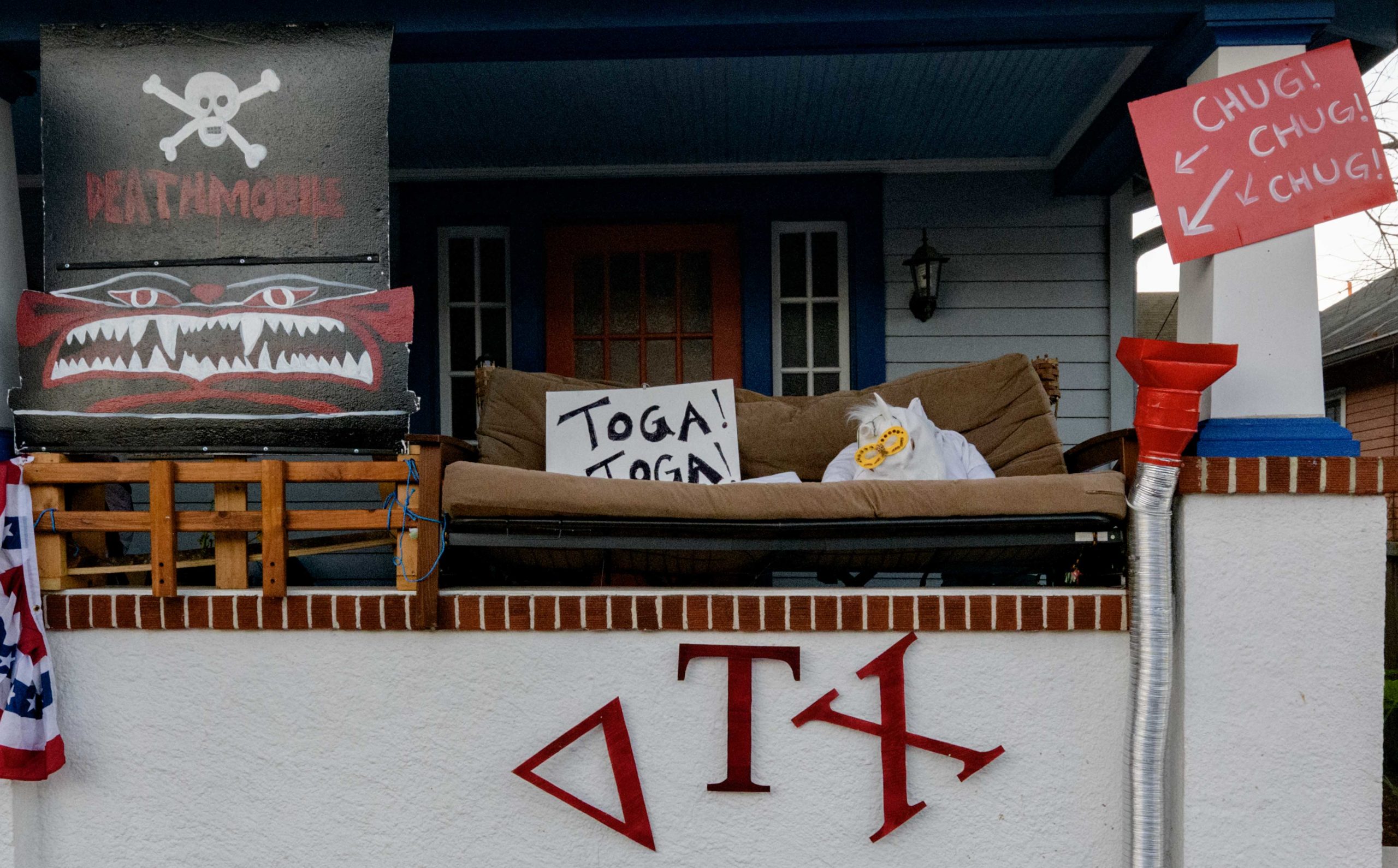 A Delta fraternity house from the movie Animal House parodies the Krewe of Chad, a pejorative term for fraternities or other temporary residents to the city that try to claim all the spots along parade routes during Mardi Gras. The house is on the 400 block of Bounty Street in Algiers. Photo by Matthew Hinton