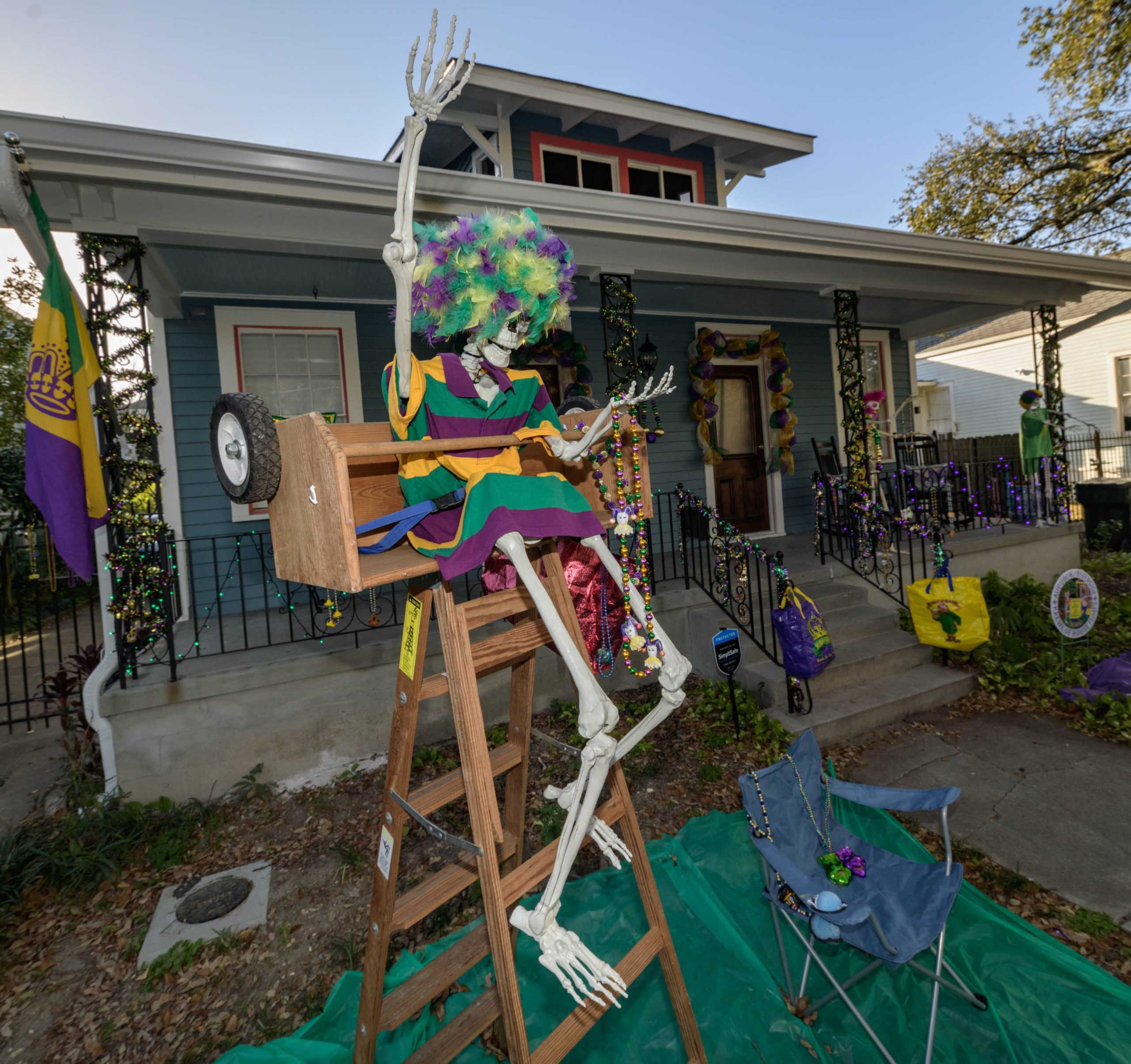 A Delta fraternity house from the movie Animal House parodies the “Krewe of Chad,” a pejorative term for fraternities or other temporary residents to the city that try to claim all the spots along parade routes during Mardi Gras. The house is on the 400 block of Bounty Street in Algiers. Photo by Matthew Hinton