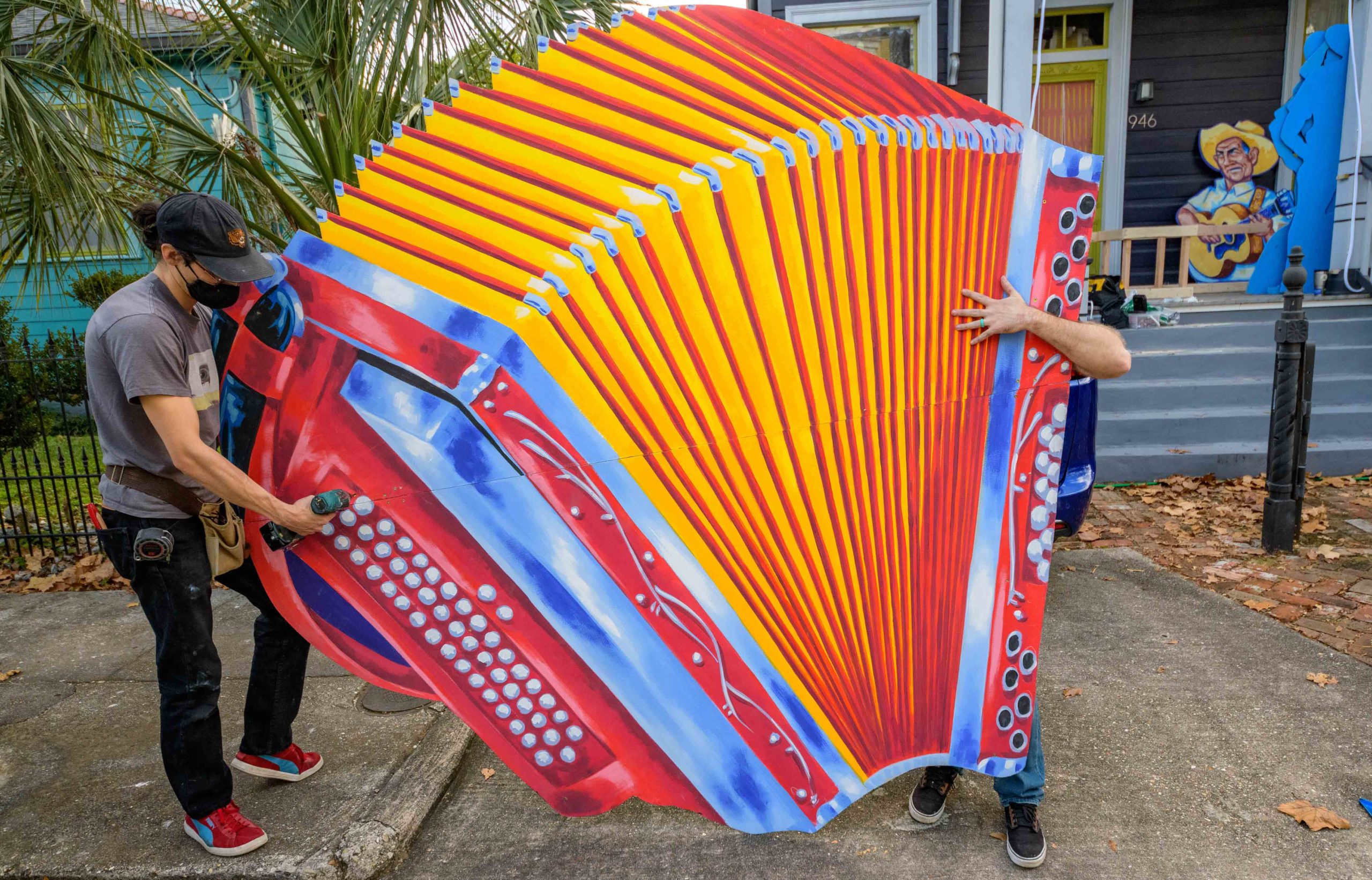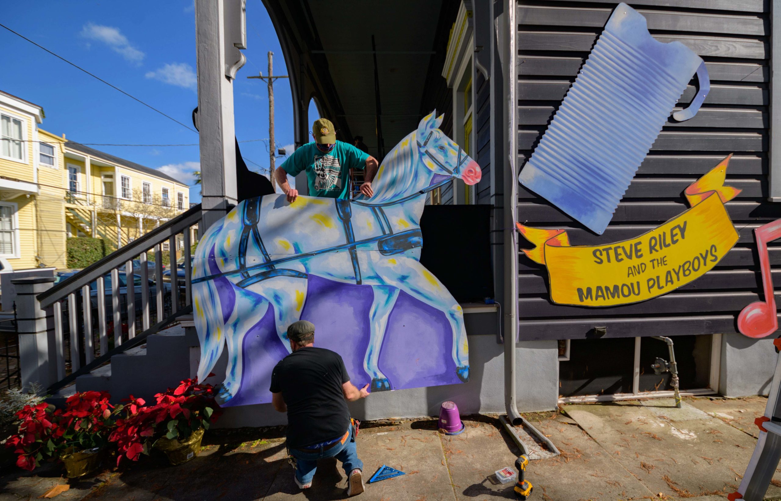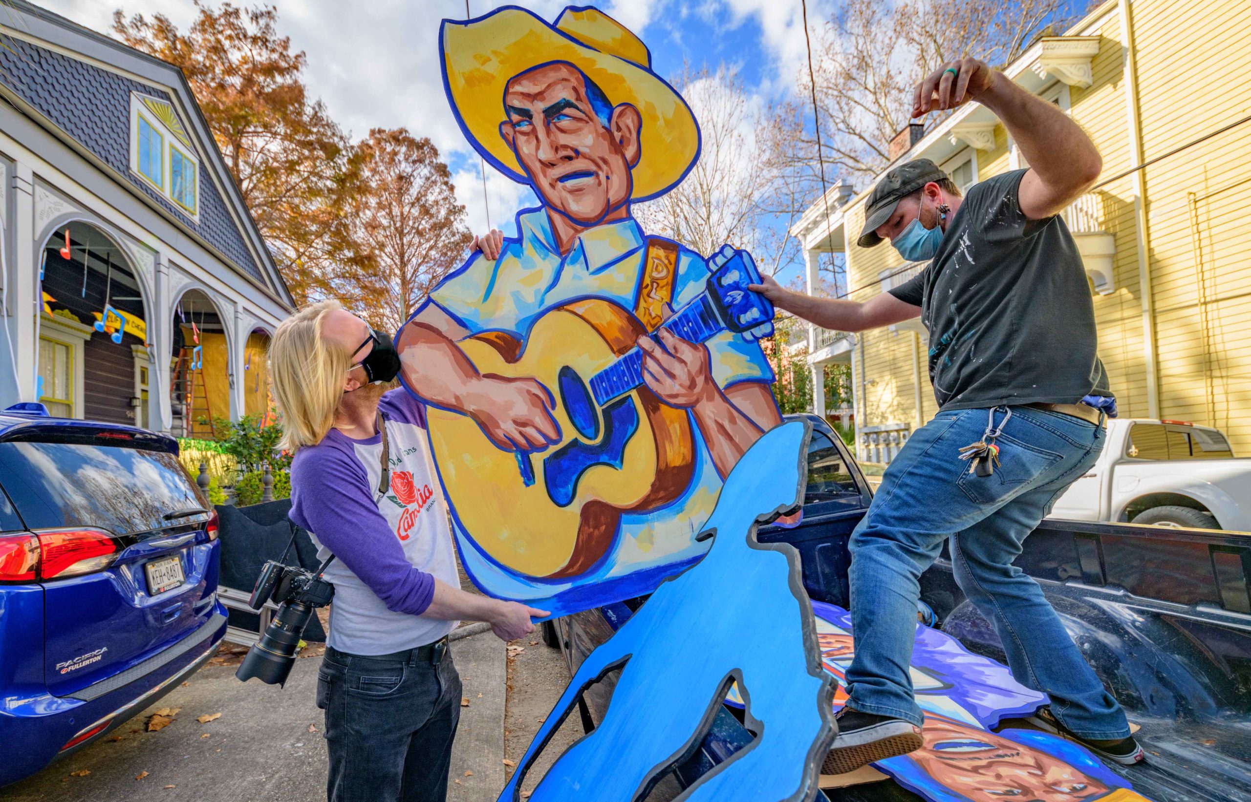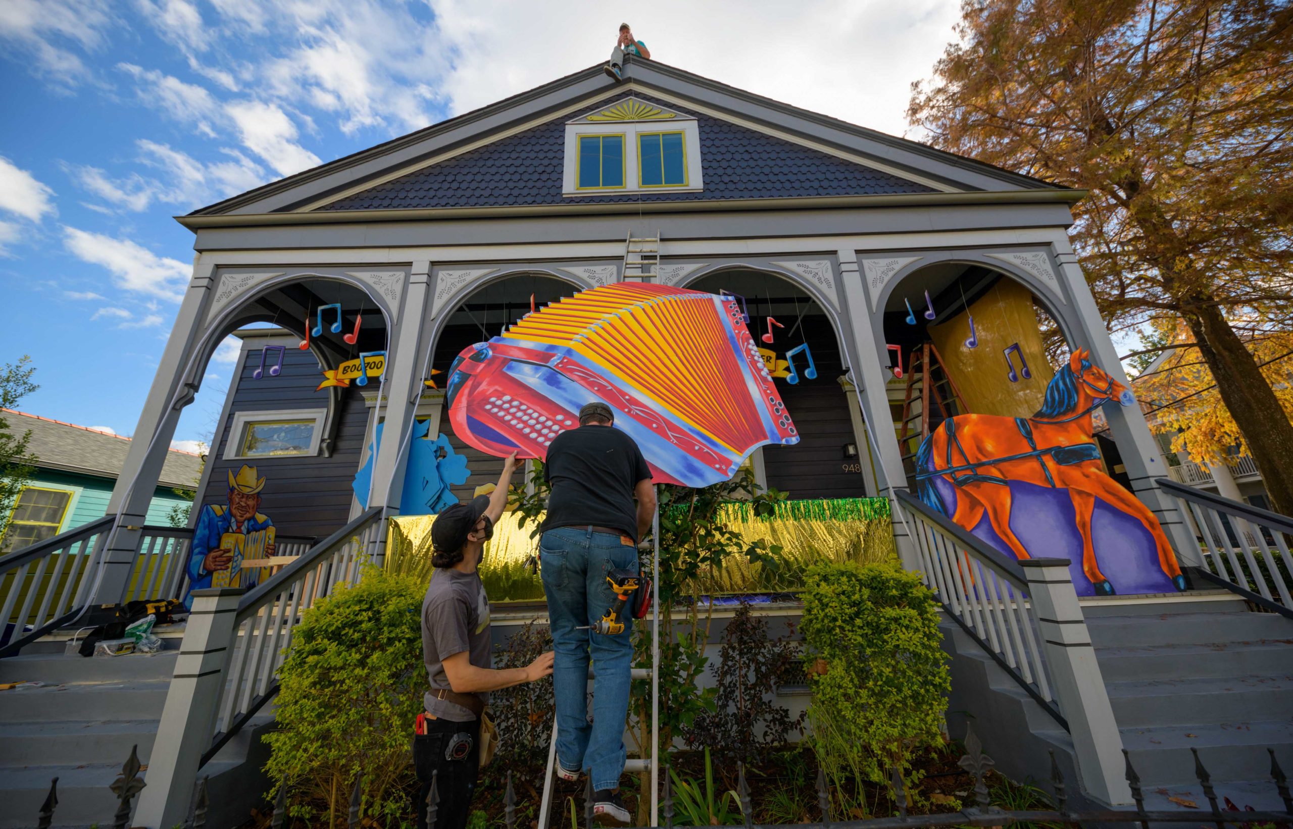 Michael and Stacey Burke to a three-piece Cajun band led by fiddler-singer Louis Michot of the Lost Bayou Ramblers in front of the Acadiana Hayride house float by Hire A Mardi Gras Artist, a grassroots initiative by the Krewe of Red Beans. The float features a horse-drawn hayride of Zydeco and Cajun music legends like Wilson Anthony “Boozoo” Chavis, D.L. Menard, and Clifton Chenier. A giant accordion that would take at least two people to play was put on the top of the home and was installed by Travis Keene, black jeans, and Joey Mercer, blue jeans, with a little help from Michael Burke. Burke is a retired gaffer or chief lighting technician for Law and Order SVU and Criminal Intent and he put his experience to work by lighting up the home at night. The float wraps around to the other side with more notes and names of Cajun and Zydeco bands on the home on Euterpe Street in the Lower Garden District of New Orleans. The house float initiative hopes to build 40 house floats for every $15,000 donated. The donations go towards supplies and hiring float artists, many who are out-of-work because of the cancellation of Mardi Gras and Carnival parades due to the COVID-19 pandemic. Residents who live and own a home in Orleans Parish that donate to the project are entered into the raffle to get one of the house floats even for a small sum like $25. The #HouseFloat was designed by Caroline Thomas with additional artwork by Ryan Blackwood and Daniel Fuselier. Photo by Matthew Hinton