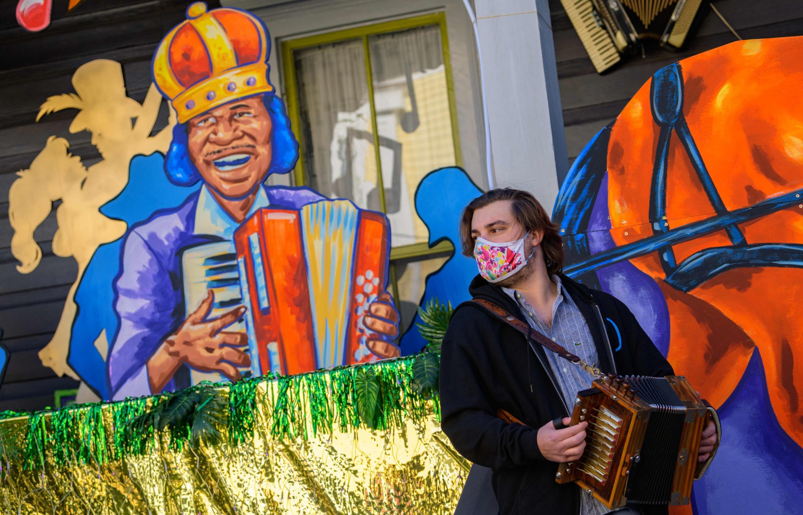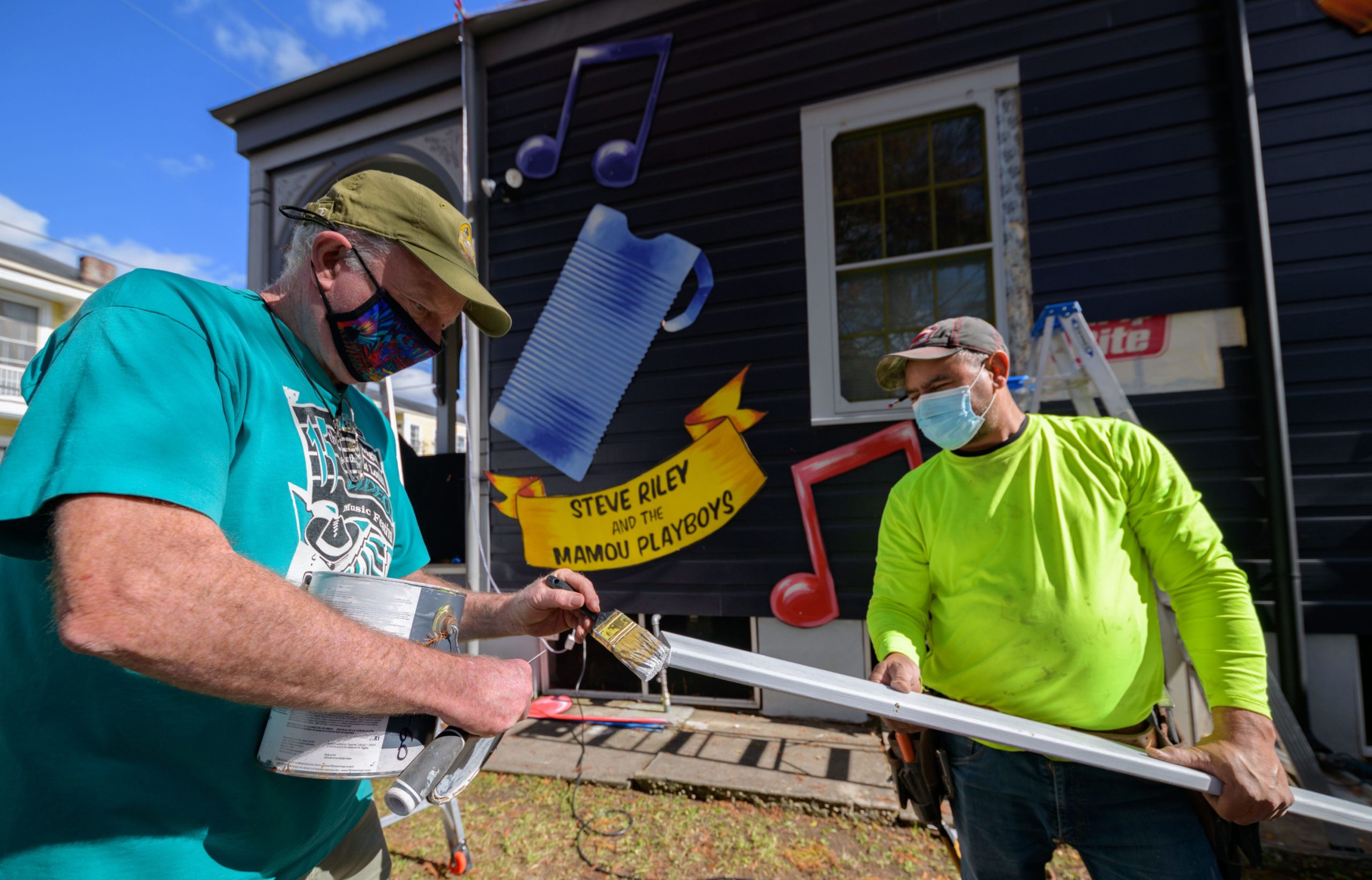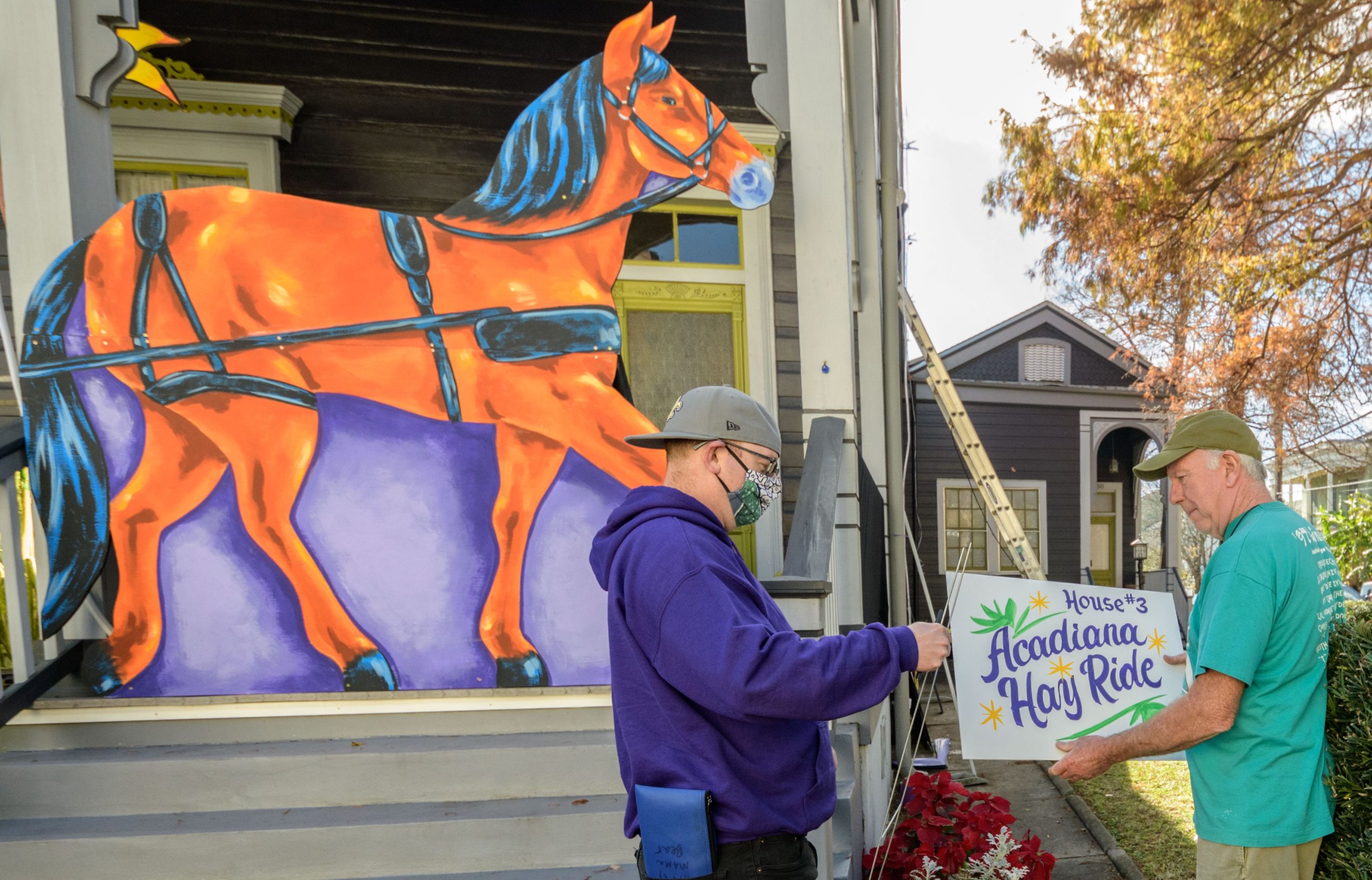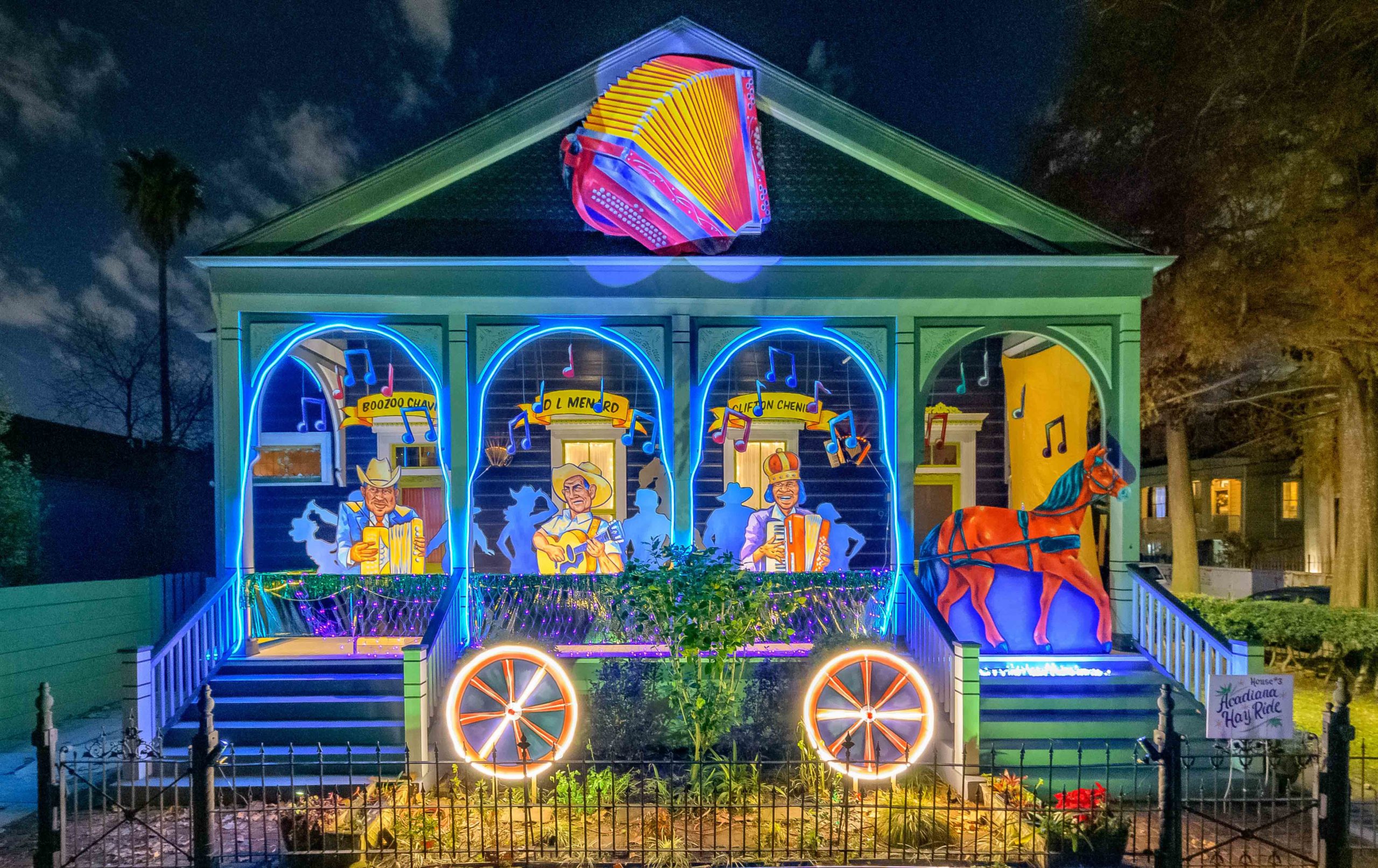 Michael and Stacey Burke to a three-piece Cajun band led by fiddler-singer Louis Michot of the Lost Bayou Ramblers in front of the Acadiana Hayride house float by Hire A Mardi Gras Artist, a grassroots initiative by the Krewe of Red Beans. The float features a horse-drawn hayride of Zydeco and Cajun music legends like Wilson Anthony “Boozoo” Chavis, D.L. Menard, and Clifton Chenier. A giant accordion that would take at least two people to play was put on the top of the home and was installed by Travis Keene, black jeans, and Joey Mercer, blue jeans, with a little help from Michael Burke. Burke is a retired gaffer or chief lighting technician for Law and Order SVU and Criminal Intent and he put his experience to work by lighting up the home at night. The float wraps around to the other side with more notes and names of Cajun and Zydeco bands on the home on Euterpe Street in the Lower Garden District of New Orleans. The house float initiative hopes to build 40 house floats for every $15,000 donated. The donations go towards supplies and hiring float artists, many who are out-of-work because of the cancellation of Mardi Gras and Carnival parades due to the COVID-19 pandemic. Residents who live and own a home in Orleans Parish that donate to the project are entered into the raffle to get one of the house floats even for a small sum like $25. The #HouseFloat was designed by Caroline Thomas with additional artwork by Ryan Blackwood and Daniel Fuselier. Photo by Matthew Hinton