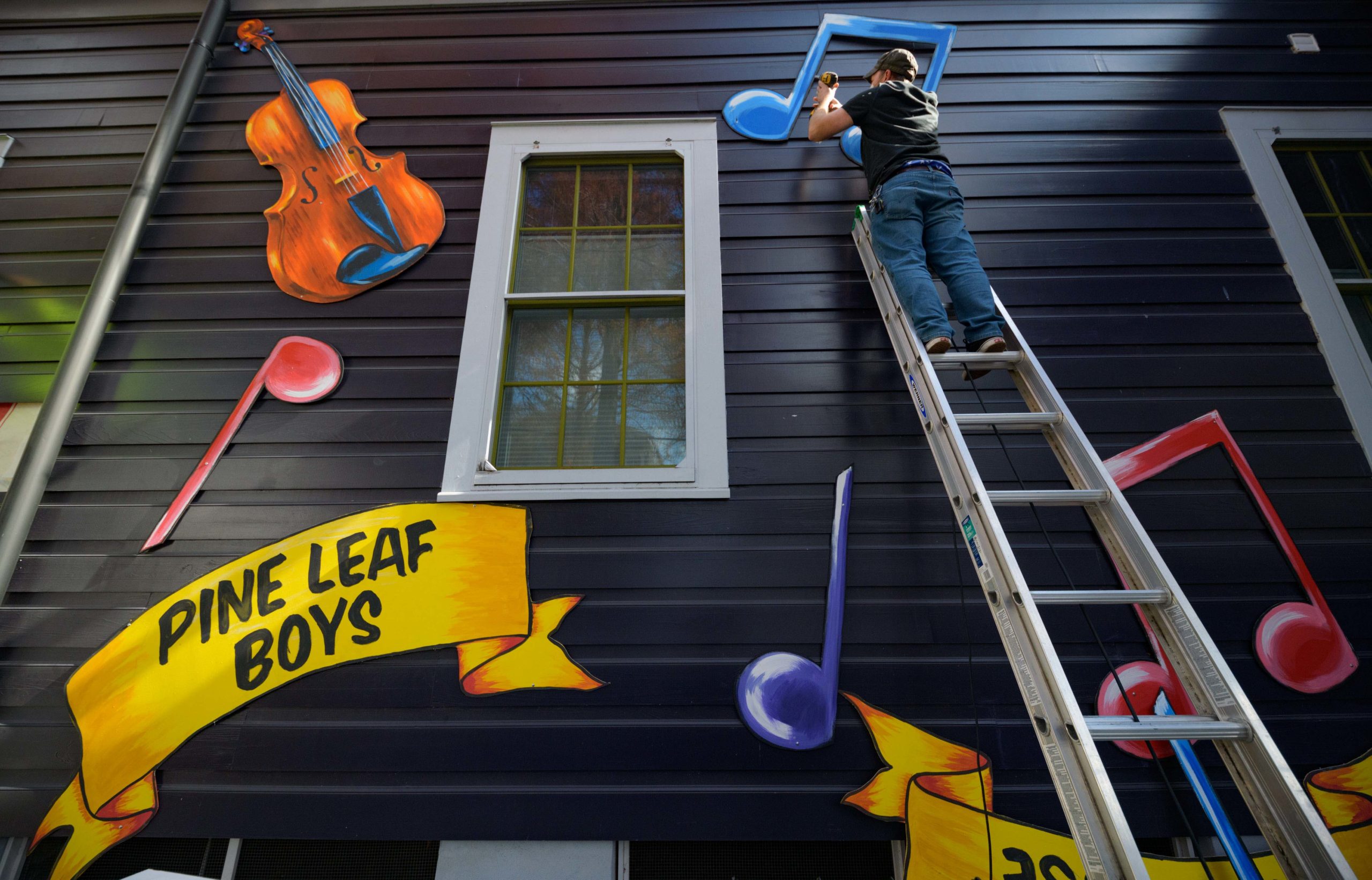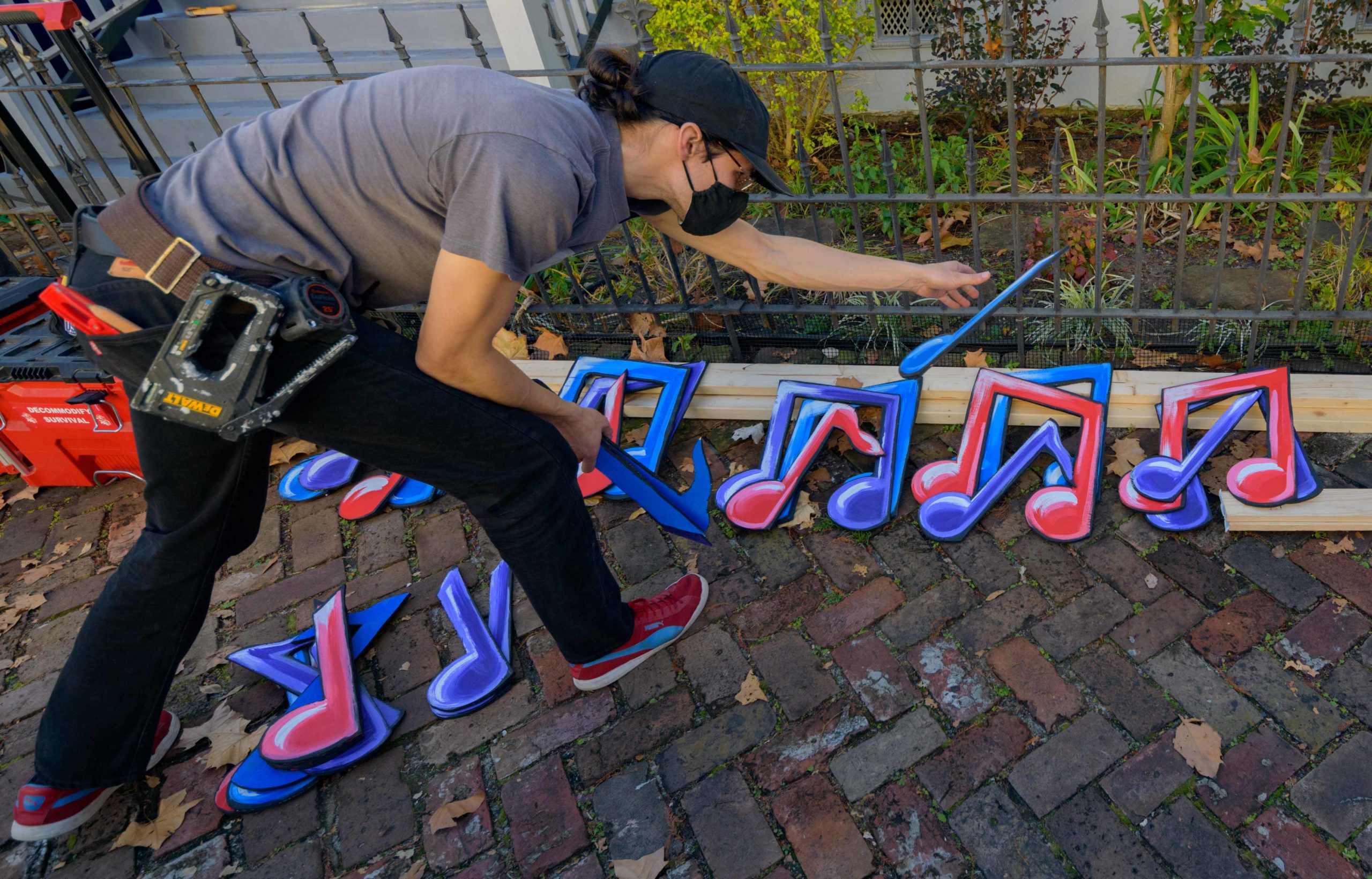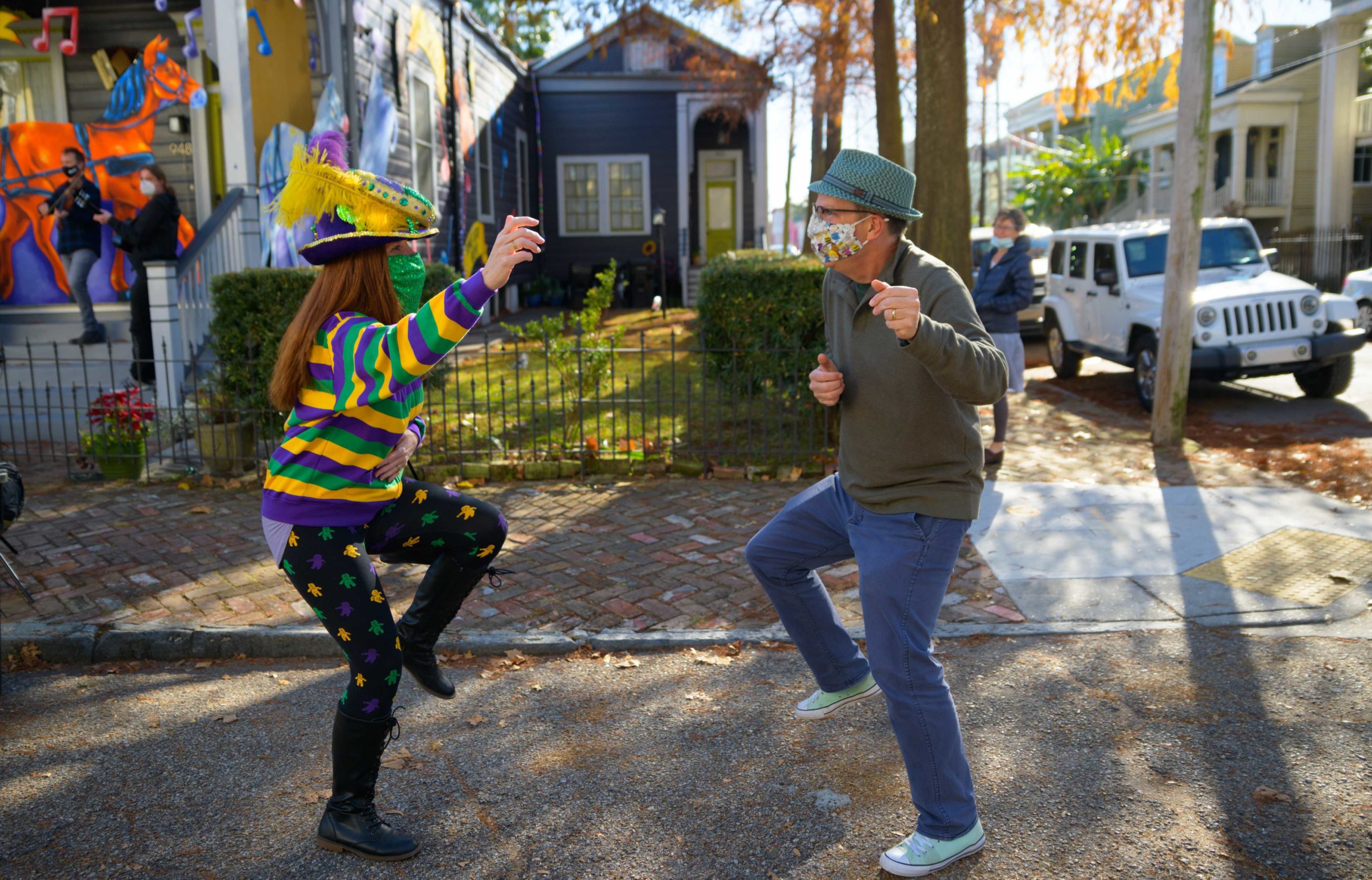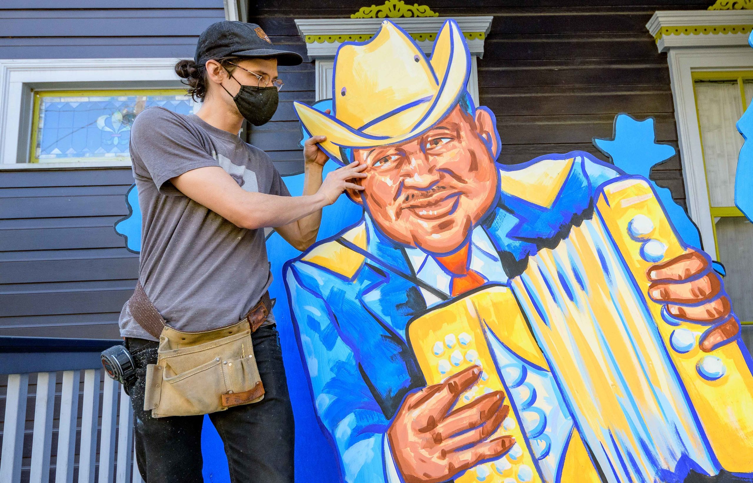 Michael and Stacey Burke to a three-piece Cajun band led by fiddler-singer Louis Michot of the Lost Bayou Ramblers in front of the Acadiana Hayride house float by Hire A Mardi Gras Artist, a grassroots initiative by the Krewe of Red Beans. The float features a horse-drawn hayride of Zydeco and Cajun music legends like Wilson Anthony “Boozoo” Chavis, D.L. Menard, and Clifton Chenier. A giant accordion that would take at least two people to play was put on the top of the home and was installed by Travis Keene, black jeans, and Joey Mercer, blue jeans, with a little help from Michael Burke. Burke is a retired gaffer or chief lighting technician for Law and Order SVU and Criminal Intent and he put his experience to work by lighting up the home at night. The float wraps around to the other side with more notes and names of Cajun and Zydeco bands on the home on Euterpe Street in the Lower Garden District of New Orleans. The house float initiative hopes to build 40 house floats for every $15,000 donated. The donations go towards supplies and hiring float artists, many who are out-of-work because of the cancellation of Mardi Gras and Carnival parades due to the COVID-19 pandemic. Residents who live and own a home in Orleans Parish that donate to the project are entered into the raffle to get one of the house floats even for a small sum like $25. The #HouseFloat was designed by Caroline Thomas with additional artwork by Ryan Blackwood and Daniel Fuselier. Photo by Matthew Hinton