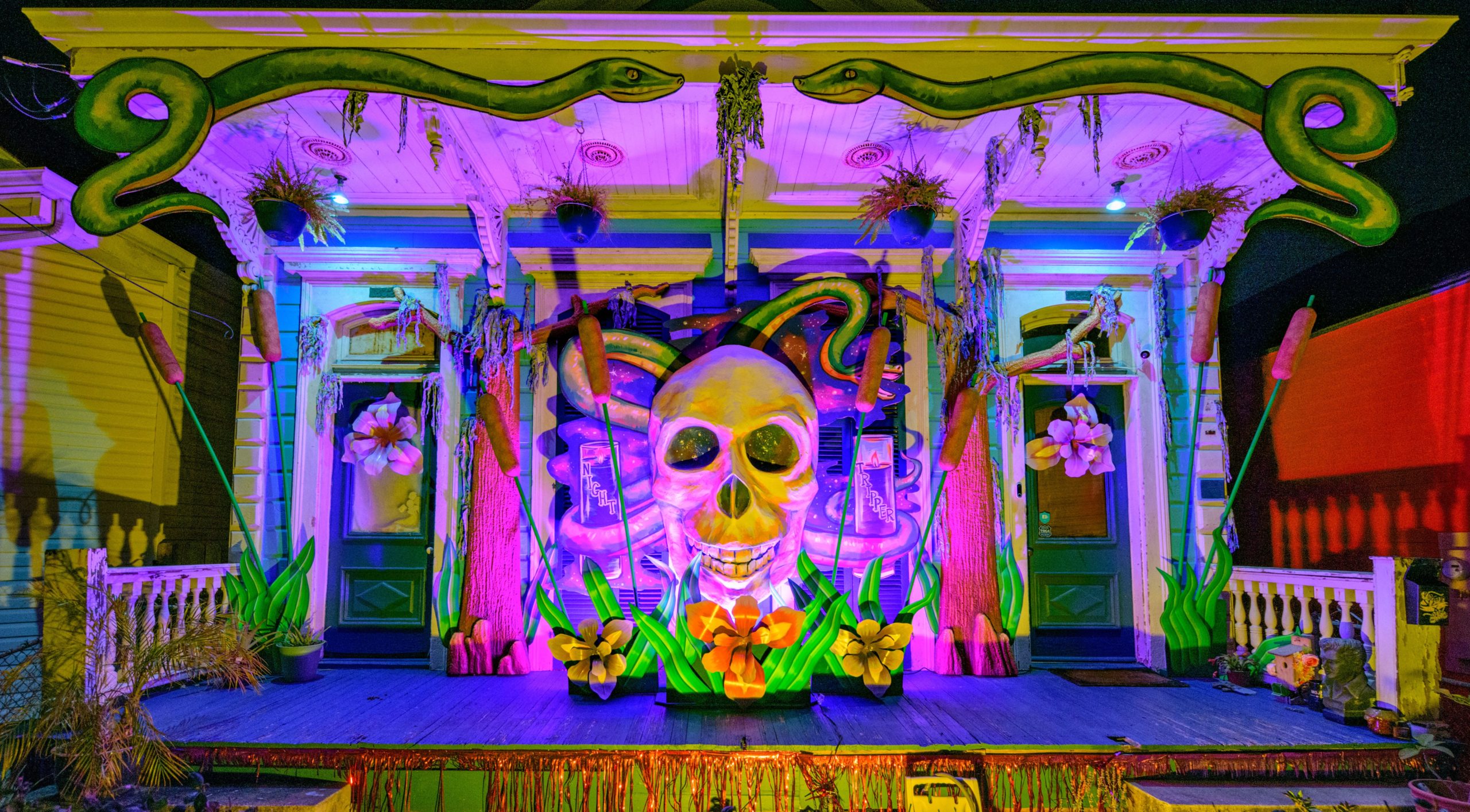 People pose for photos at the Big Freedia Queen of Bounce House, the home of Sarena Tang at 4321 Laurel St. in New Orleans. The porch decorations were created by the Stronghold Studios, a New Orleans entertainment display and prop company. Photo by Matthew Hinton