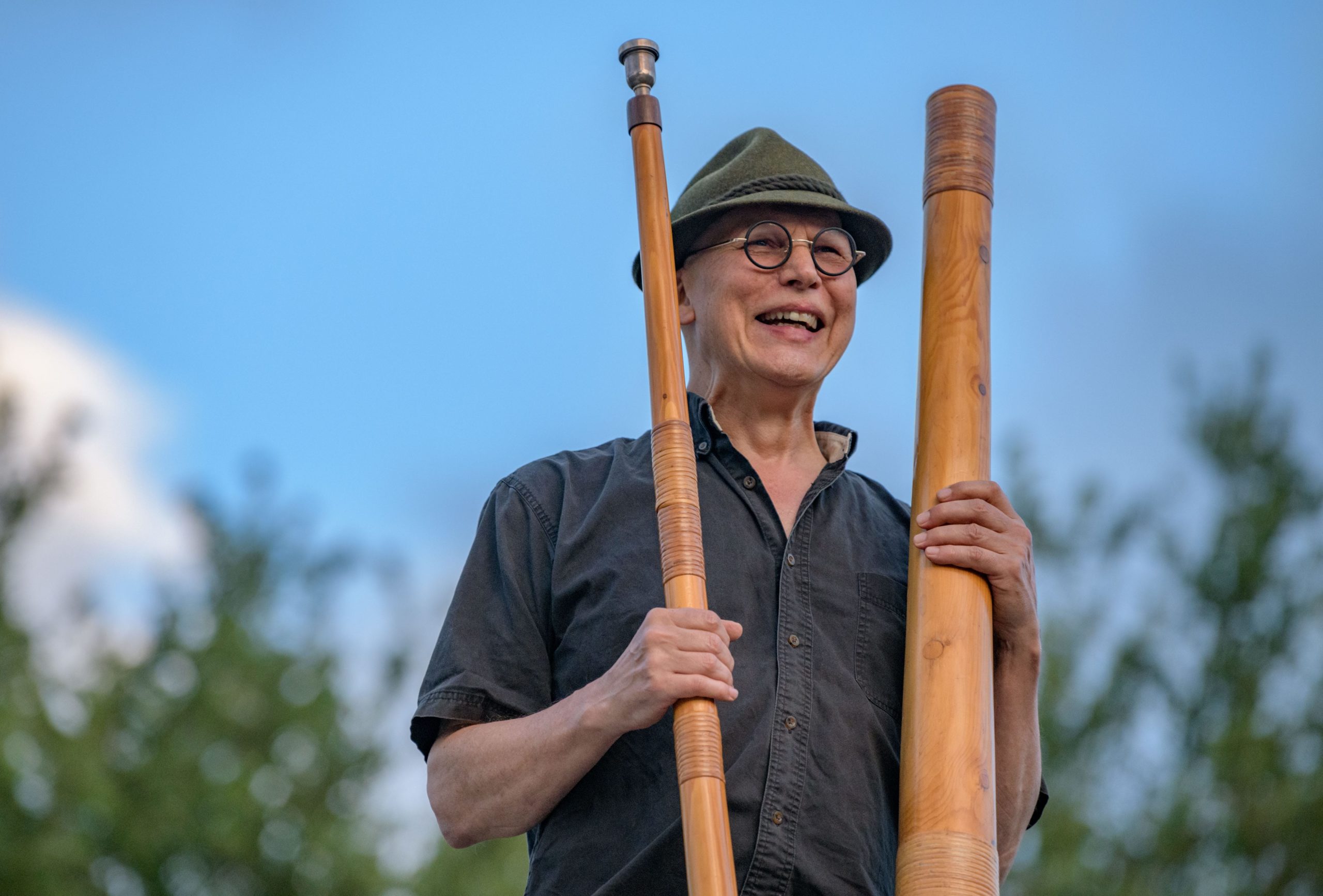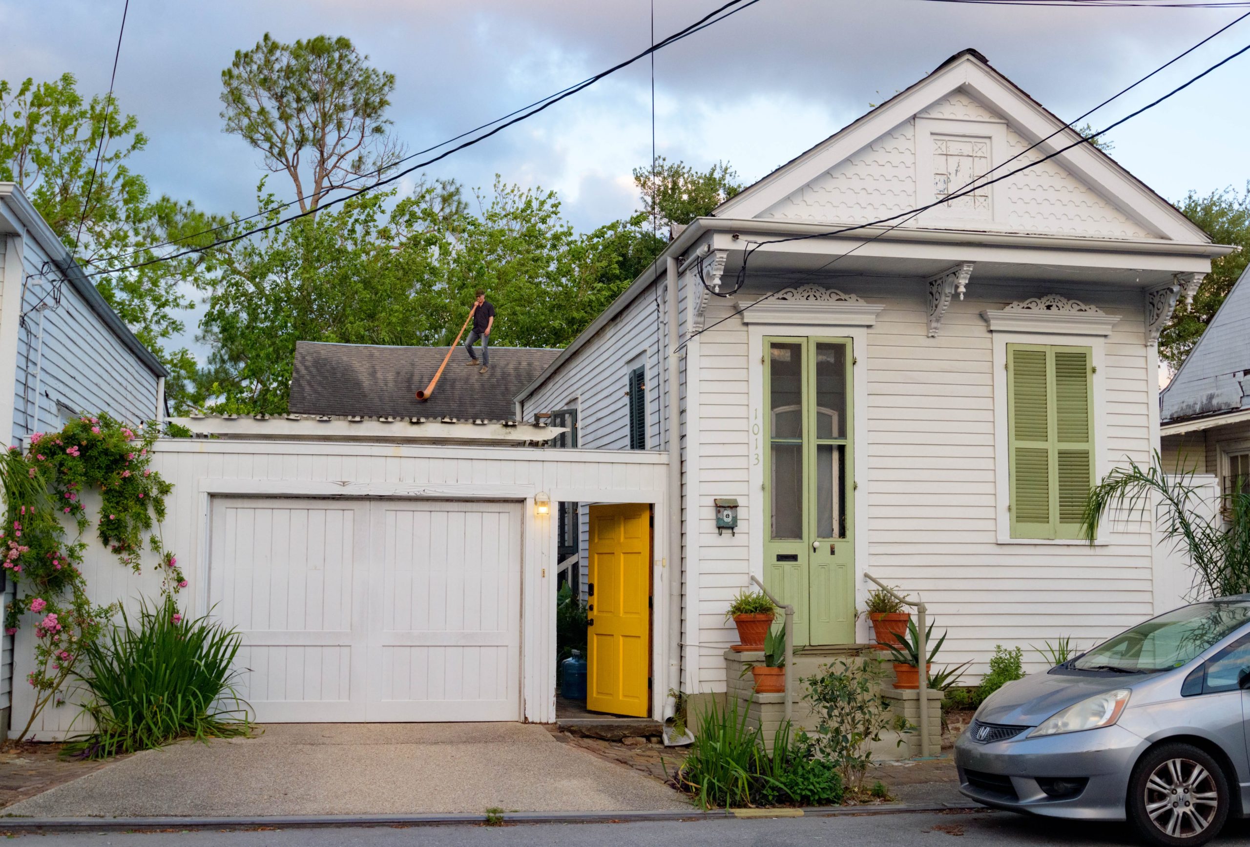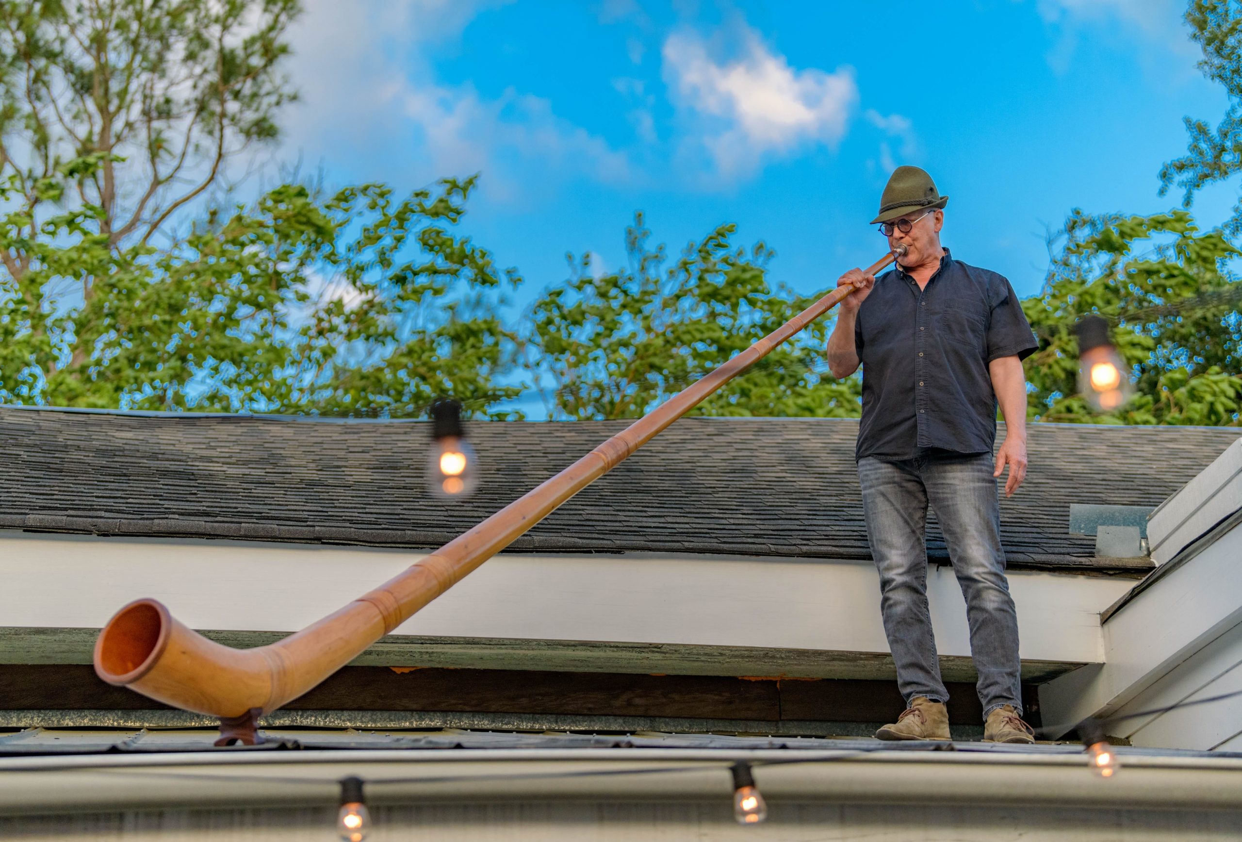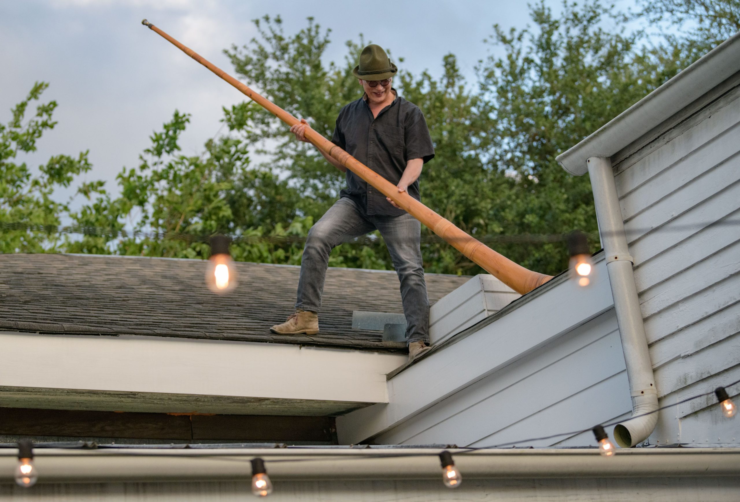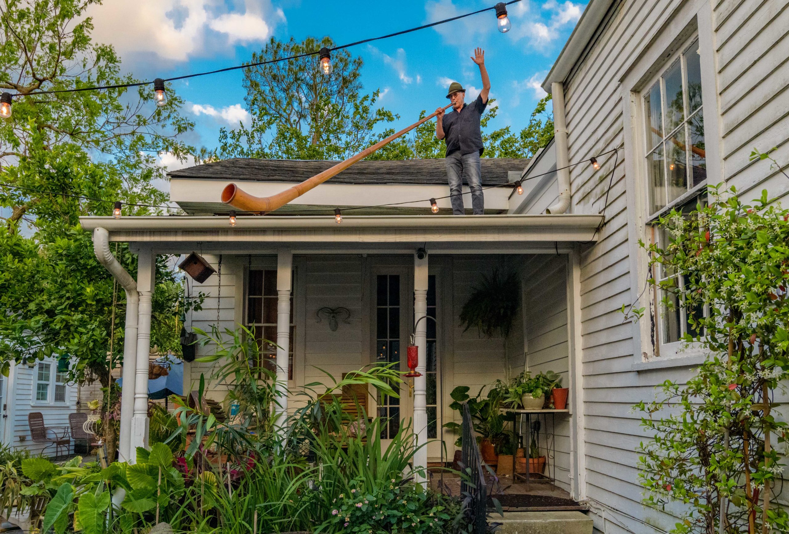 McGrain has occasionally climbed on the roof of his porch to play for neighbors in the Faubourg Marigny in New Orleans like he did Tuesday, March 31, 2020. McGrain got the alphorn that was originally destined for the Boston Symphony orchestra that ordered three from Switzerland. But this horn didn’t match the other two sonically so they built a fourth one and McGrain acquired this one. McGrain says the alphorn is like playing a trombone in 6th position in the key F. The alphorn, named after the Swiss Alps, is 14 feet long and is made from a spruce tree that grows on the side of mountain and naturally bends as reaches toward the sun. McGrain also plays in a trio called Plunge with bassist James Singleton and tenor saxophonist Tom Fitzpatrick.