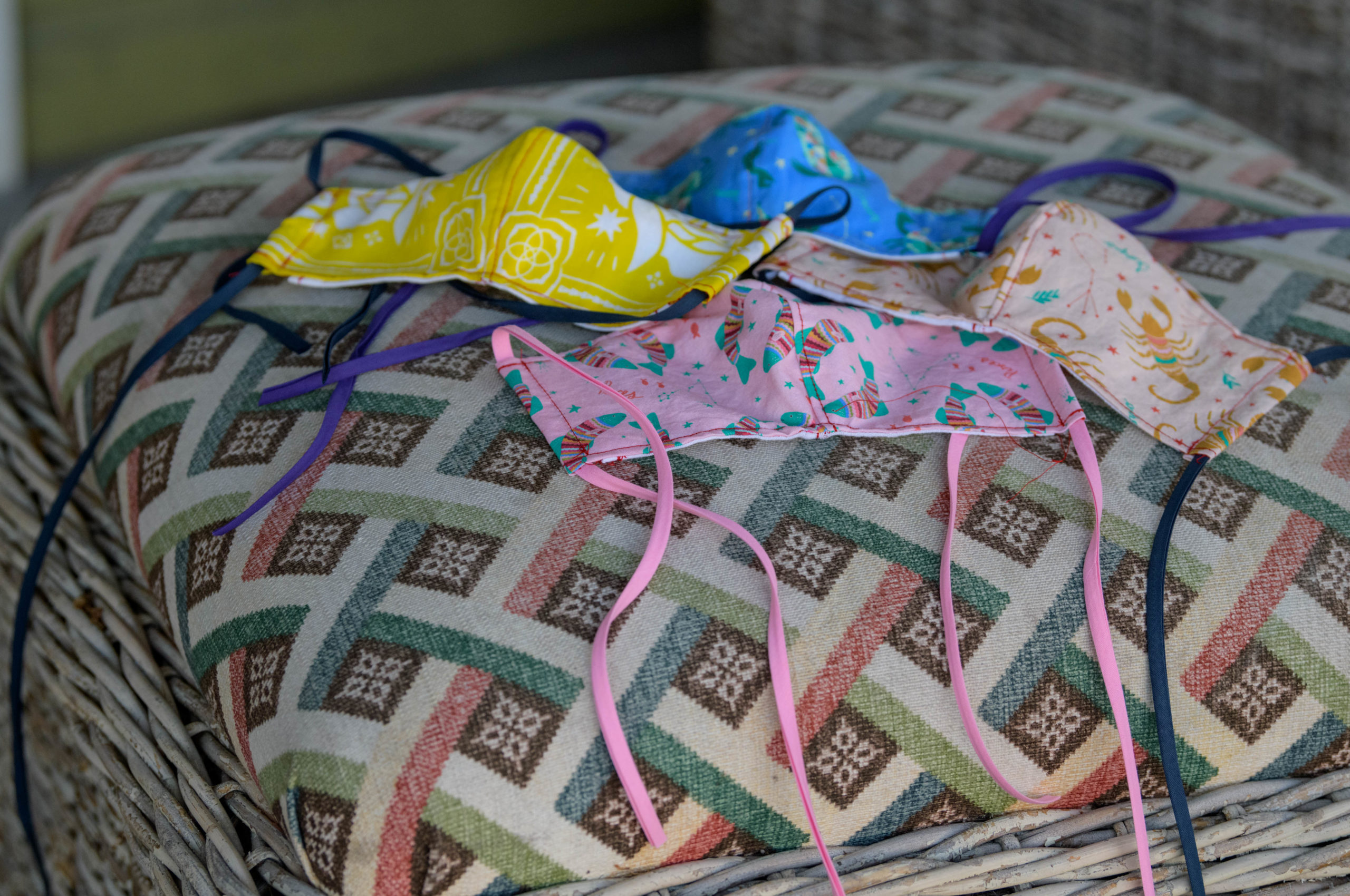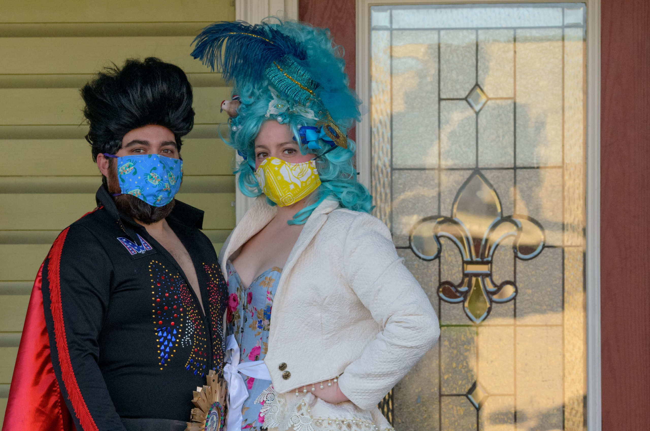 Caroline Parrone, right, of the Merry Antoinettes Walking Krewe / Pleasure Club and her husband, Ben Maddocks, with the Krewe of Rolling Elvi are both working as essential employees during the coronavirus pandemic but are also using their free time to help out by making masks for people who have to work.