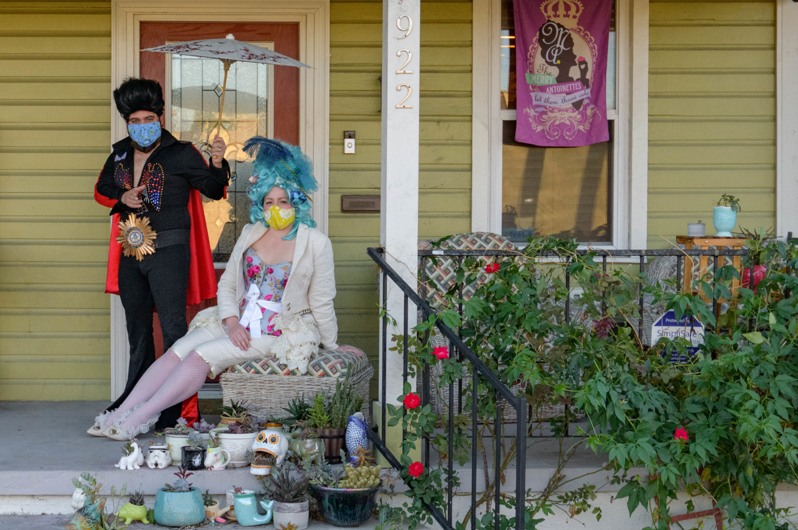 Caroline Parrone, right, of the Merry Antoinettes walking Krewe / Pleasure Club and her husband, Ben Maddocks, with the Krewe of Rolling Elvi are both working as essential employees during the coronavirus pandemic but are also using their free time to help out by making masks for people who have to work. Photo taken in New Orleans, Wednesday, April 1, 2020, by Matthew Hinton