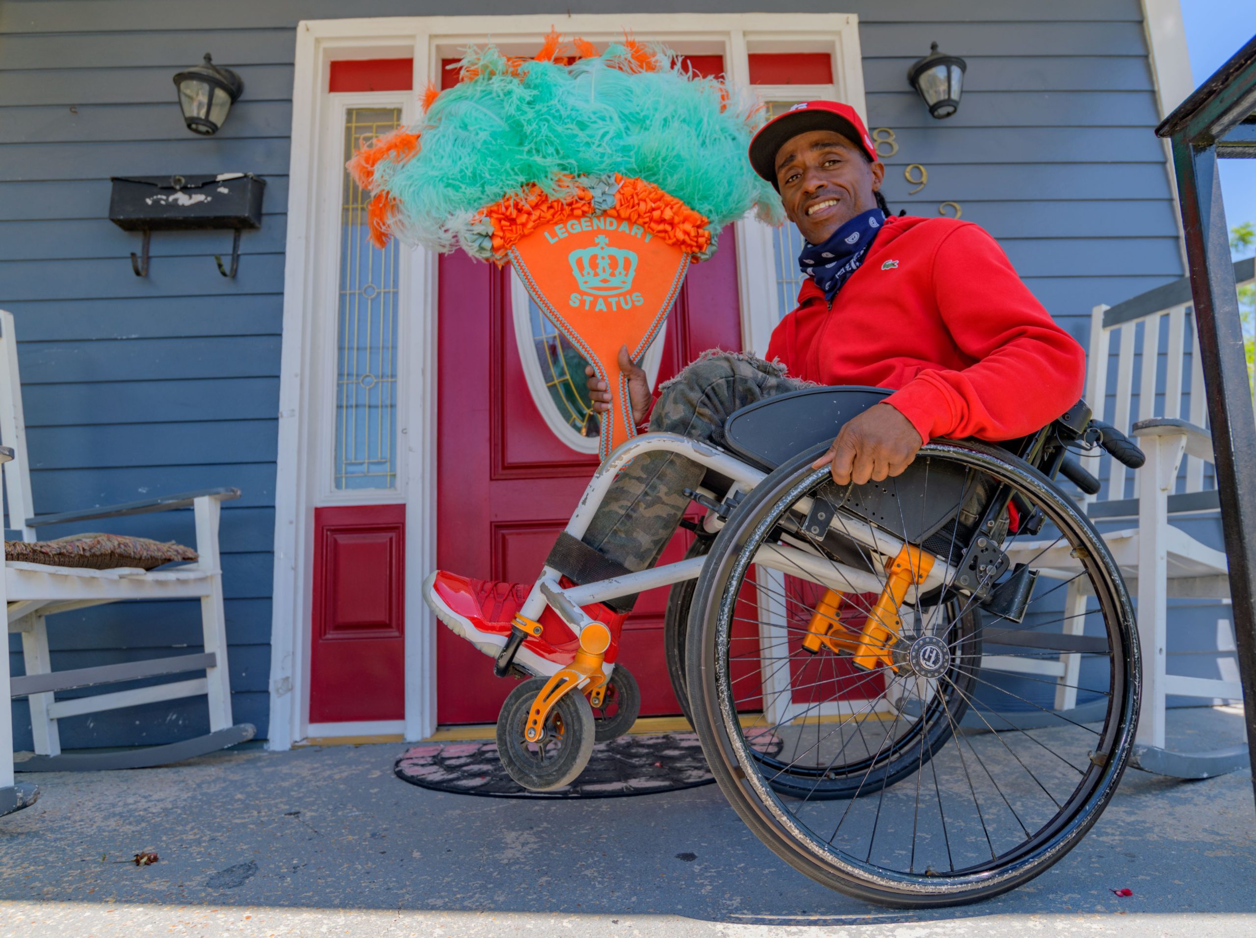 Rollin’ Joe Henry, President of Original Pigeon Town Steppers Social Aid and Pleasure Club, and a member of the Greater New Orleans Wheelchair Athletic Association “Rollin’ Pelicans” would normally be out playing or parading on Easter Sunday or during Jazz Fest. But he is staying at home with family in the 17th ward in Hollygrove and Pigeon Town neighborhoods of New Orleans. The last time the club didn’t parade was after Katrina and Rollin’ Joe hopes the first second line after the pandemic will be similar to the Renew Allstar second line where over thirty S&P clubs and multiple brass bands paraded in January 2006 many months after the federal levee failures from Hurricane Katrina on August 29, 2005. The Steppers were founded in 1994 as part of a resurgence of Social and Pleasure Clubs in the 1980s and 1990s coinciding with the resurgence of brass bands like the Rebirth Brass Band and the Hot 8 Brass Band. The S&P clubs owe their origins to benevolent aid organizations from the 1800s that would offer insurance, legal assistance, and pay for funerals including ‘jazz funerals’ for African-Americans and other minority groups. The societies nearly fizzled out after desegregation and competition with traditional insurance companies in the 1970s. The elaborate costumes are said to have come from competition among benevolent societies to see who could send off their members in the best style possible during a traditional ‘jazz’ funeral that actually predates jazz music.