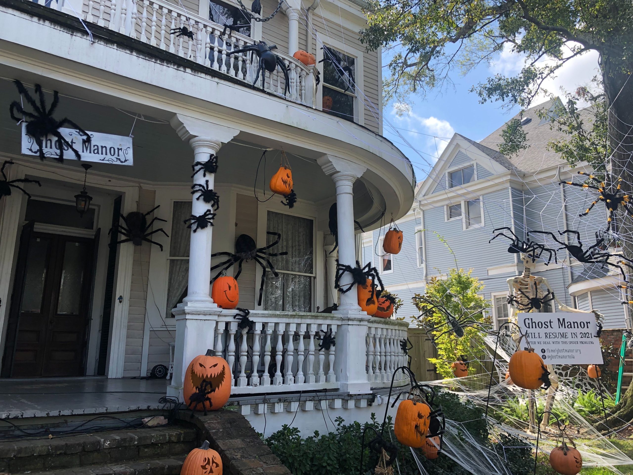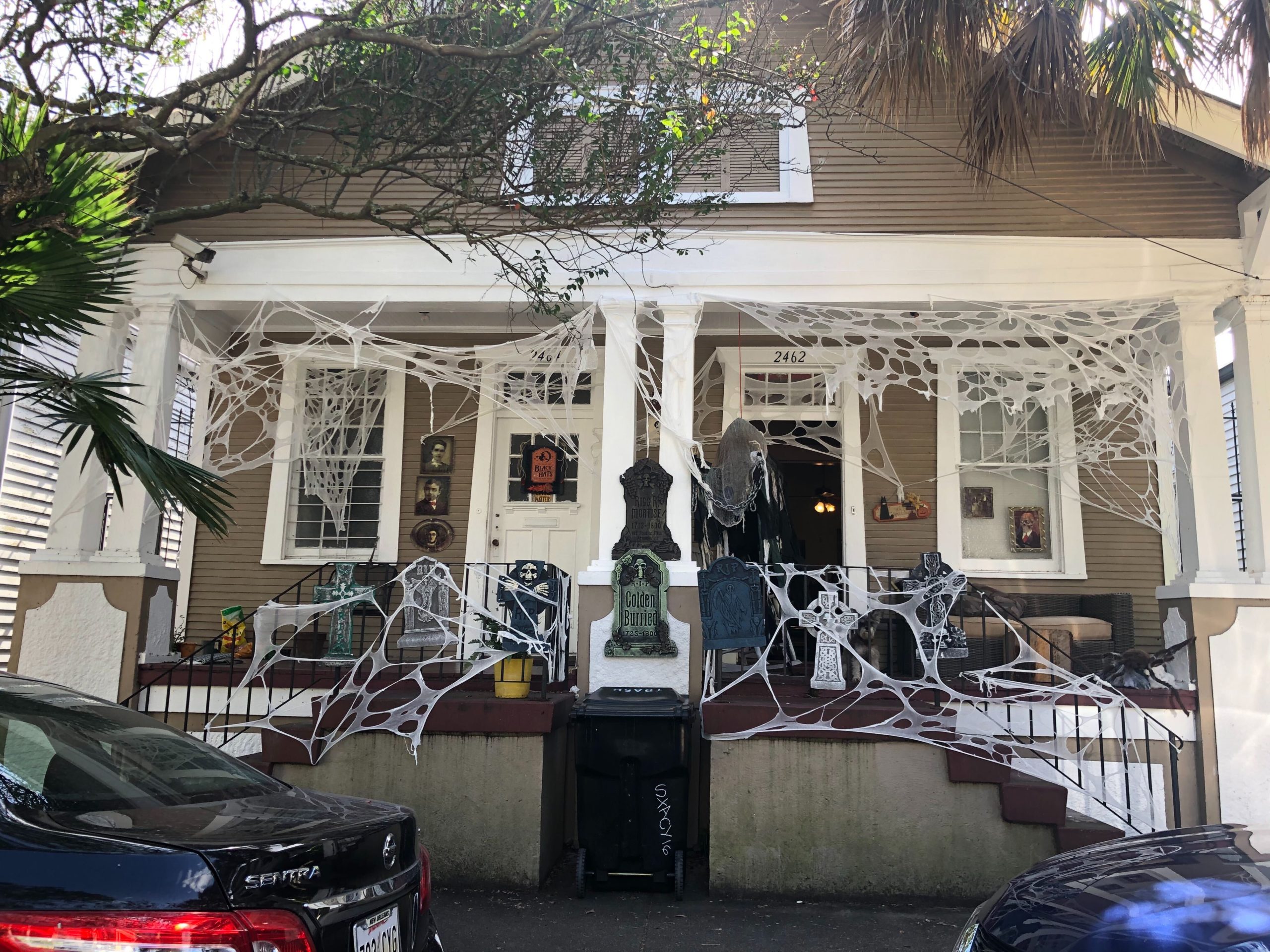 Nothing can top the spectacle of spectres and serial killers on the front of your porch like the macabre masks from Party City. Just look at those pics above from Hillbilly Hollow and the webbing from another home in the Bywater. These simple yet AWESOME skeletons and zombie-fied porches can be created by masks from Party City. The scariest part? Well, there isn’t one in Orleans Parish so you’ll have to have a sojourn in the Jefferson Parish for your paranormal purchasing. But after you grab your webs, masks and hit up Goodwill to give your cadavers the appropriate attire, you’ll have passersby stop with fright and fun and be the talk the block!