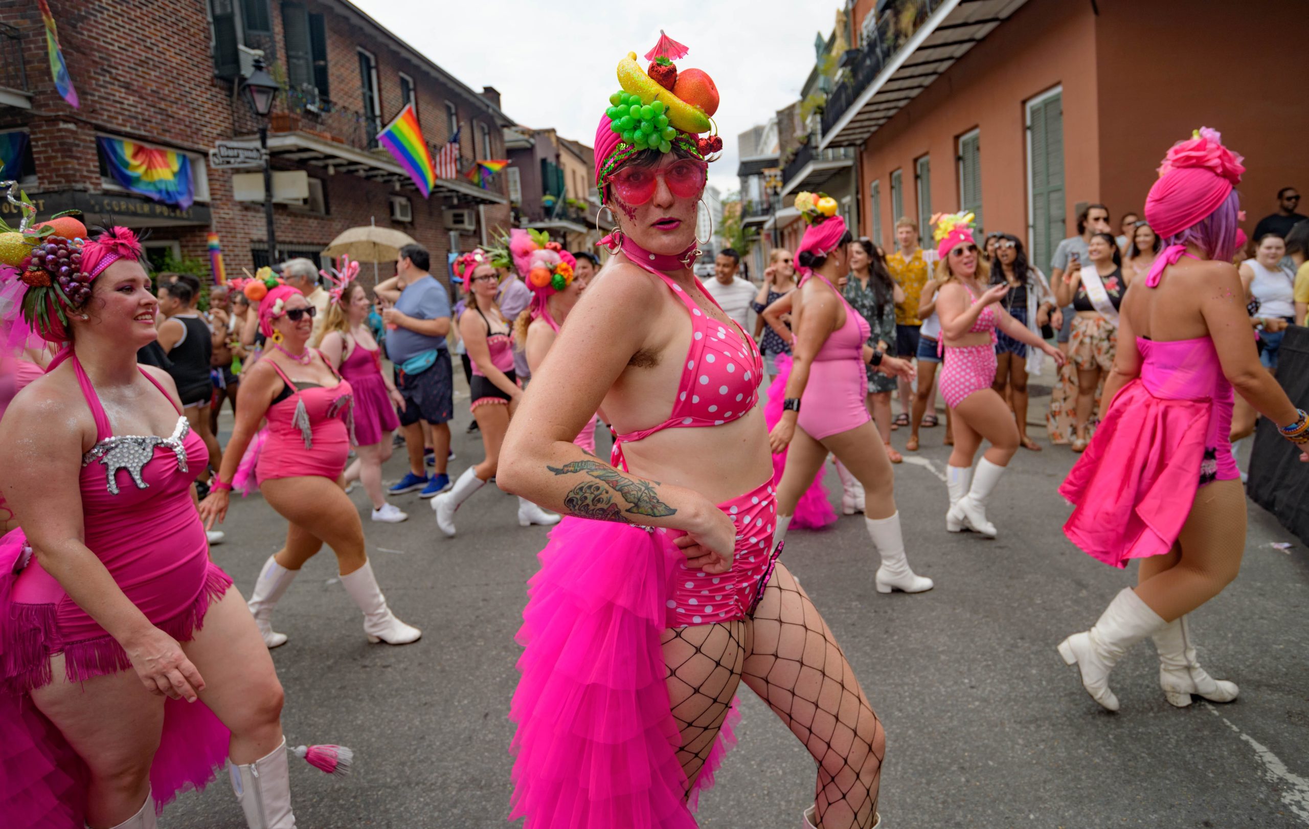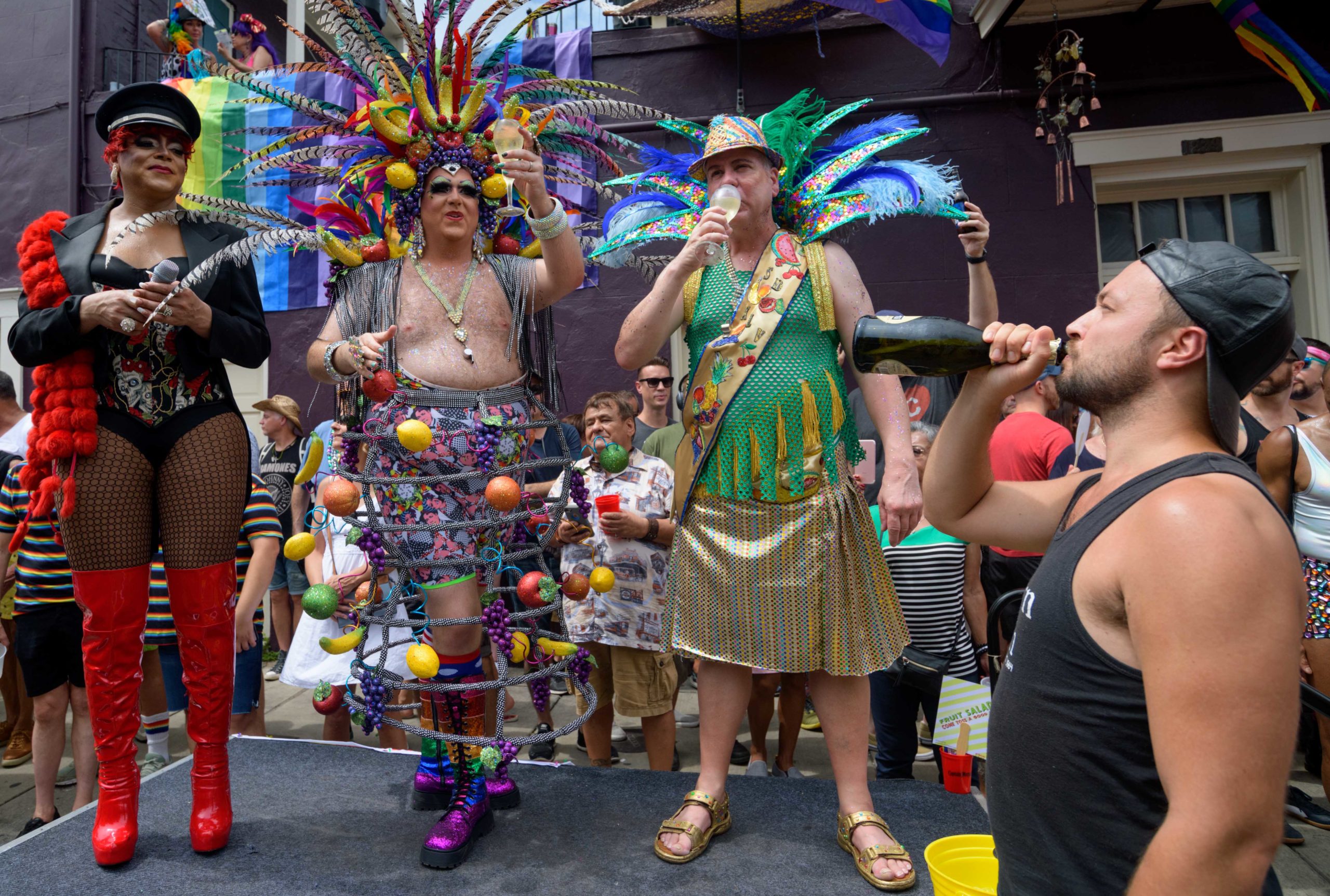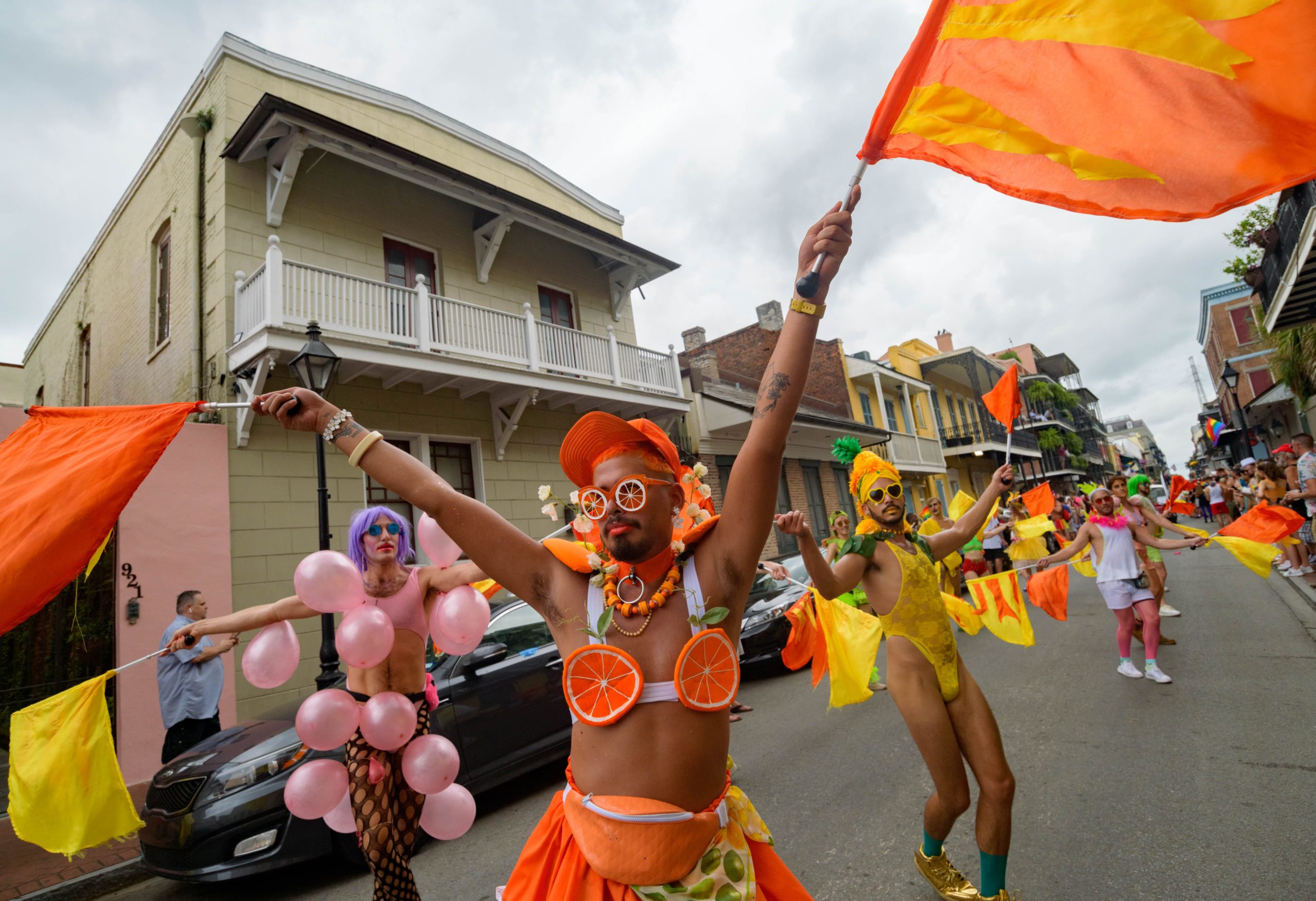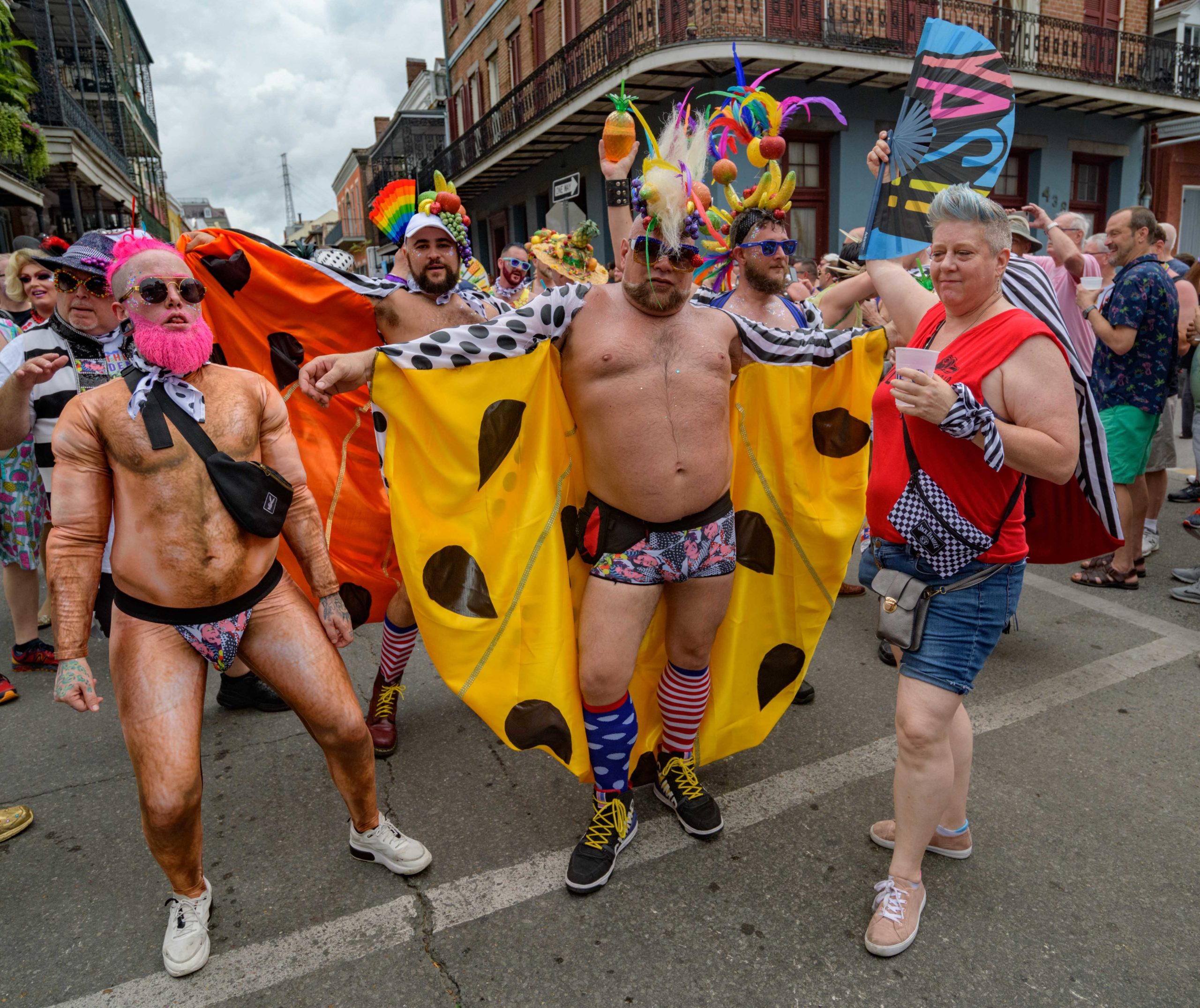 The 44th Southern Decadence Walking Parade with the 45th Grand Marshals of Southern Decadence XLV, Countess C. Alice and Will Antill, travels through the French Quarter Sunday, September 1, 2019, during the largest LGBTQ+ event in New Orleans with an estimated 250,000 visitors in 2018 over the Labor Day Weekend. The official colors of this year are polka dots and pinstripes because Grand Marshal Will Antill has color blindness. The theme this is year ‘Fruit Salad: Come Toss A Good Time’ and the theme song is ‘Push Groove’ by Instamatic, a mash-up of Salt N’ Pepa’s ‘Push It’ vs Dee-Lite’s ‘Groove Is In The Heart.’ The event is part of the 48th Decadence celebration. There was no parade the first year in 1972 when it was just a small house party in Treme, and none during Hurricane Katrina in 2005, Hurricane Gustav in 2008, and Hurricane Isaac in 2012. Photo by Matthew Hinton