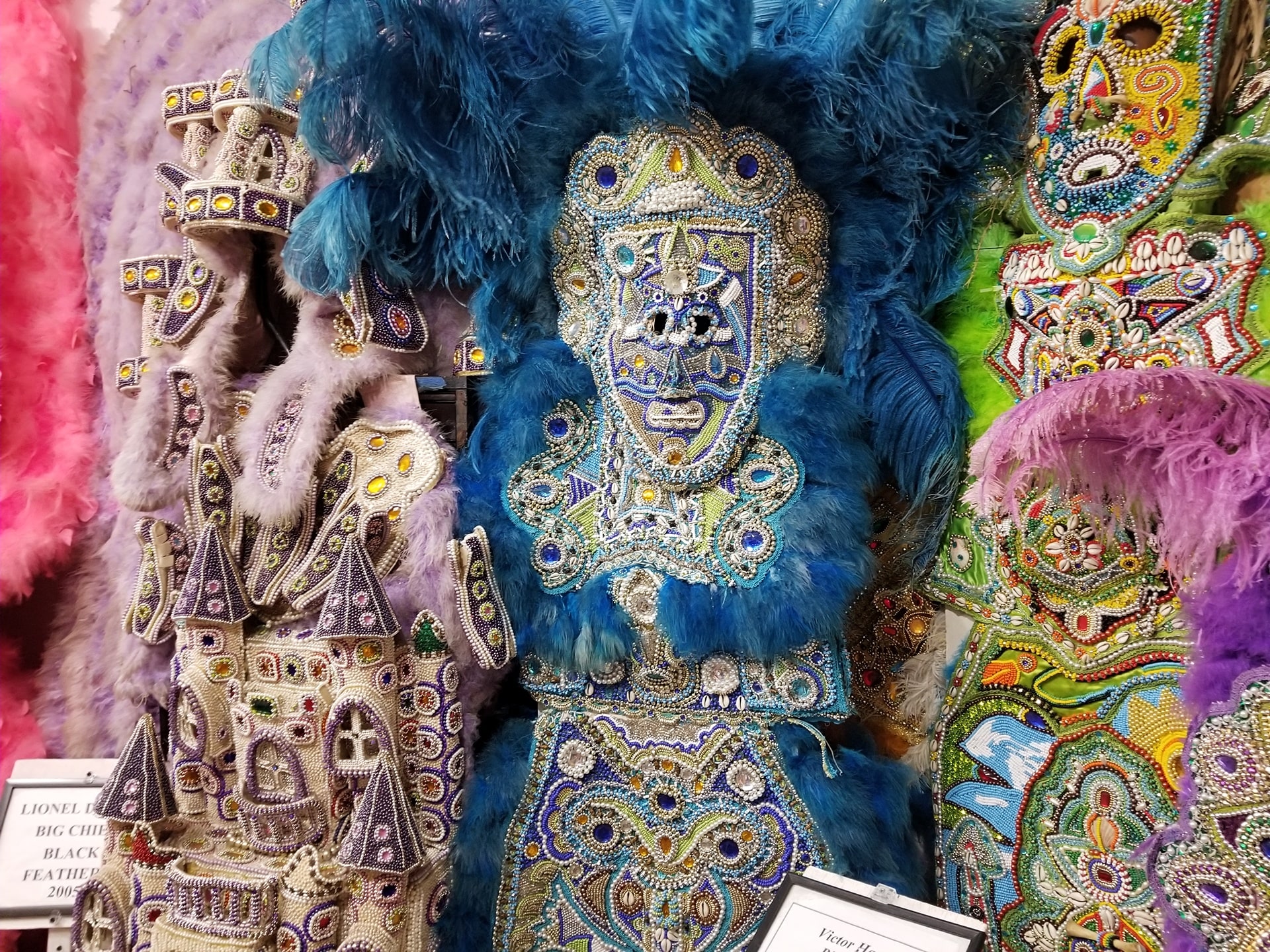 The suits on display take a year to sew and construct by hand and are worn only three official times during the Carnival season: Mardi Gras Day, Super Sunday and St. Joseph’s Day. The suits are never worn for more than one season, and a new one is designed and sewn every year. These elaborate costumes can take 6 to 9 months and thousands of dollars to construct.