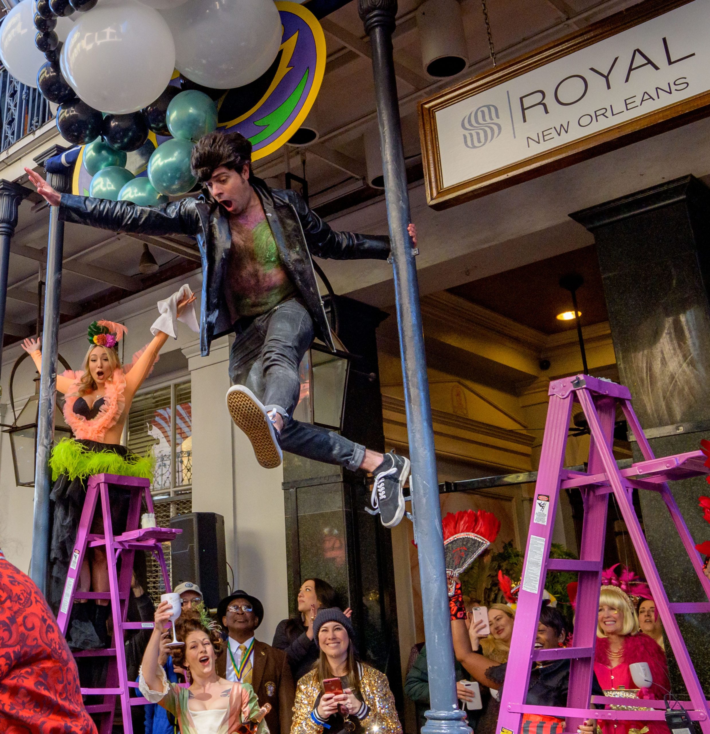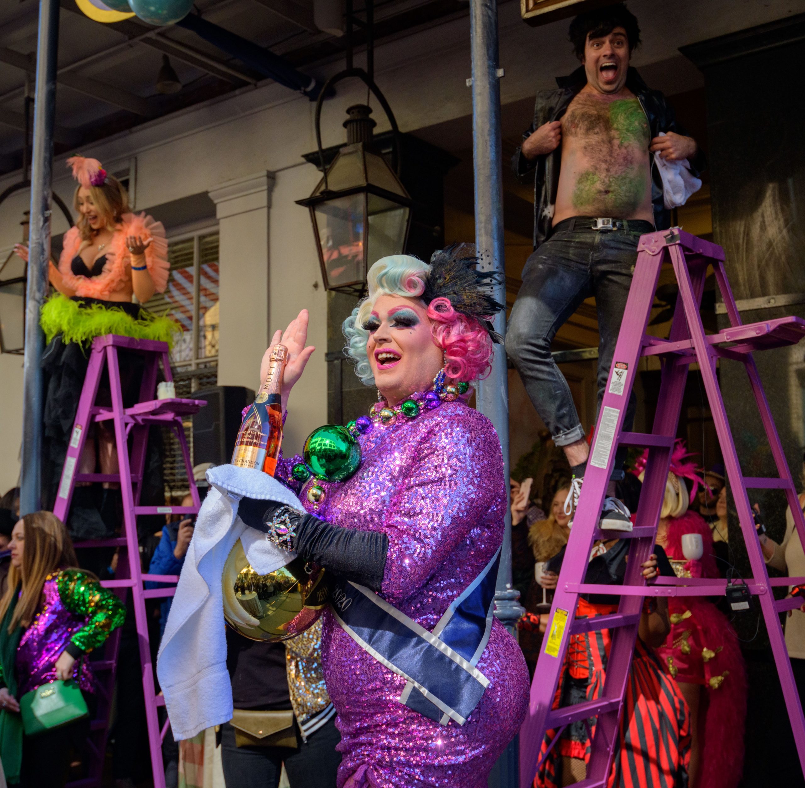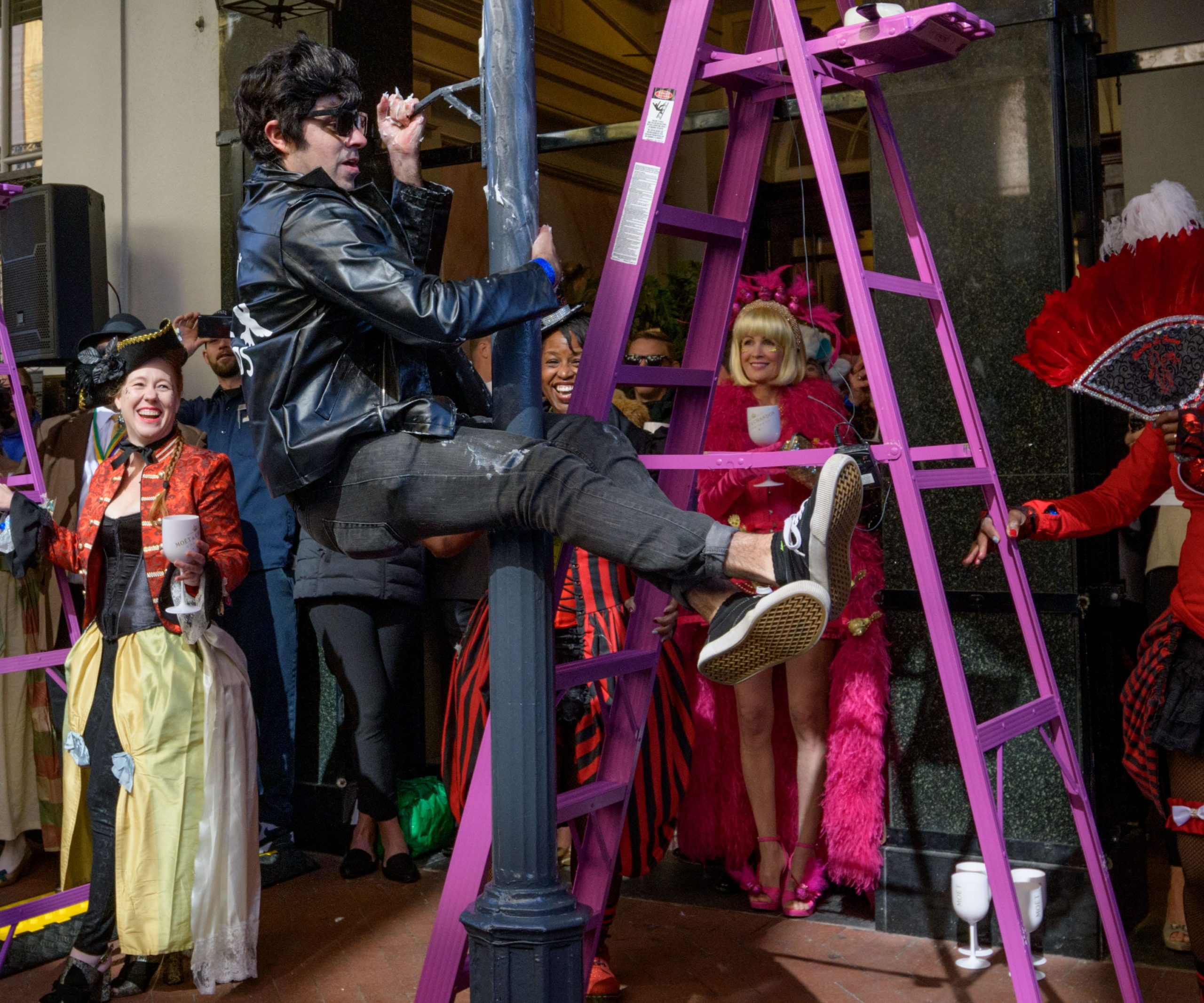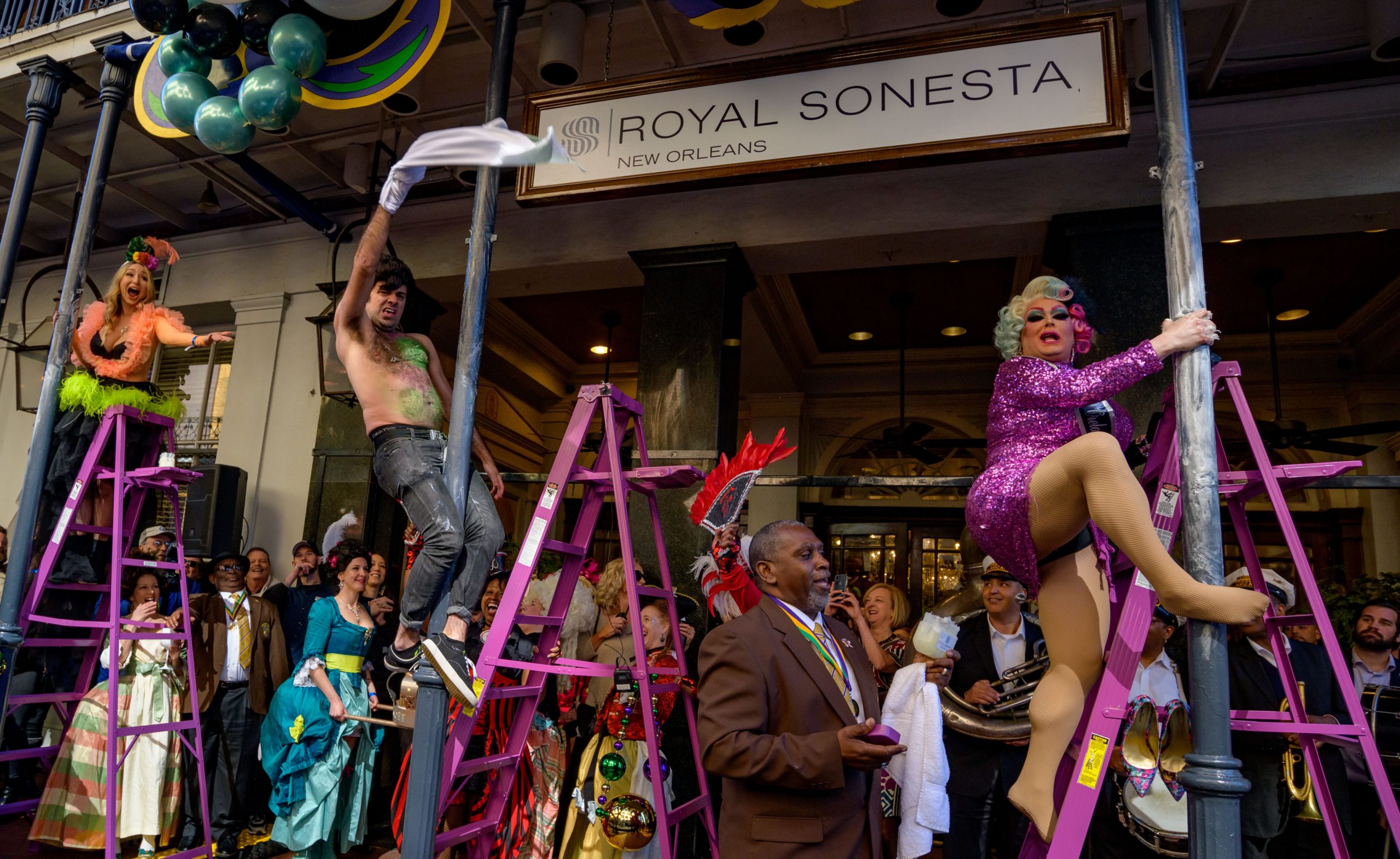 The tradition of greasing down poles at the Royal Sonesta Hotel in the French Quarter to keep parade-goers from shimmying up hotel balconies turns 50 this year. Known as the official kick off to Mardi Gras weekend, this event featured actor Bryan Batt as host and included appearances by Kenny Lopez from News with a Twist, who won this year, last year’s winner Desiree Ontiveros of Bad Ass Balloons wearing “Bitch Please” eyelashes, Miss New Orleans Pride 2020 Lana O’Day in shiny purple dress, Reagan Charleston Thomas of Southern Charm New Orleans, musician Amanda Shaw dressed as Charlie Chaplin’s Tramp, and renowned Big Easy burlesque dancer and performer, Trixie Minx. Leroy Jones and the Original Hurricane Brass Band entertained the crowd with special guests from the Merry Antoinettes, the Mystic Krewe of Femme Fatale, the Krewe of NOMTOC (New Orleans’ Most Talked Of Club) and the Krewe of Cork. Photo by Matthew Hinton